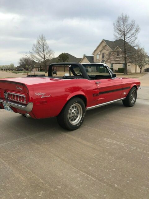 I am selling my 1968 Mustang GT/CS Convertible. It comes equipped with a 302 4 Barrel V8.C4 Automatic with 3.50 Limited slip 8" Rear endUnder 6k since engine rebuildNew Hi-torque starterNew Holley carbNew heater coreAir shocksComplete Rotisserie Restoration by LA Mustangs100 % RUST FREEShelby Wheels, Roll Bar, Rear Spoiler, Side Scoops, Tail LightsThis CALIFORNIA SPECIAL was purchased 9 years ago, as I am not the original owner nor did I restore this car. I was told by my local Ford dealership that over 50 YEARS ago when these cars were being built in CALIFORNIA that people special ordered convertible cars for the use of carrying surf boards to the beach (hence the roll bar). My wife is from California and says that's how she saw people carry surf boards, standing up against the roll bar. Anyhow, the dealer said that most all MUSTANGS were already labeled as COUPES and were pulled off the assembly line and sent to an area to be made into convertibles. I have owned over 20 MUSTANGS in my lifetime and I am also a Licensed A&P Aircraft Sheetmetal Specialist for the Air Force. In my opinion, the fit and finish on the car reflect factory workmanship. The VIN number I listed is on the dash as well as the door and the two numbers match. The car has been constantly garaged and never rained on. There are no issues with the black soft top that has a boot cover. It also has nice custom mats front and back. I do not have a Marti Report. I have entered the car in several car shows and she has won numerous trophies. The color is Ferrari Red and is a real head turner. The car is not without some minor issues. The speedometer is a few mph slow and the gas gauge is not reading accurate. We have enjoyed this SPECIAL car and you will too.Please inquire if you have questions. Buyer is responsible for all transportation after end of auction and is being sold "as is". There is no warranty with the car. $1000.00 Deposit due within 48 hours of end of auction.