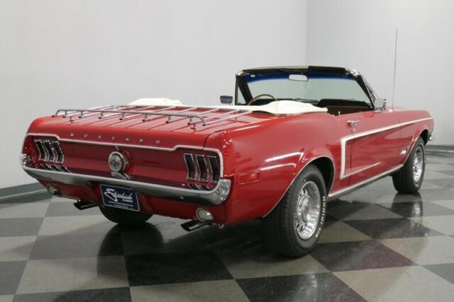 You've always wanted a Mustang, but by the time you were old enough to afford one, they were all priced out of reach. Well, guess again, because this bright red V8-powered 1968 Mustang convertible hits all the right notes with a surprisingly reasonable bottom line. a strong-running 302 V8 and featuring an array of great option, this original S-code droptop is a slick Pony that's an absolute blast to drive. You don't need a big... block or fake GT350 stripes to have a lot of fun in a Mustang ragtop. The fire-breathing V8 muscle that we expect today is a legend created by a select few, while a great majority of Mustang buyers were perfectly content to motor around in cars just like this one, and the 302 is plenty potent, don't worry about that. With a shade of paint that's very close to Candyapple Red, it sure looks the part of first-class summertime fun, but it hasn't been over-restored, modified, or converted to some kind of tribute to something it never was in the first place. The bodywork is quite straight, and it sure looks like this car has lived all its life without experiencing the misery of winter weather, and while the paint isn't perfect (but what in this world actually is?), you'll enjoy putting a coat of wax on it next Saturday. A white C-stripe, Gt-style fog lights, and a luggage rack on the deck lid all work to provide a little further character to the presentation, and you'll also be pleased to show this one off, because the chrome is good, all the badges are intact, and the grille is excellent, so the only thing left to do is flick the key and go for a cruise. Inside, the beautiful Parchment interior looks quite correct and is in great condition, and you'll appreciate it the moment you put the top down in the sun. The pleated seats look like they have been cared for since they were restored, and the aftermarket middle console is a bit taller than what you'd expect inside the cabin, but it provides added storage room and a couple of very convenient cup holders. Despite being one of the most accessory-friendly cars of all time, the interior is remarkably stock, including some very nice door panels, recent black carpets, and a very cool wood-trimmed steering wheel that looks like it belongs in a much more expensive car, and matches the wood applique on the dash and door panels. Even the non-GT models got a pretty complete array of gauges, all of which are in original condition with clear lenses and bright markings. R134a A/C is arguably the best option of all and the stereo is amazingly still the original Philco, although it is due for an upgrade. A trim-fitting white power convertible top fits neatly under a matching parchment boot, making this a handsome car, top up or top down. This Mustang is an original S-Code car, which means it was born with a 390 V8, but at some point in its life it was swapped out for the more manageable and common 302 V8. For years, the 302, AKA the 5.0, has been a mainstay of Mustang performance. This same engine worked well in late-model Mustangs, and with a 4-barrel carburetor and stock intake manifold, it's peppy around town with a nice grumble to the Magnaflow dual exhaust. It has been recently dressed up with Ford Blue valve covers and snorkeled air cleaner, plus Ford Blue paint on the block to finish the period look. There's a sizeable radiator up front and power brakes and power steering makes it easy to handle around town. Even more important is the tidy chassis, which includes signs of regular maintenance and coilovers in the rear, so it feels quite tight. The C4 3-speed automatic transmission feeds a set of highway-friendly gears, and with a small block V8 up front, the ride is comfortable and braking secure. Beautiful styled GT wheels are framed by a set of 215/70/15 BFGoodrich T/A white-letter radials that have a lot of life left in them. Documented with maintenance records and a Deluxe Marti Report, you too can find out what early Mustang owners already knew: the 1968 convertible is a great choice. Call today!