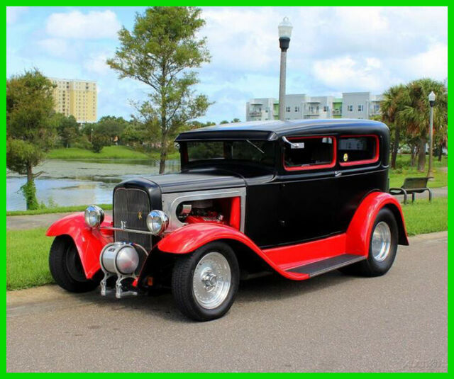 1930 Ford Tudor Custom Street Rod for Sale. This two-tone Hot Rod Sedan finished in Satin Black and Gloss Red simply has the look Rodders like. A chopped top sitting low in the front with narrow tires and big tire rear giving it a mean, aggressive stance. a 350 Cu In V8 with aluminum intake, dual feed 4 barrel carb, Mallory Ignition, headers, billet pulleys, and an engine dress up kit with Brodix Valve Covers. Key equipment on this Rod is rack and pinion steering, front disc brakes, automatic transmission with Lokar styled shifter and vintage air conditioning. A steel body with fiberglass fenders and running boards. The interior is finished with cloth bucket seats, tilt steering column, AR Steering Wheel, and Dolphin Gauges. An overhead console holds a Pioneer stereo and power window switches. A handy storage area behind the seats has additional speakers and a remote battery shut off switch. The exterior of this Show Ready Rod is greatly complemented by Centerline narrow Pie Cutter styled wheels on the front which carry BF Goodrich 155/80R 15's. The rear are deep reversed bolted to a narrowed 9 Ford rear end with coil overs and a pan hard bar. The rear Centerlines carry Hoosier Pro Street 31/18.5 15's. Features adding to the car's appeal are the Classic Moon Tank on the front of the car mounted using aluminum piston rods and twin tailpipes on the rear. A Unique Ride that is sure to grab everyone's attention wherever you cruise!