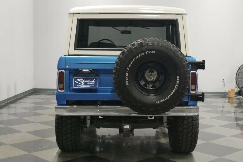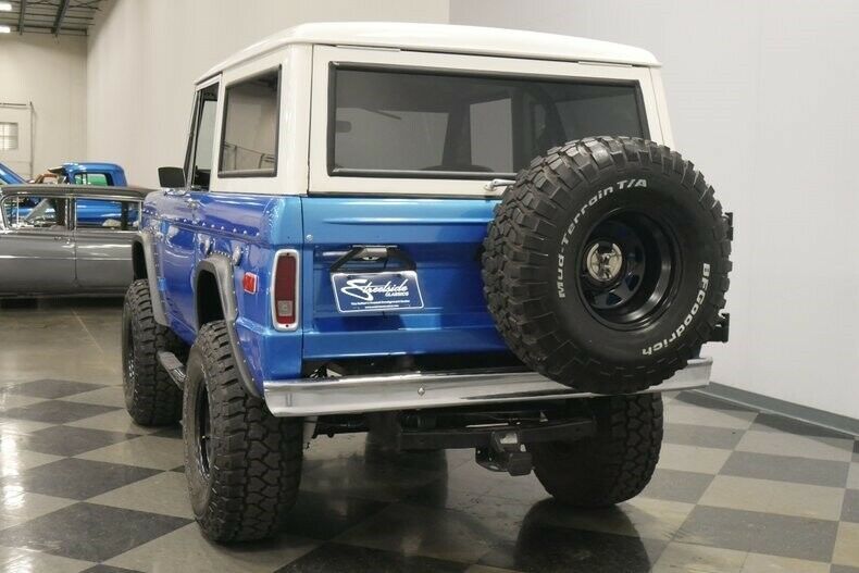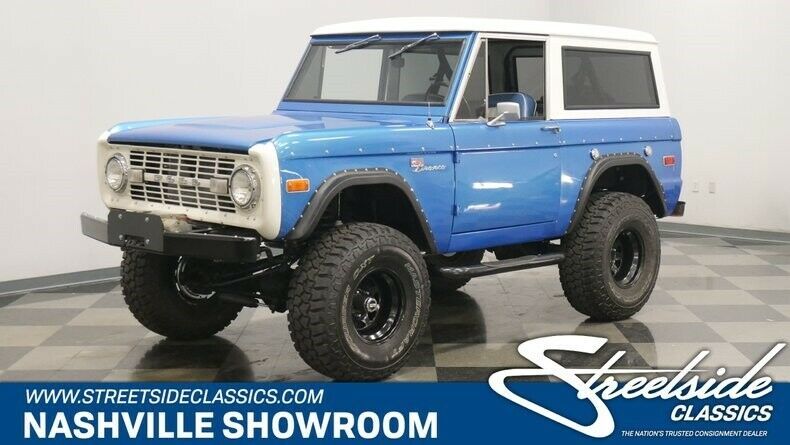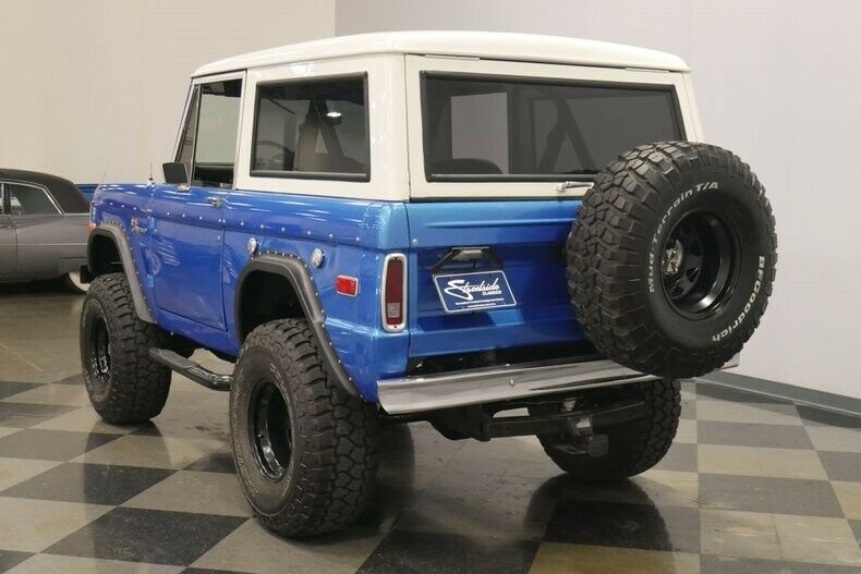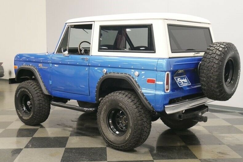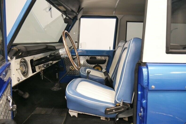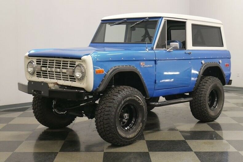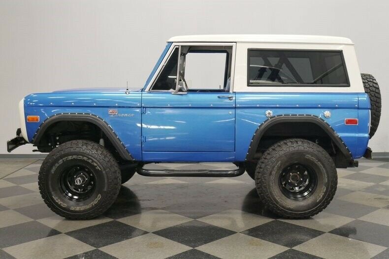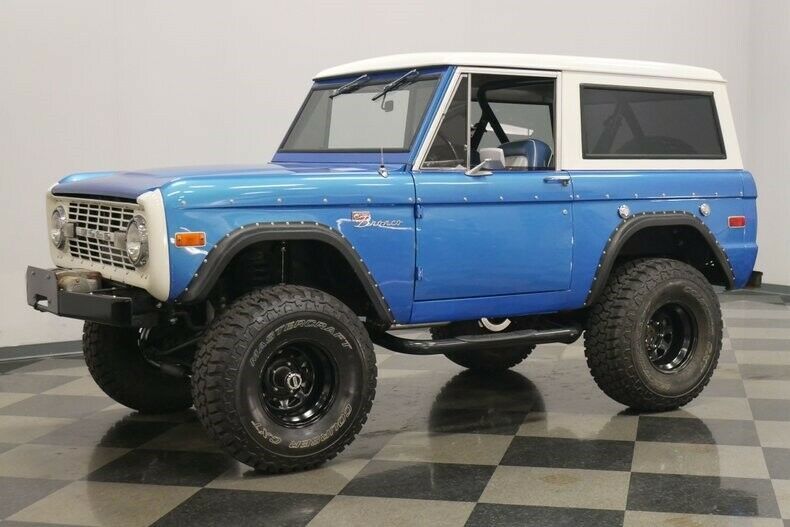 Take an extra-long look at this 1972 Ford Bronco Sport, because it's not just a cool/classic 4x4 with enhanced V8 power. As you look at all the details, you're going to see a well-done total package with features you rarely find on these first-gen Broncos. The Royal Blue paint instantly attracts you eye with its glossy modern shine. The white grille adds distinction, and with the white hardtop in place, you have the look of a well-done two-tone. But a Bronco is also about being a capable classic. And you see all the best parts for this done in black. It includes the upgraded bumper with integrated winch, Aries side step rails, flared fenders that allow for meatier tires, a swing-away rear mount for the full-size spare, tinted windows, and a proper trailer hitch. There's a Viper alarm and power locks, so you have the convenience of modern keyless entry on this classic Bronco. And when you open the door, it shows off a thoughtfully restored interior. The blue and white theme of the exterior continues on the door panels and dash. Plus, the custom two-tone seating looks terrific. So you'll happily remove the hardtop roof and show off this well-coordinated total package. There are nice comfort upgrades, like the Retrosound digital radio and modern speakers. There are also upgrades for ruggedness like the diamond plating in the side panels and a roll bar. There are even nice features just for the drive, like the B&M shifter and wood-rimmed sports steering wheel. Under the hood is Ford's mighty 302 cubic-inch V8. It inhales deeply with a four-barrel carburetor, and it exhales with authority as headers add power while contributing to the rumble of the dual exhaust. It's a strong-running total package, and that has a lot to do with plenty invested in new components, including the alternator, solenoid, MSD Street Fire plug wires, Proform HEI distributor, and an aluminum radiator. The lifted suspension and two-speed 4x4 transfer case make this a terrific off-roader. But there are also great in-town features, too, like the power steering and three-speed automatic transmission. Plus, you have a serious upgrade in stopping power thanks to a four-wheel power disc brakes that include a new booster, master, and calipers. This is a well-done Bronco that you'll love for its look, capability, and modern upgrades. So don't let this total package go into some else's driveway, call today! |