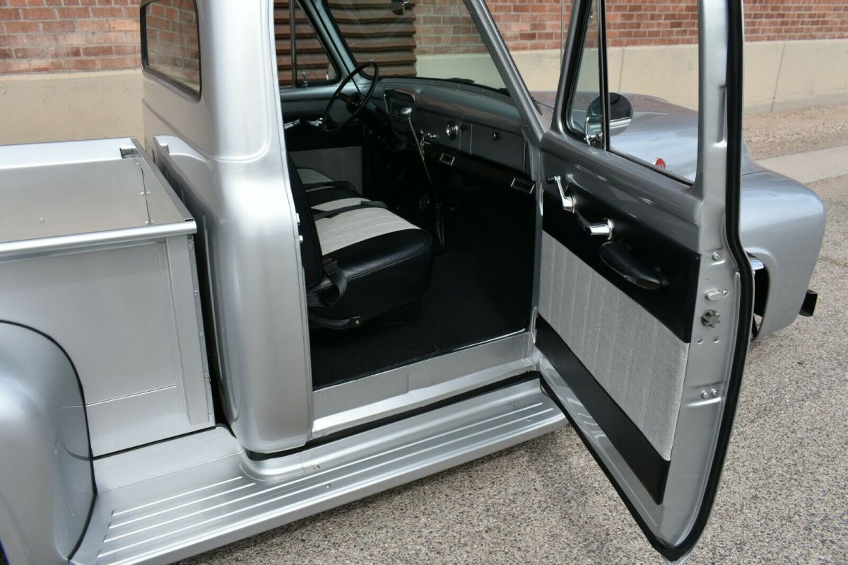 This is an exceptional frame-off total restoration of a 1955 ford custom cab f-100 pickup. A custom two stage professional paint job coupled with all new exterior trim and hardware. 1955 was the first-year ford introduced the custom cab option which added amenities including armrests, kick and door panels, headliner. This truck has been retro fitted with all the newer amenities to give the truck a new truck type feel. The F-100 has a Chevy small block 350 with a 700r4 transmission that has a mild cam and a 600 Edelbrock carburetor. For cooling and exhaust a aluminum radiator followed with stainless steel headers and custom exhaust with Magnaflow mufflers .The original chassis was replaced with a TCI Chassis with a parallel 4 link set up on a Ford 9" rear end. The suspension has Ridetech coil overs with Eibach springs that are fully adjustable with compression dampers and a close ratio mustang 2 rack with adjustable pressure valve. The chassis was all powder coated satin black with all new hardware and adjustable sway bars front and rear. CPP front disc brakes and drums in the rear with all hard-lined brake lines. The cab was completely sound deadened with a fresh interior that comes with a alpine head unit all Bluetooth and Sirius ready with Boston Acoustic speakers and below the seat a JL Sub. The truck comes with wheel Vintique artillery steel wheels and Ford beauty rings and caps with Nitto tires. This mind-blowing show build has under a thousand miles since completion and over 100k invested it is being listed for 65k which makes this truck a real steal.