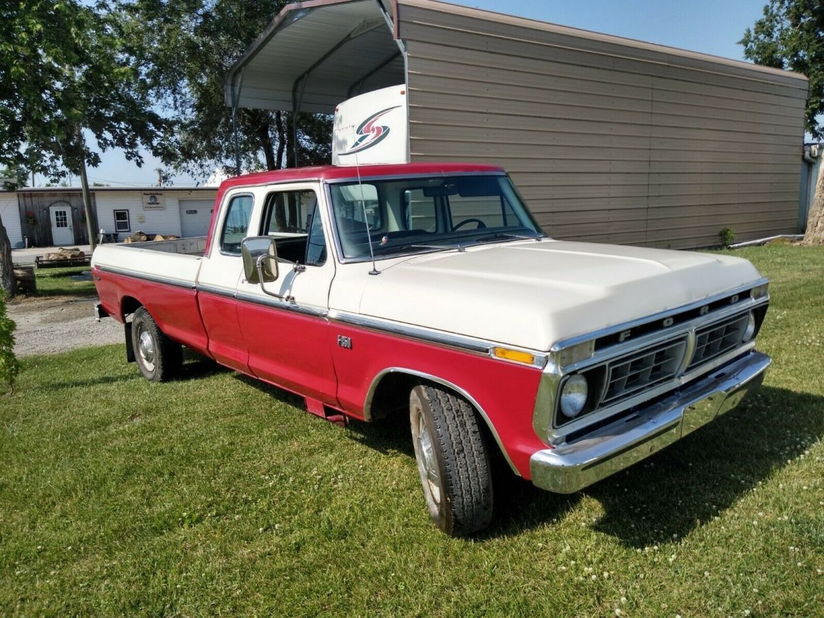 | 1976 Ford F-250 Super Cab pickup it has new candy apple red and ford whit, its a number matching truck,it has black interior with power steering, power breaks, air conditioning,(Works but leaks needs seals ) motor and transmission are sound very clean truck |