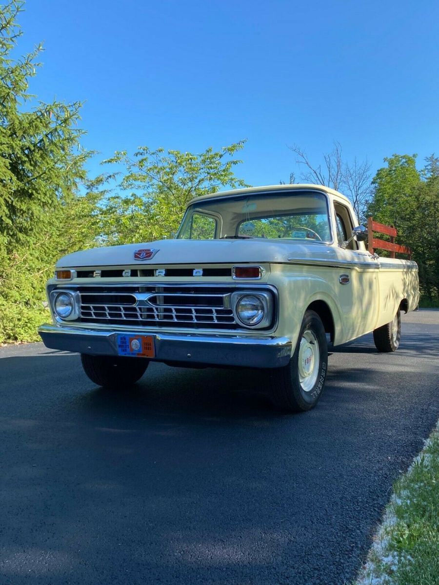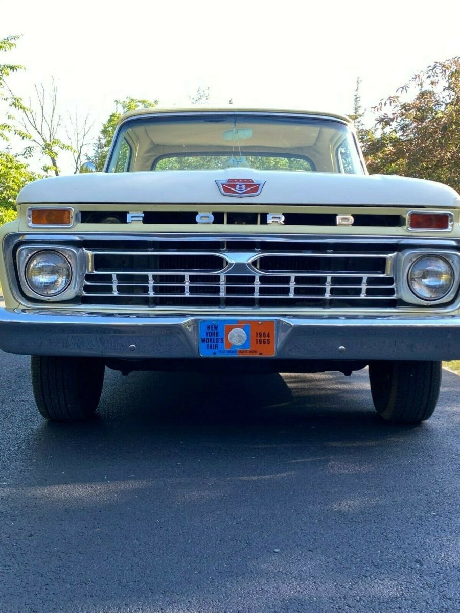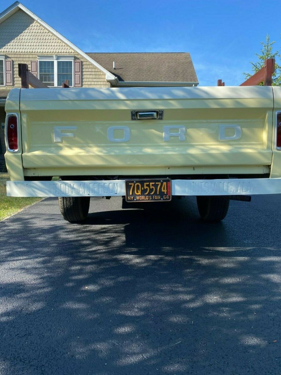 Beautiful 1965 Ford F 100 pick up Custom Cab for sale. Equipped with a 352 V8 engine. It has power steering and power brakes. The paint is excellent and is Springtime Yellow and Wimbledon White. Paint is in excellent condition and shines. Truck runs great and has been taken on long trips with no issues. Truck is a head turner, gets many compliments and won "Peoples Choice" award at a recent show. Bed rails and chest are obviously removable. A unique feature is that the rear bumper was stamped by the dealership that sold the car in 1965: "Woody Anderson Hunstville, Ala." The dealership is still in business. The stated mileage is what is reflected by the odometer.