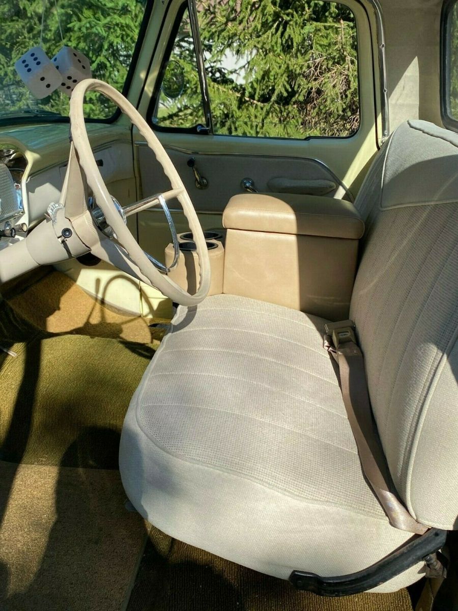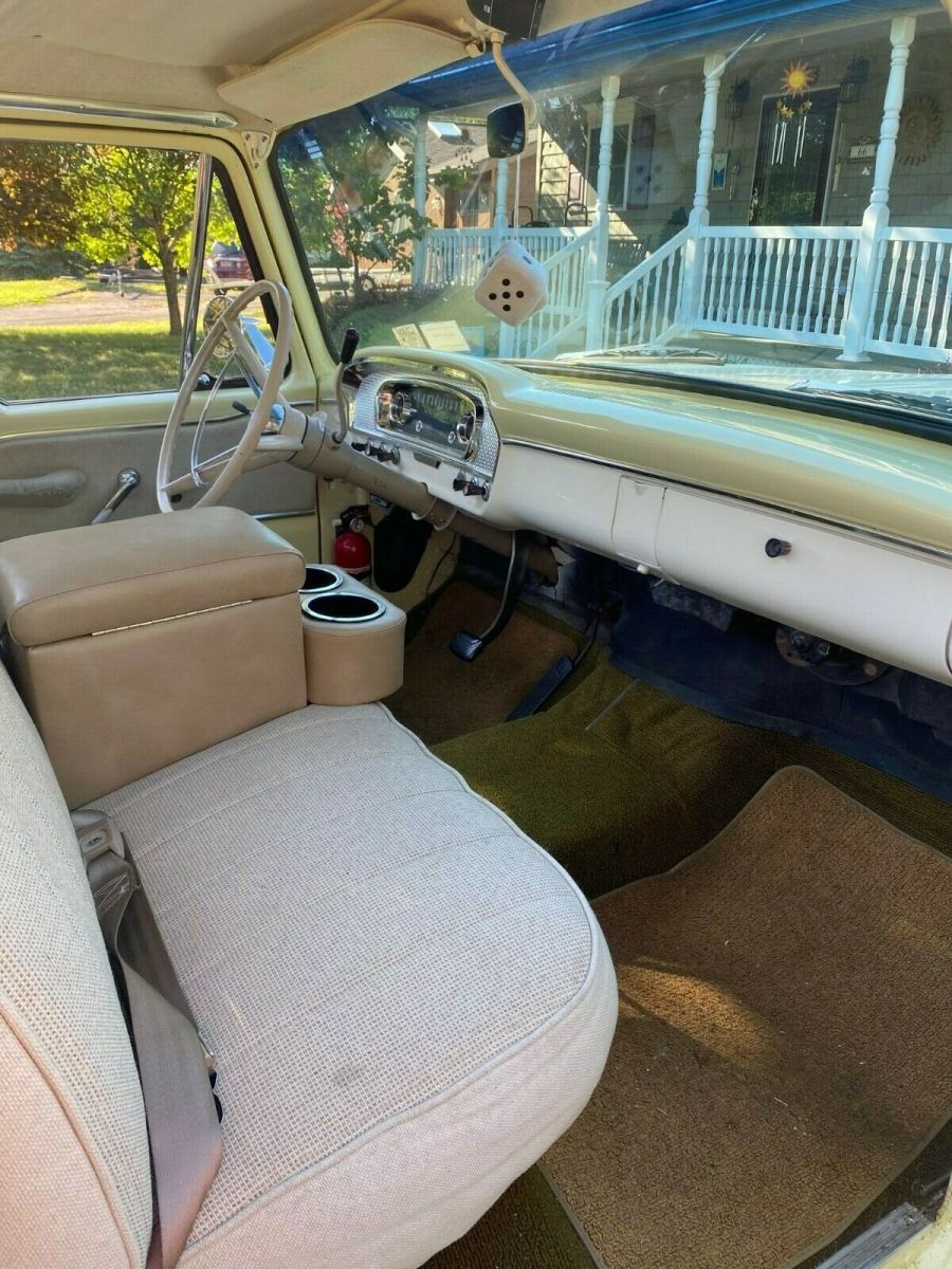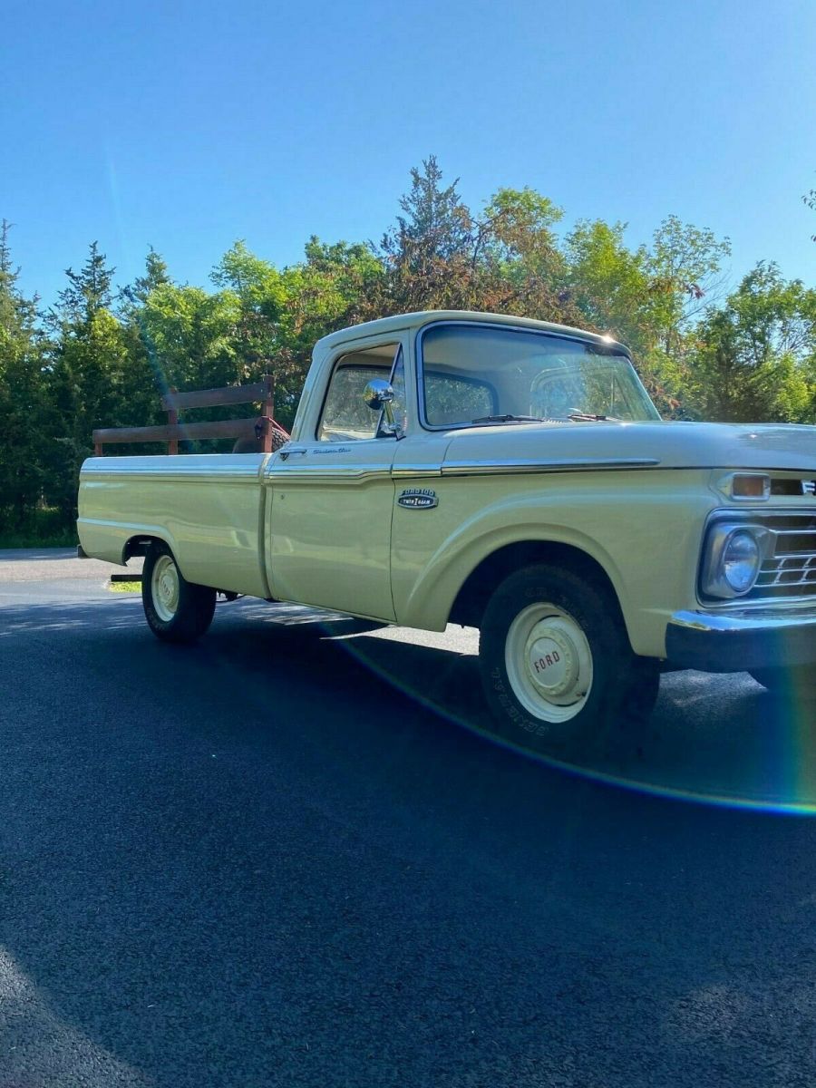 Beautiful 1965 Ford F 100 pick up Custom Cab for sale. Equipped with a 352 V8 engine. It has power steering and power brakes. The paint is excellent and is Springtime Yellow and Wimbledon White. Paint is in excellent condition and shines. Truck runs great and has been taken on long trips with no issues. Truck is a head turner, gets many compliments and won "Peoples Choice" award at a recent show. Bed rails and chest are obviously removable. A unique feature is that the rear bumper was stamped by the dealership that sold the car in 1965: "Woody Anderson Hunstville, Ala." The dealership is still in business. The stated mileage is what is reflected by the odometer.