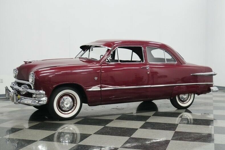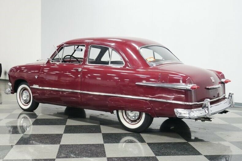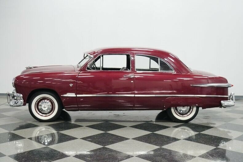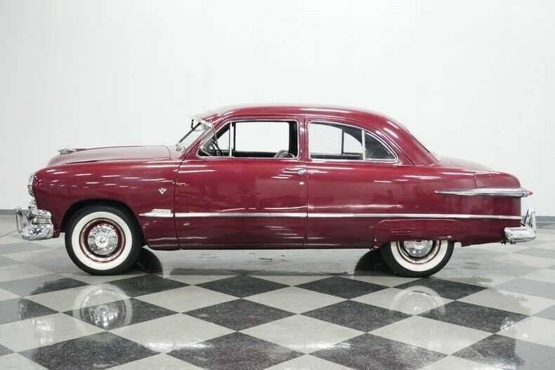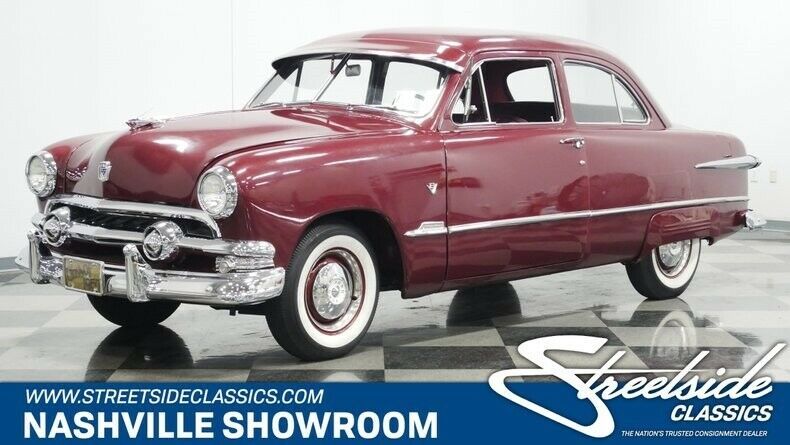 This 1951 Ford Custom Tudoor sedan Is pure vintage cool. That means flathead V8 power, a complete brightwork package, and all the other details that make you love one of the most significant post-war designs ever. For the brief three years this design was available, the 1951 version is the final and often most sough-after. That's because of the brightwork, so it's great to have it looking so complete and authentic here. Up front they doubled that amount of bullet-nosed boldness, and in the rear, the cool wraparound taillight/tailfin was even longer. Speaking of wraparound, the bright side trim still retained the full-length sweeping effect, but now it followed the bodywork all the way around the rear. And this one has all the best classic style, right down to the two-piece factory wheel covers. The maroon paint is an updated color, but it has been aged in well enough that it looks pure vintage. You even have cool period-correct pieces like the windshield sunshade and fender skirts. The maroon interior is highly original. There were a few updates along the way - including recovering the seats and seatbelts - but nothing gets in the way of that vintage feeling. These two-door sedans have a nice profile on the outside while still offering a large back seat and rear vent windows. So it makes for a fine classic to invite others along for the ride. The big steering wheel feels great in your hands, and beyond that everything looks correct - from the large speedometer to the AM radio that's still on display. The period-correct presentation continues under the hood. Everything from the oil bath air cleaner to the 6-volt generator gives this a look and feel of authenticity. In fact, the motor's casting year fits ideally into the car's timeline, and so we believe it to be original to the car. But more than just looking honest and stock, the 239 cubic-inch flathead is a great engine for enjoying classic motoring. The V8 makes a seriously sweet tune from updated Cherry Bomb dual exhaust, and the column-mounted three-speed manual transmission adds to the era '50s-style fun. The shoebox Ford really got the company back on track after WWII, and that's why they always hold a place in our enthusiast heart. So to find the most desirable year also looking so authentic is a sweet deal for those who love true automotive history. Call today!!! |