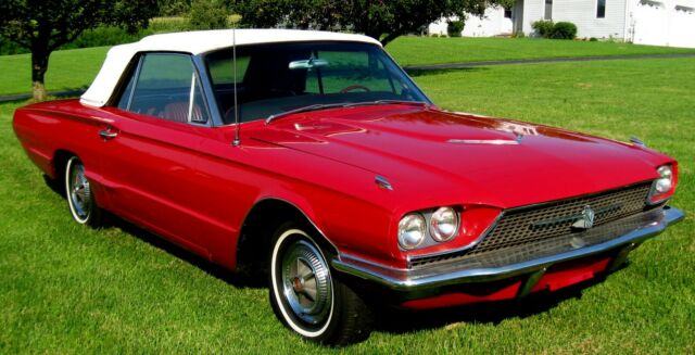 1966 FORD THUNDERBIRD CONVERTIBLE, 390 V-8, AUTOMATIC, FULL POWER RED/RED/WHITE TOP FULL POWER, PS, PDB, PW, POWER TOP, REAR SKIRTS AND MUCH MORE. You are bidding on a 1966 Ford Thunderbird Convertible well optioned with luxury power optional amenities. It has the smooth running 390 4-V big engine, Deluxe very comfortable Red Bucket Seat Interior with Automatic Transmission, all power windows, power steering, power front disc brakes, original radio, newer white power top, exhaust is good most replaced, nice newer paint runs drives smoothly and lots more. Enjoy a classic T-Bird convertible you can simply enjoy driving to local events, cruise nights or weekend getaways with the kids included. The 1966 Ford Thunderbird Convertible Rare to find last year for the Classic Chrome Bumper 4 Passenger T-Bird Convertible only 5,049 Convertibles were built with only a very few remain in this condition hence it is sought after by collectors a very cool driving classic drop-top investment. Attractive color-combo in Red/Red Interior/White Power Top, Solid Southern car I purchased it pre-pandemic then had it shipped enclosed carrier to NJ from Florida i'm long since retired now my current health issues force sale. 390 V-8 engine compartment is beautifully detailed, Automatic, Full Power, Power Top, Rear Fender Skirts are painted correctly and are included, 77k miles (my Florida title reads actual), luxury abounds with full power making the drive a pleasure, power front disc brakes, power steering power windows just drop the top cruise just like Thelma and Louise! Stay safe! Thanks for looking.