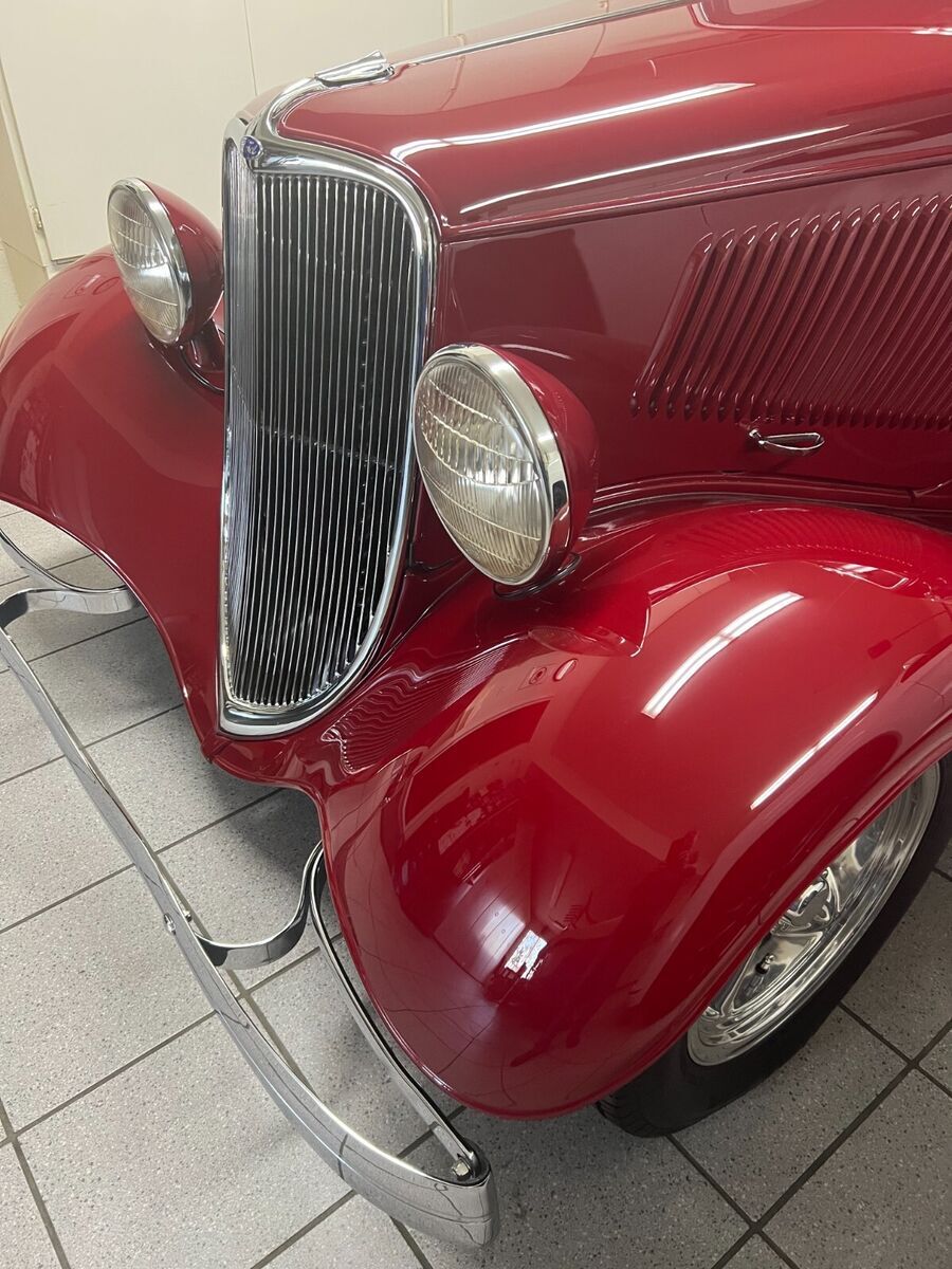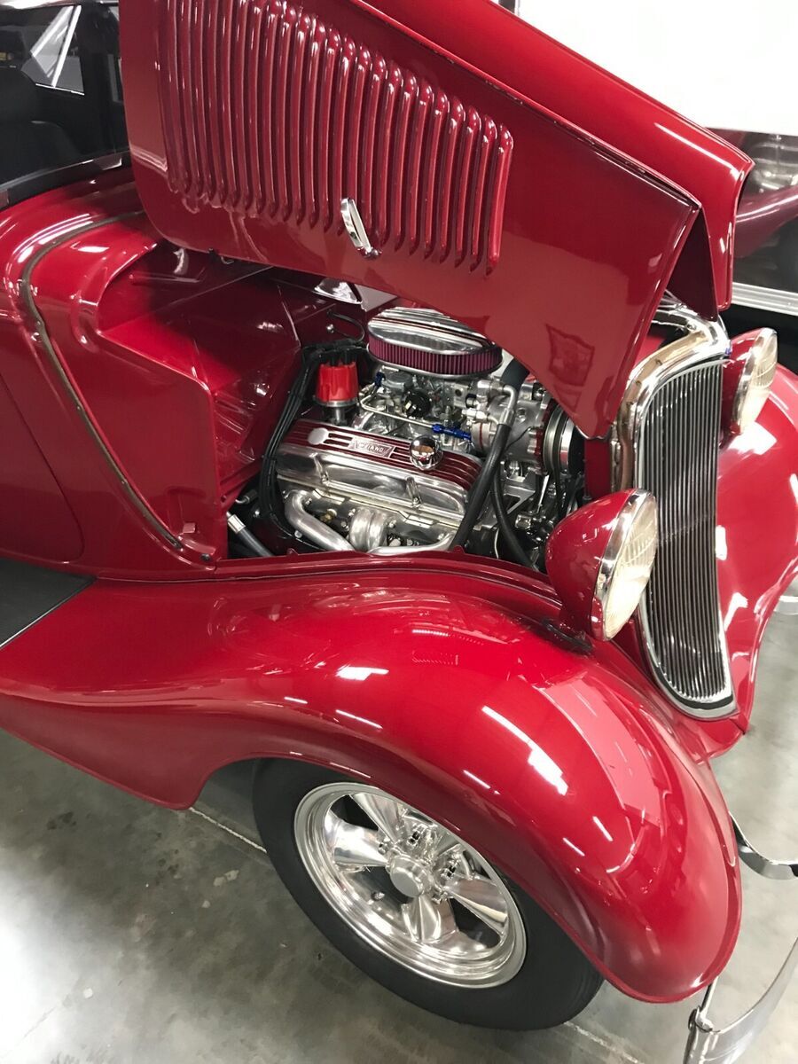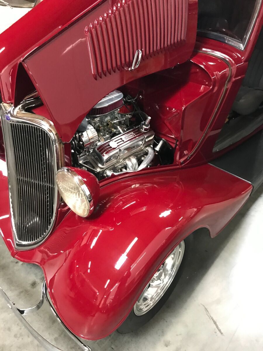 Vehicle Details 1933 Ford Victoria Street Rod. All original "Henry" steel. No history of rust or body damage ever. A truly over the top: body, fenders, grill and hood. Roof has been filled (looks like a factory install) with the original body edge (was custom made). Chevy 383(high end build) with 350 turbo transmission, Modified Jag rear end, traditional front suspension (pieces are chrome plated, powder coated or polished stainless steel). 4 wheel disc brakes, air conditioning and a tilt steering wheel. Hand made dash (one of a kind), Leather interior with aircraft tweed inserts, German square weave carpet and front and rear seatbelts. Nardi steering wheel, black anodized dash, black powder coated handles and manual windows. Just to much to list. Please look at the pictures and ask me any questions. The reserve is way below the cost to build. This is a BEST OF SHOW street rod!!