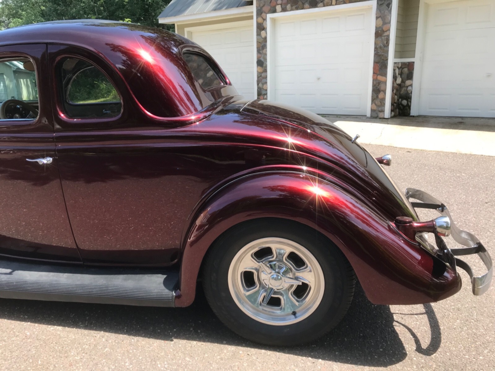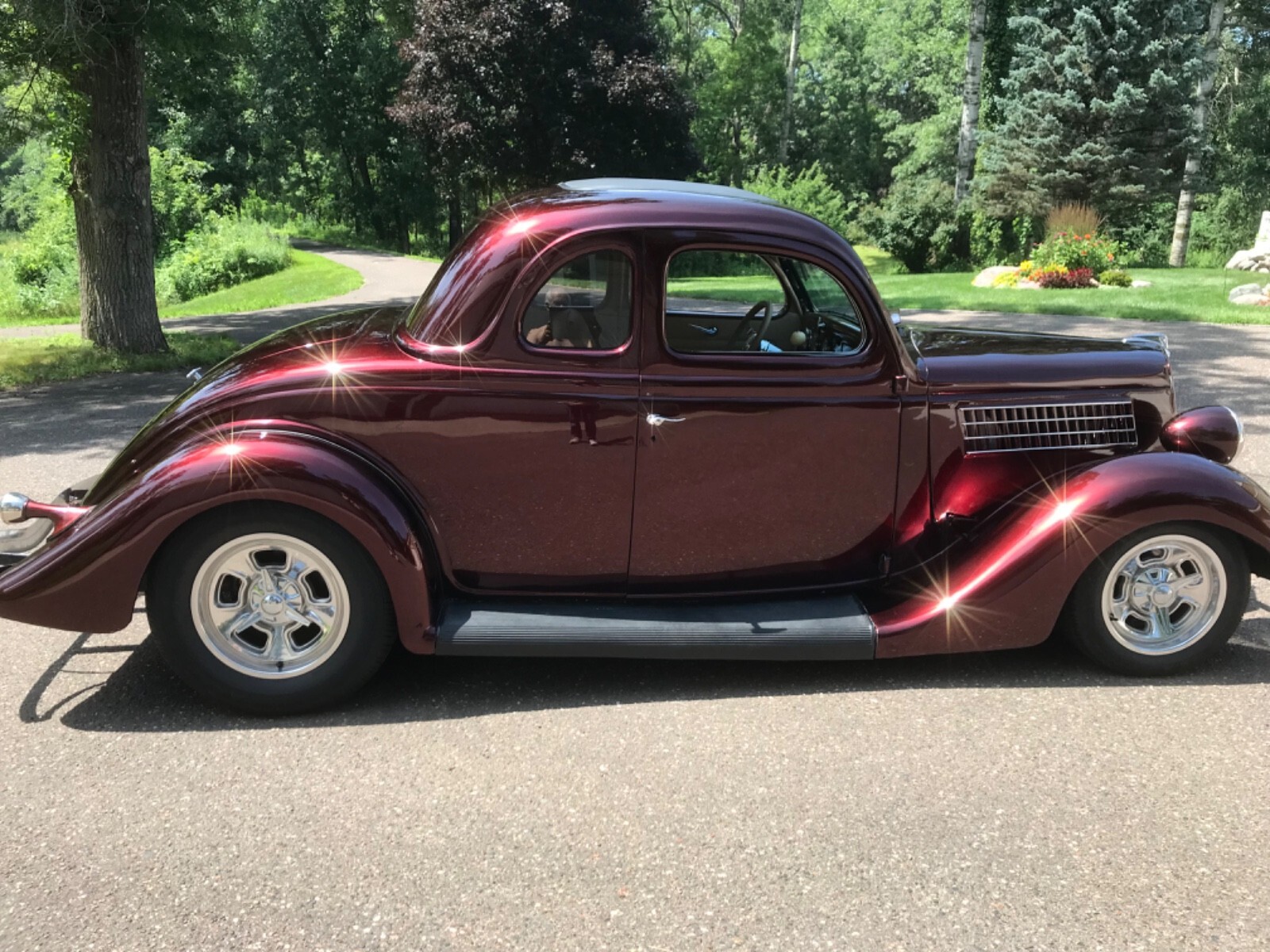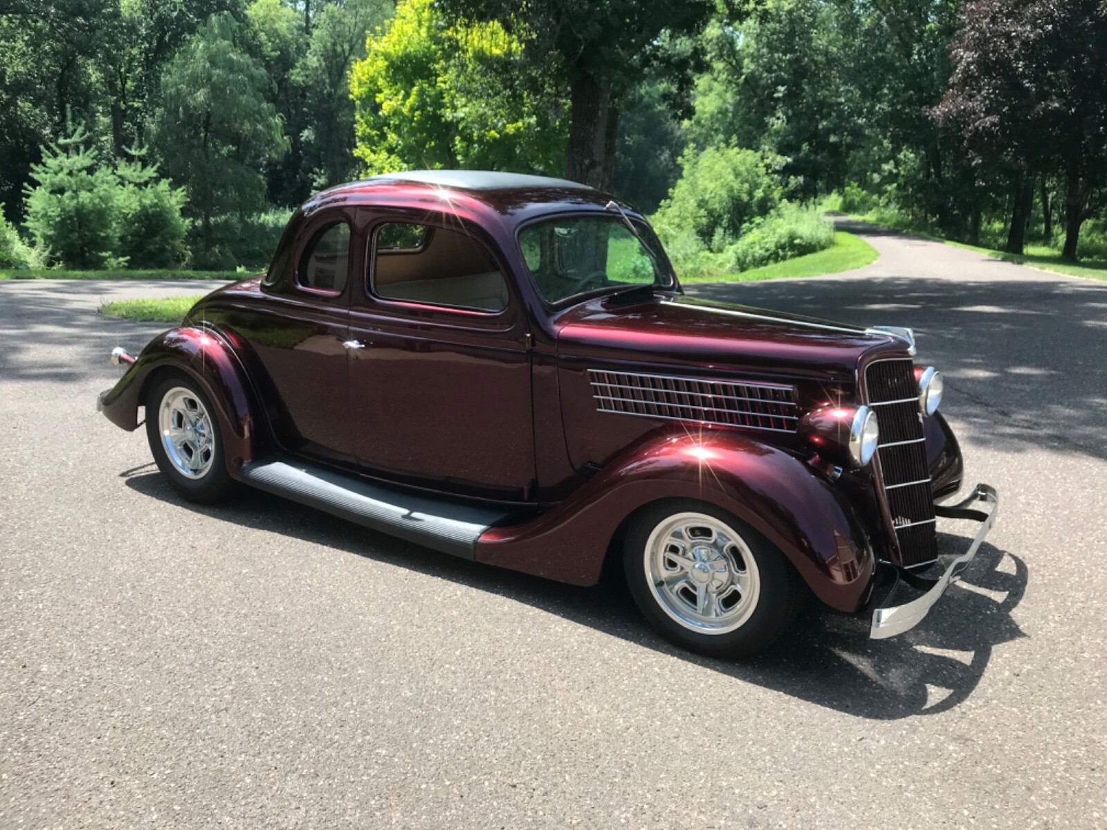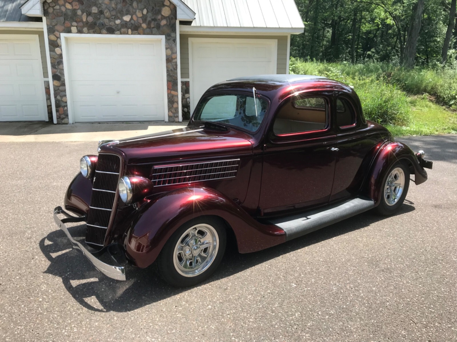 1935 ford 5 window coupeAll original steel body fenders hood trunk grill Engine351 rebuilt w/ roller motor lifters and rockersAluminum heads, aluminum intak, Msd ignition TransmisionC4 automatic w/manual shift valve bodyNot a normal automatic, you have to shift it like a manual transmission, but there’s no clutch RearFord 8 inch rear end with 4 ba, coil overs and disc brakes FrontHeidts independent front InteriorComplete custom leather interiorTouchscreen radio, 8 speaker, subwoofer, amp, power windows, all new gauges, new steering column, new leather wrap steering wheel, dash and all interior moldings have been professionally woodgrainedAll new door handlesTall lowcar shifter Pain, older paint still shows good not great but goodBlack cherryBody and paint are good not great but good has some chips, etc. New Rims and tiresVoss rims 15” front 17” backNew tiresNew gas tankAll new wiringNew exhaustAll new glassPower windows in the doorsFront and rear windows can open but not advisable. They’re very hard to get closed againHas a vintage air heat and air unit installed under the dash heat is working air conditioning needs to be finished Four-wheel disc brakes New bumpers, front and rear This was a stalled project we took on. Somebody started at 25 years ago. He got pretty far and quit, we took over on it and got it this far. We have a couple hundred miles on itruns and drives good.We are thinking he intended on building a street/drag car considering the big motor manual shift valve bodyWe have a couple hundred miles on this car and it seems to run out very wel, body and paint are only OK. More of a driver quality. Radio sounds excellent. very comfortable interior.Again, this is a driver quality car. The pictures may show that it looks perfect. It is very nice however not perfect.