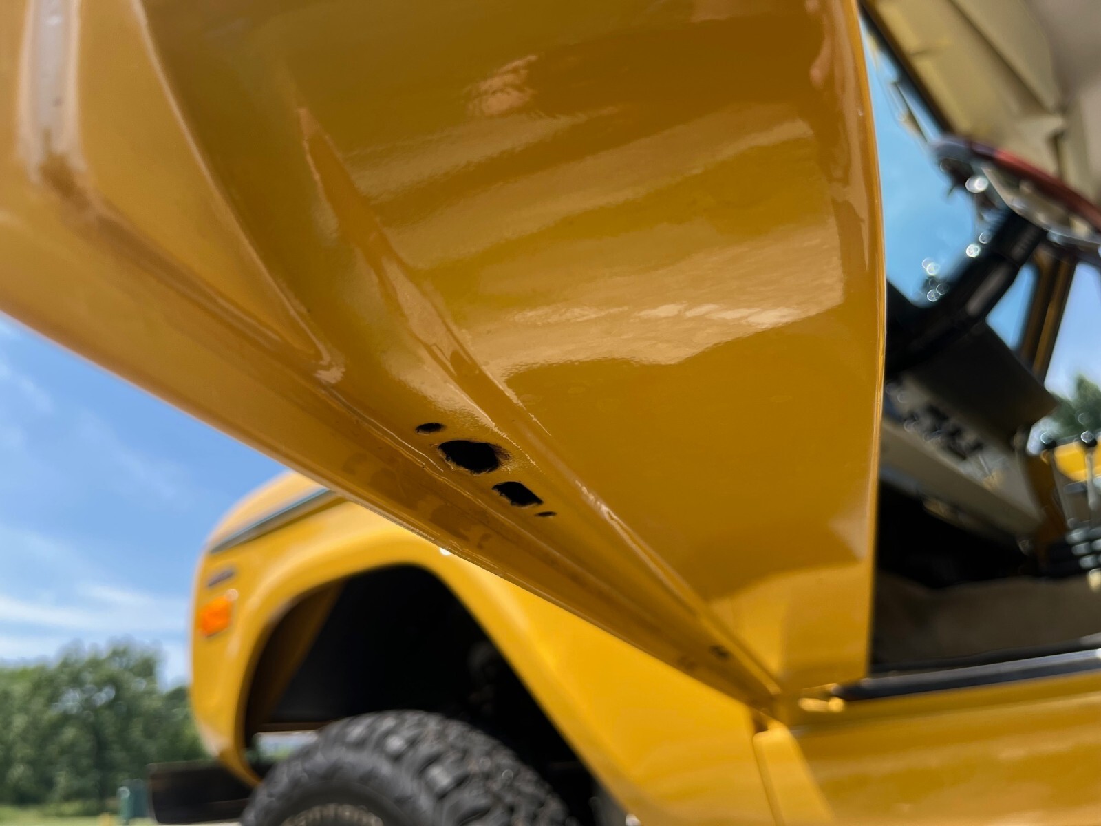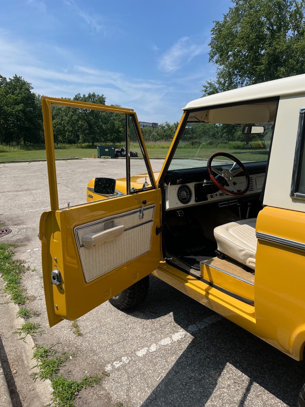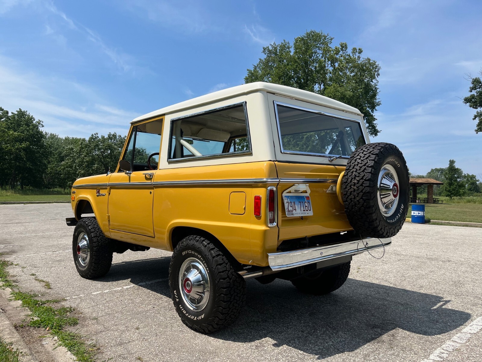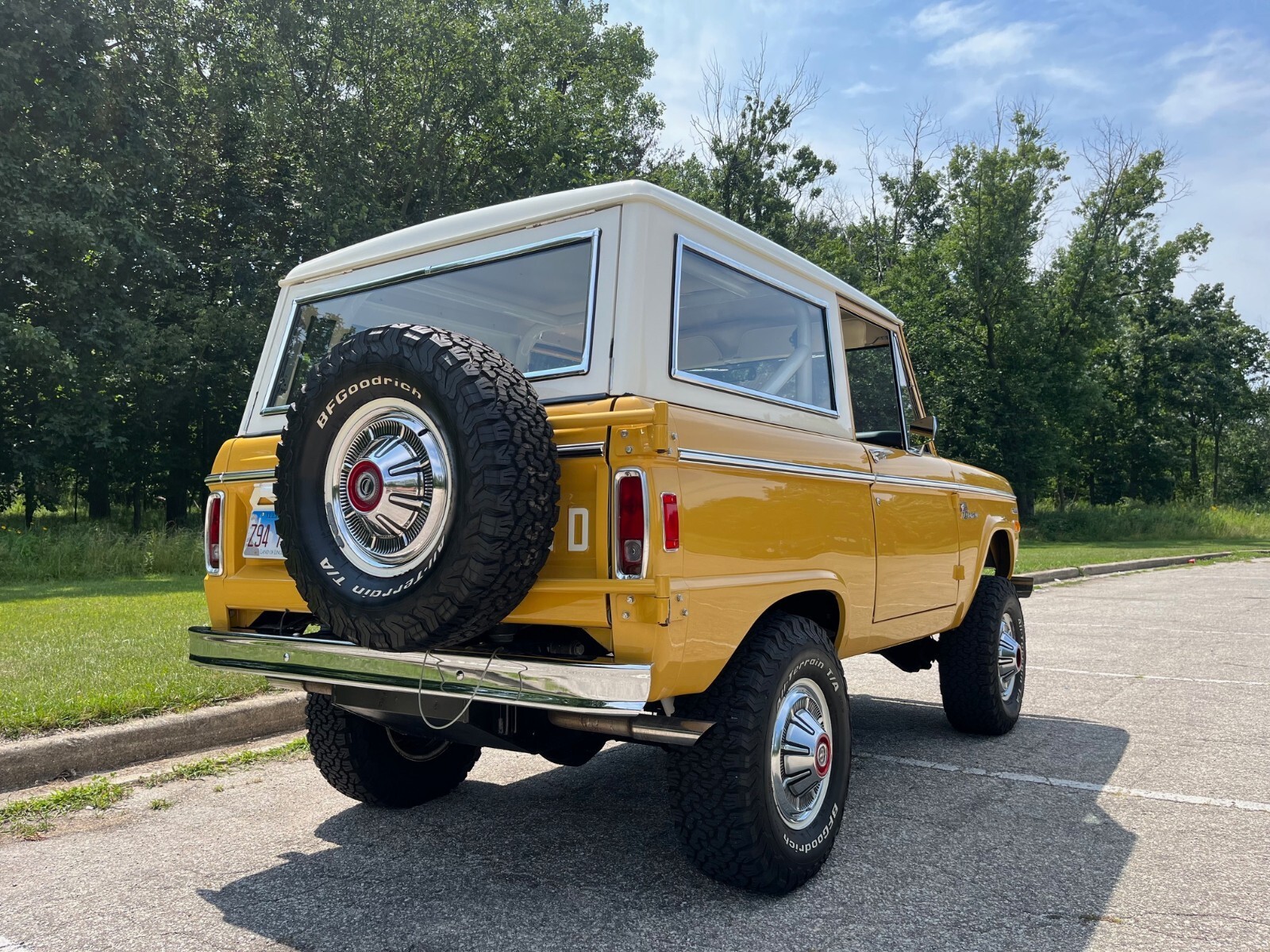 1969 Ford Bronco paintedfactory Ford Prairie Yellow. Grille insert was painted factoryFord Argent Silver.The hardtop was painted Ford Wimbledon White. Afull, frameoff, rotisserie restoration was completed in 2014 by Early Bronco specialist, Bronco Connection of Norfolk, Nebraska. Ford 15" wheels received original style hubcaps and ride on 31 x 10.50 x 15" BF Goodrich All-Terrain T/A radial tires. A full size spare is provided on the swing out tire carrier. The windshield and hardtop windows received factory stainless trim accents, the body has the factory Sport beltline trim, the bumpers are factory chrome with front bumperettes. The hardtop has never been removed since the restoration. Vehicle is powered by a rebuilt 302ci V8 crate engine. The 120 mph instrument cluster and odometer shows just over 3,500 miles since rebuild. Fast fuel injection system provides efficient fuel delivery. A single 24 gallon B.C. Broncosfuel tank replaces the original dual tanks. Enginecompartment upper intake is paint matched in Prairie Yellow. Engine is mated to a rebuilt Ford AOD automatic transmission and a twin-stick two-speed Dana 20 transfer case. The 2.5 lift suspension system includes high pressure shocks, long travel radius arms along with a 1" body lift. Truck has power steering, power front and rear disk brakes. The truck has the factory Dana 30 and 9" rear. An underdash Vintage Air A/C system keeps the interior cool. A Retrosound bluetooth receiver provides entertainment through a custom audio system (custom kick panel speakers up front and 6" x 9" speakers in the rear). A tilt steering column with 15" Mahogany steering wheel with billet Ford script horn cap wereadded. Engine and accessory wiring harnesses were completely replaced with modern units by American Autowire. The manually adjustable front bucket and bench seats were restored and recovered in factory Parchment covers. A full family roll cage keeps occupants safe with 4 point seat belts. Close-up photos of the bodywork, lenses, and trim are provided in the image gallery below. The seller did recently note a minor engine oil leak on bottomof the transmission bellhousing. The battery was just replaced this past month and the A/C was freshly charged. The Bronco's Original VIN is U15GLF93965. This vehicle is being sold by a private party with a clean Illinois title in the owner's name. A $2,000 deposit is due within 24 hours of auction close. Shipping and transport to be paid and arranged by buyer. Final payment required within 7 days of listing close through bank wire transfer. |