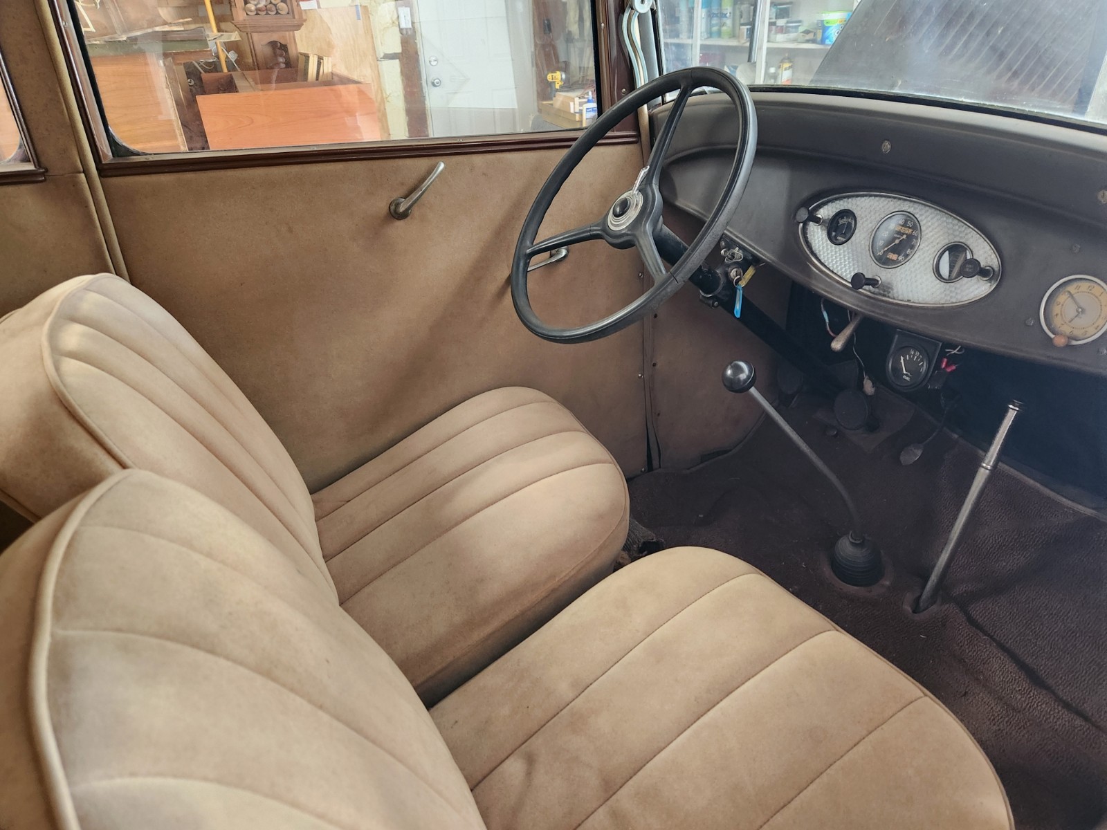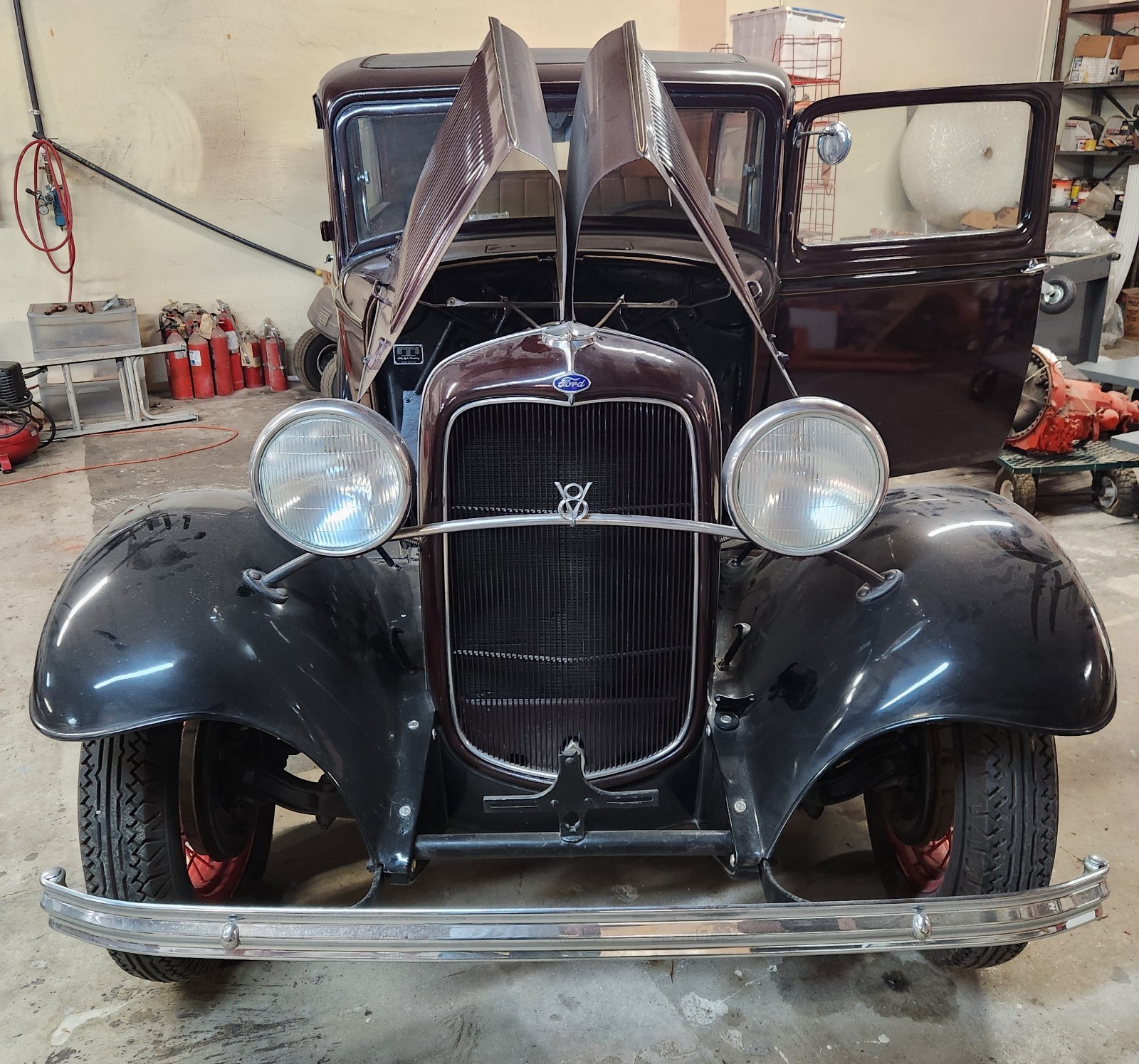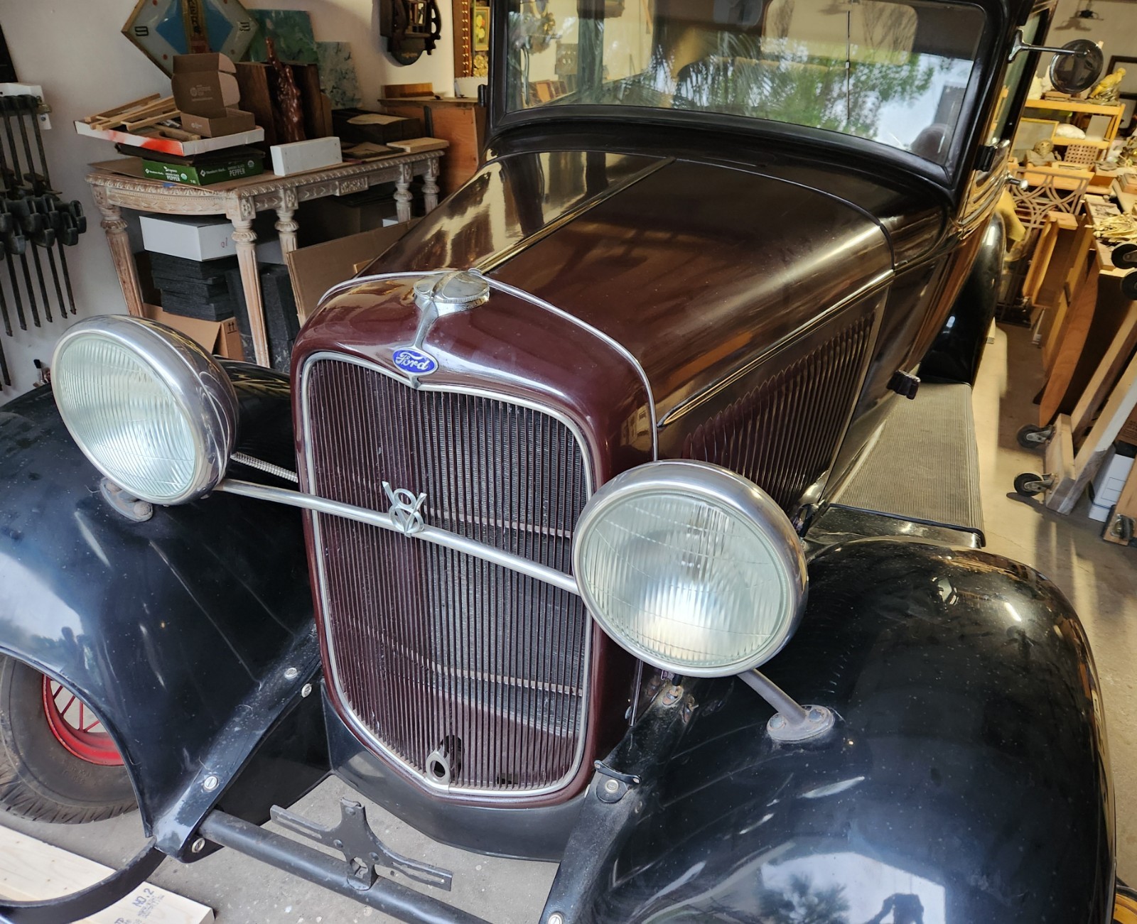 Warehouse find 1932 Ford tudor sedan. Body is above average. It was painted 40 years ago and always warehoused, so it is showing some age. It's a model 18 as stamped into the frame, factory V8, BUT the engine is a 1934 to 1936 model with a 2 bbl carb. I have a vin verification and Georgia conditional title. I can also supply an affidavit saying there are no liens on the car. I will also supply a bill of sale and if you need it, a current registration. There should be no problem transferring the title. Check with your DMV (with someone who knows what they're doing!). The car was in a collection and hasn't been registered for the 40 years the previous owner had it. It last ran about 6 years ago when it was rented by Disney for the newer Lady and the Tramp movie. I haven't seen the movie so I don't know if it made the cut. I pulled the plugs and put Marvel Mystery Oil in all cylinders as a precaution. As I said before, it was warehoused all the time so the motor should be fine. Gas tank was replaced about 8 years ago. It has 5 18 inch wheels. The tires hold air but are cracked from sitting. People in the old days used to sit on the front fenders and the fender beads would crack. A common fix was to weld round bar up under the bead and work the cracks. The front fenders have this "fix". There is a fine coat of bondo on the pass. fender and some cracks are showing as pictured. The cracks are from stress as there is no rust under the fenders. A real good body man could bring the front fenders back. So the front fenders need some work but the rest of the body and rear fenders are way above average with a few small dings here and there. This car has the 25 louver hood, which as you know is very de$ireable. The grille insert is awesome. The shell has a ding. The interior is mohair and in overall good shape. There is a small tear on the back of the drivers seat and a stain on the bottom of same seat. I don't believe the clock is original to the car but it is a Ford clock. I have new exterior door handles that go with the car. Glass is all good but the mechanisms will need to be fiddled with. If you want to see the car or send someone to check it out, that's a great idea. Let me know. The car is for pick up only in Savannah, Ga. High bidder to put $500 down within 24 hours of auction close with balance in cash or bank transfer. Full payment to be made within 7 days. Let me know if you have any questions or need any more pictures. This is an above average car for the age. If you don't want the hood, I'll keep it and take $1500 off the final price.