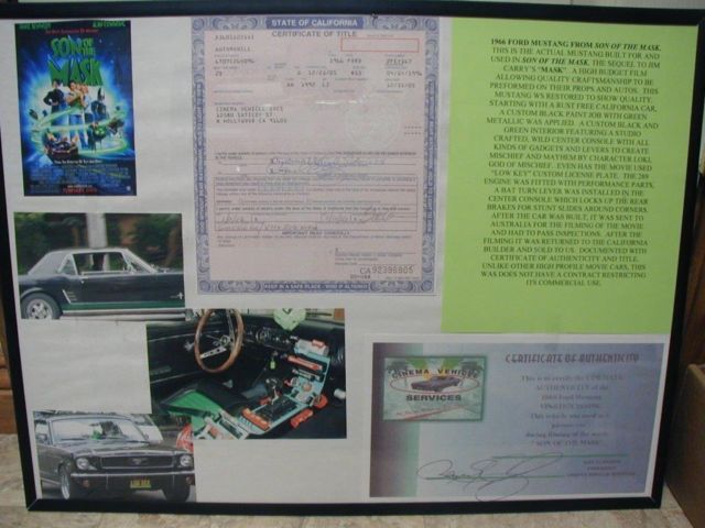 This is the actual Mustang built for and used in the “Son of the Mask” film. The car itself is not your typical “just needs to look good on film” Movie Car restoration. this car was done nice! Has show quality paint over a rust free California original sheet metal body. New interior with custom green seat inserts and a fully custom console loaded with levers and buttons to create comic mayhem by the driver. Loki (Alan Cumming). god of Mischief. Has chrome wheels with custom green-wall front tires for the scene when this car made its appearance. It still has the movie used front license plate reading “Low-Key”. New chrome all over. The engine is a rebuilt 289 with mild performance parts and dual exhaust. Aftermarket power brakes with an addition of a Bat-Turn Lever hidden inside the console to lock up the rear brakes for rear-end slides. The engine bay was fully detailed with aluminum air cleaner. The car itself is a unique custom show piece that anyone can be proud to drive and show. The movie history is just an added bonus on this car! This was a main car used by a main actor in the film. Put your family in to go cruising in something that is a bit different and cool! It has three (3) seatbelts (1966 Mustangs only had two) on the back seats as one (in the middle) was for the camera man! Fully documented. I even have the original California movie studio title. This car runs and drives great. I have taken it to many car shows. charity events. cruises and it always gets the “Thumbs Up”. The car is what it is and is the same way it came out of the movie over 10 years ago! The movie was made in 2004 in Australia and shown in winter 2005. The car was shipped from California to Australia for filming. It has never seen snow (Rare for a 49 year old Mustang). The car is in the same condition as when the movie was filmed with a few small trim bruises here and there. I will include the many original props such as small and large posters I display at the shows. and autographed pictures including Alan Cumming and Jamie Kennedy (Main actor as Jim Carey cancelled for filming the second Mask picture). magazines. movie blanket. mask. new Halloween costumes of both main actors in their roles. wrist watch. and cd soundtrack. I even have a brand new Chinese DVD as this was a world movie! Own this car and own a piece of Hollywood! Please ask any questions you may have before bidding. A certified check is needed for payment. Payment must be received within seven (7) days of close of auction. Thanks for looking!