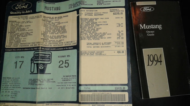 | All original stock 1994 Ford Mustang GT Convertible with 5.0L V8 automatic with very low original miles. Car presents just as you think it would and maybe better. Clean car fax no accidents and had only one owner until early 2015 (I am second owner). Always has been a Texas car and garage kept. I have the original window sticker owners manual and the factory original convertible boot cover also comes with the car (which I don't think has ever been used). This is extremely clean 21 year old classic hard to find another one like this....especially with these colors. The original dealer logo and license plate frame still on the rear of the car.All power options including power top cold A/C anti- lock brakes driver/passenger airbags keyless entry steering wheel controls for cruise control wheel locks.Black leather interior is in very good condition...original front floor mats are like new. The white convertible top and rear glass window are in excellent condition.Absolutely no fluid leaks.Please note the mileage listed is at time of ebay listing. I will drive the car occasionally so mileage will go up slightly. |
