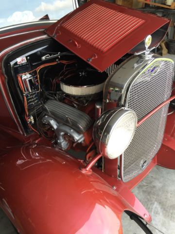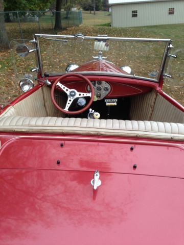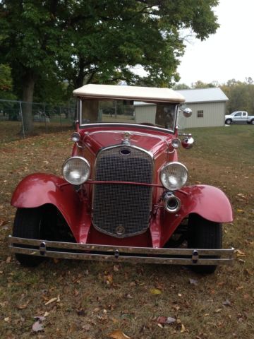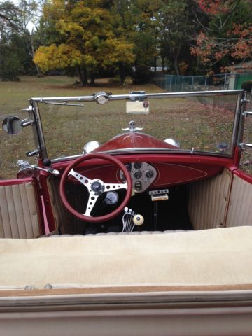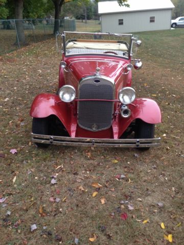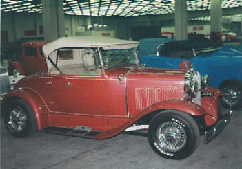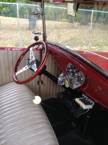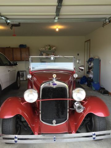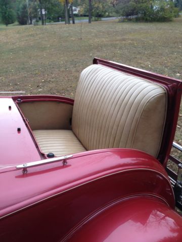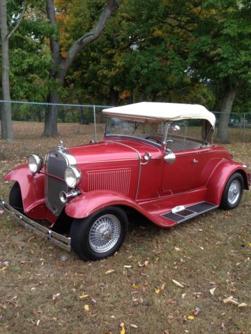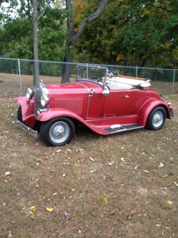 1930 Ford Deluxe Roadster is an original full fender ALL STEEL body. Paint is G M Honduras Maroon (1960 Corvette) with hand painted tan pinstripes. It has a rumble seat. Drive train is a !957 Chevrolet V8 with a 4 bbl carburetor mated to a 3 speed floor shifted manual transmission (1939 Lincoln Zephyr?)and 1940 rear end. Brakes are 1940 Ford drum brakes. Wheels are Dayton chrome spoke knock offs. there are etched glass wind wings Sportlite bullet spot light and luggage carrier. Blue dot tail lights.The interior has S W gauges in the original dash cluster and a custom steering wheel. Tan removable fold down top. Custom California Car cover.I have owned the car for 28years and it has always run perfectly.