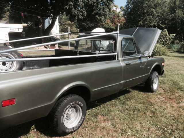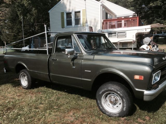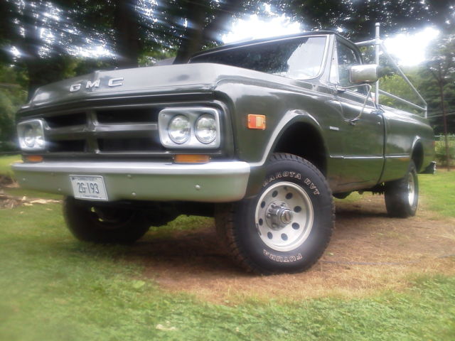 HI, OUR BIDDING ON A 1969 GMC RESTO IN 2013/14, HAVE DRIVEN THIS TRUCK ONE PLUS YEAR NOW. MOTOR IS A 283 SBC TBBL CARB, OWER STEERING, OWER DISC FRONT, EAR DRUM BRAKE, 221 4 SPEED MANUAL TRANSMISSION ANS 383 OR GT 4 FRONT AND REAR. NEW MONROE SHOCKS IN RESTO, RASKES, ELTS, ALLORY ELECTRONIC IGNITION, BBL ROCHESTER CARB POWER BRAKE BOOST AND CYLENDARS, 1/4 " EXCHAST CALIFORNIA TURBO MUFFLERS, SED POR 15 ON FRAME, EW INNER FENDERS, OCKERS AND CORNERS, HIS IS NOT A SHOW TRUCK OR ORIGINAL TRUCK OTHER THAN THE 4X4, OTOR WAS A 269 STRAIGHT 6. ALUMINUM RADIATOR, LSO HAVE AST OF ALUMINUM RIM, URRENTLY GOODYEAR GT TIRES 15" RIMS CHEVY STEEL RIM. I PUT 8,000 MILES ON IT IN BOTH HIGHWAY AND CITY. THE TRUCK IS GEARED LOW SO 70MPH IS TOP SPEED. BUT IT HAS A ROCK CLIMBER TRANSMISSION THAT CAN PULL THE HOUSE DOWN!I DRIVE THIS TRUCK ON WEEKENDS 300 TO 4OO MILES O MY DADS. WINDOW VENTS, LOOR VENTS OLD SCHOOL DRIVING.