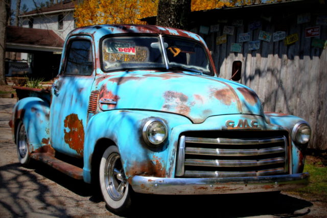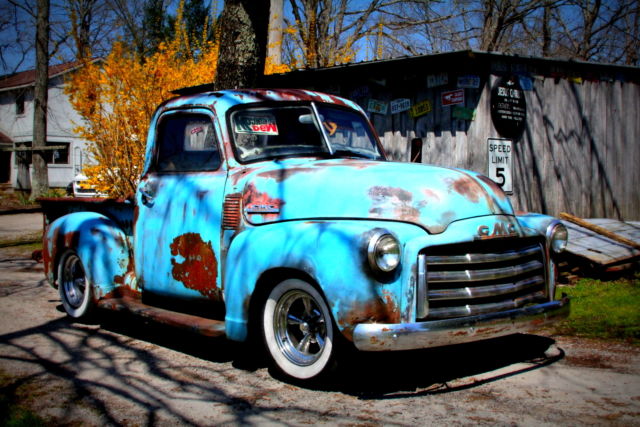 Amazing 1942 GMC Pick up Rat Rod!Just took it for a 800 mile road trip with zero problems...She just runs and runs and runs.No longer has white wall tires... Just put 4 new tires on it for you... close up pictures shown.All Gmc emblems on it.Etched GMC on back ....just like original .Vintage license plateand vintage saw sun visors.Vents pictured to let in a cool breeze.Nice beige interior and inside beige and blue roof interior. Any questions... please ask.Good luck.sold as is... but it is an Awesome Vehicle. no questions answered on Sunday... Thanks |