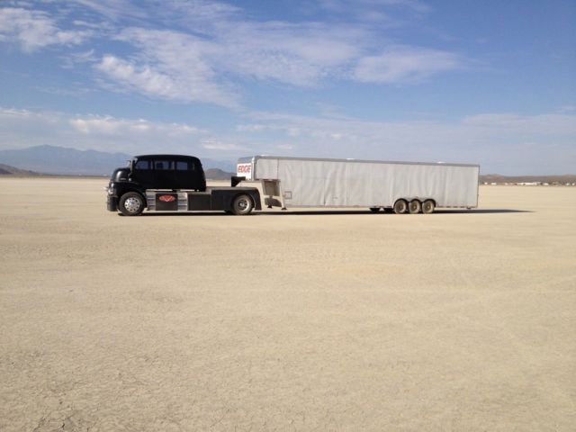1948 Gmc Coe combined with a 1953 Suburban Custom rear suicide doors made using Suburban front doors Rear barn doors still functional Front fenders widened to fit chassis/tires All lower body, bumpers, stairs etc custom made by Eddie's Chop Shop Hot Rod Flat black paint (not black primer) on Body All lower panels powder coated satin black All lower panels, stairs Bed etc are modular and can be taken off for repair/repaint or modifications Front push bar is pinned and can be pulled out to accommodate pushing different race cars or to be used as a step for cleaning etc. Custom Air ride suspension on Cab.