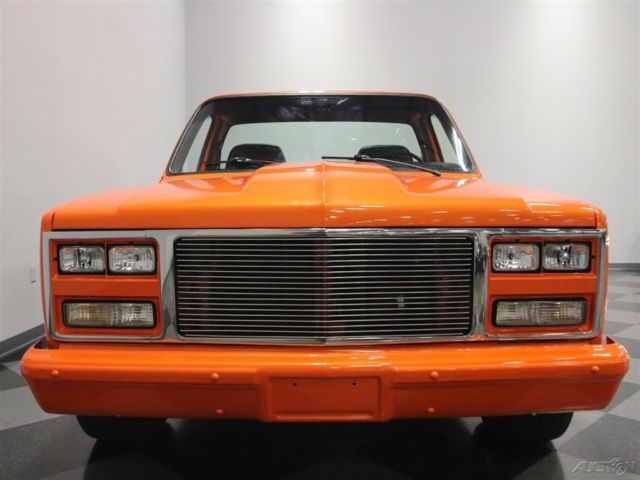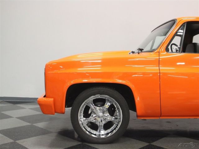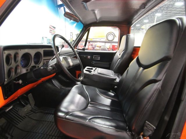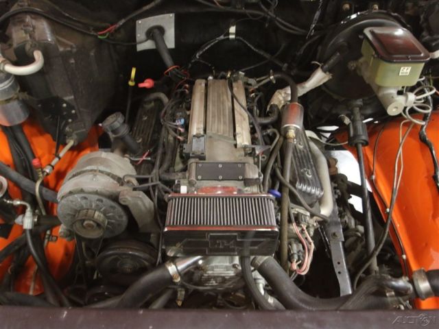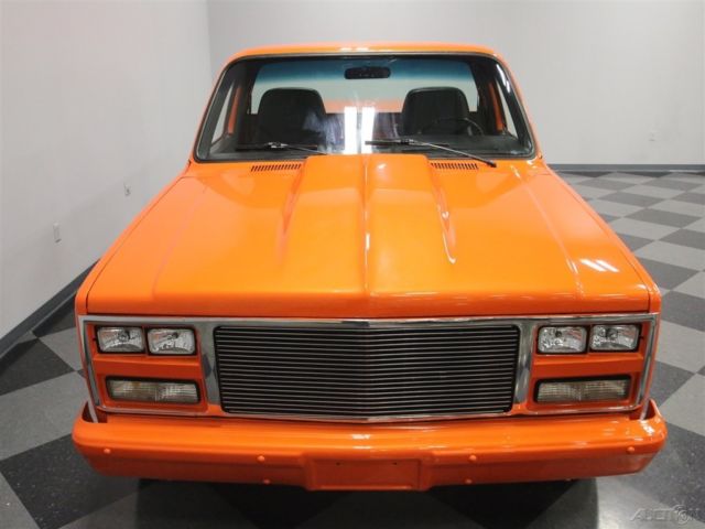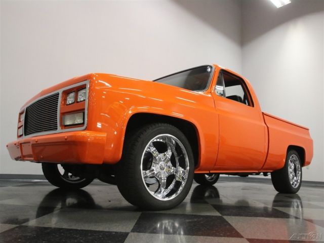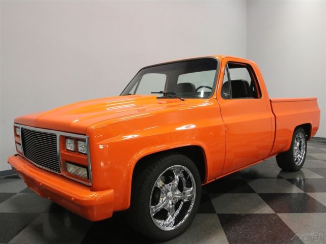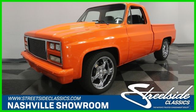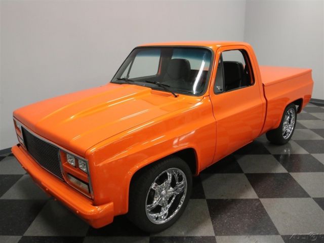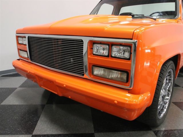 The affordable price on this 1986 GMC Sierra might make you think that the budget was blown on the super slick paint and bodywork. But take some time to go over the fully customized interior and fuel-injected Corvette V8, and soon you'll realize you can drive home the coolest total package around for less than you ever thought possible. Let's start with the paint that's instantly grabbing your attention. From a distance, it might just look like a bright take on Chevy's iconic Hugger Orange, but then as it draws you in, you see something extra bold. It's a modern Tangelo Pearl with plenty of glossy clearcoat on top of this metallic/electric orange. This ultra-smooth paint makes all the custom work look amazing. The cowl hood is nicely integrated, the front bumper almost looks seamless, and the sides are butter-smooth with the elimination of the door handles. And this paint and customization combo is best in the rear where there was even more investment. The bed cover fits snugly into the design, and the roll pan has been fully integrated, including the taillights. And we love how the tailgate has been permanently integrated, so the sheetmetal now has an unbroken line that runs around the body from headlight to headlight. While the orange consumes nearly every inch of the exterior, there is room left for some good 'ol American-style brightwork. You see it on the full-width billet grille, crystal clear headlights, and large 20-inch alloys. When you pop the remote door openers, the world of custom upgrades resumes. The bold orange continues inside, but now it's an accent piece to the premium black interior. The luxury starts with the split seats that provide seating for three when you need it, and the center folds into a cup holder console when you want individualized comfort. And while this is a wild custom on the outside, you can eat away the miles with ease thanks to conveniences like cruise control, tilt steering column, power windows, and an AM/FM/CD stereo. Best of all, the air conditioning is running modern R134a, so you can stay as cool as you look behind the wheel. And speaking of the view from the driver's seat, the blue glow if the full Dakota Digital gauge panel is always a welcomed upgrade. Under the hood is upgraded fuel-injected power. This 1986 pickup is harnessing the power from a 1995 performance machine. It's a 350 cubic-inch LT1 V8, there's only about 28k miles on this motor. And more than just modern fuel-injected reliability, this muscular V8 gets a nice upgrade in power and rumble thanks to the Sanderson headers that feed the dual exhaust. Plus, no matter if it's a grocery run or a cruise-in night, you'll appreciate features like the power steering, front disc brakes, and the grip of modern performance tires. The finishing touch is the four-speed automatic transmission w/overdrive that reminds you once again that this flashy pickup is also a great highway cruiser. Complete with the original bill of sale and the owner's manual, this is a true uniform build that has been heavily invested in to create a striking total package. But best of all, you don't have to heavily invest in it to take this truck home. Call today!!!