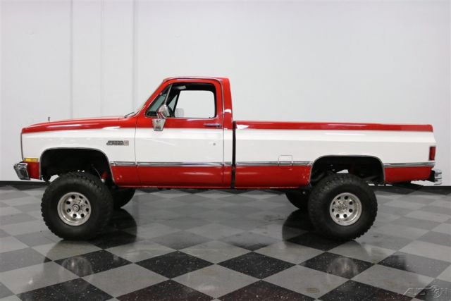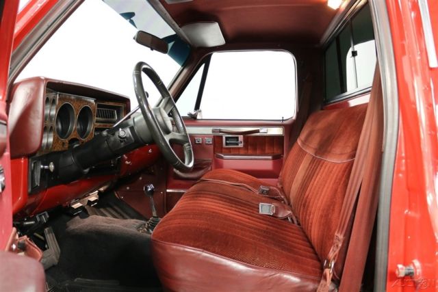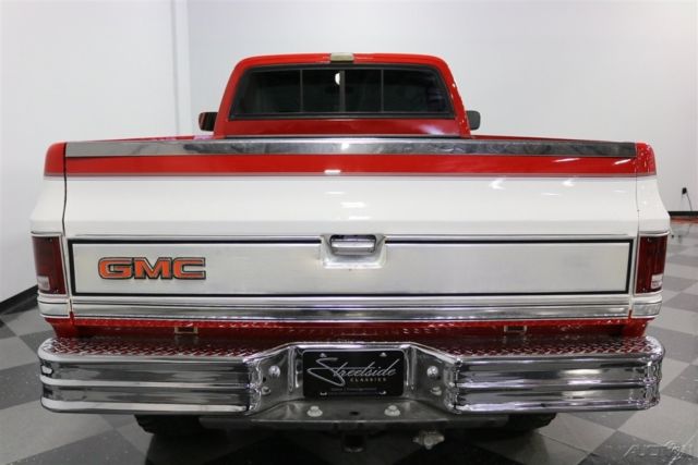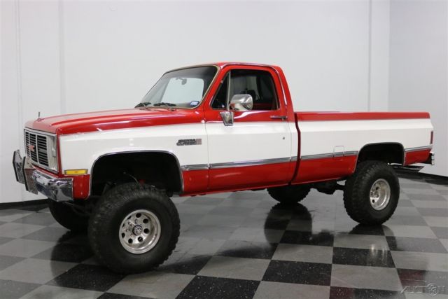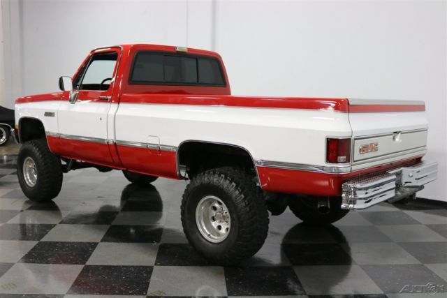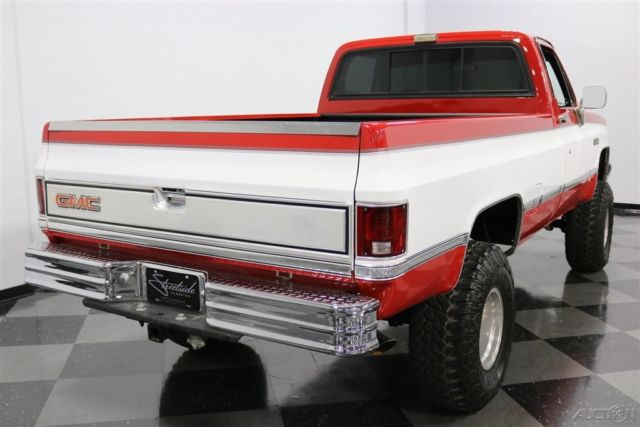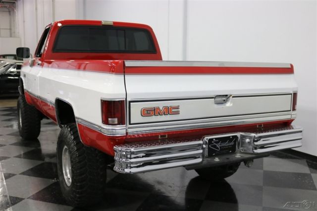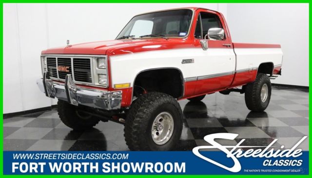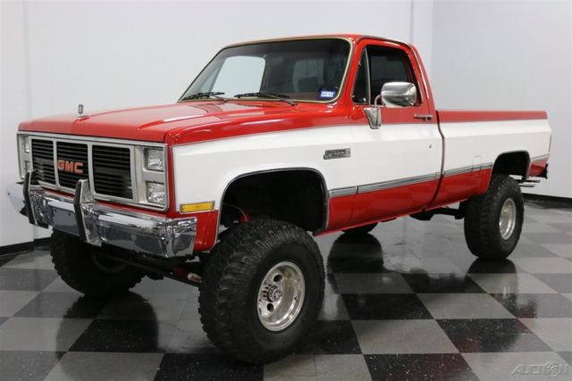 Admit it, you've always admired big, tastefully-done 4x4s like this 1986 GMC Sierra Classic 1500. It keeps its factory look but amps it up a bit with the usual 4x4 upgrades and the result is like a stock truck on steroids. It's also loaded with options and incredibly straight, making it a high-quality, yet very affordable, proposition. Anything this big is going to command a lot of attention, so it's good news that it's in excellent shape, even up close. It was repainted in its original combination of code 72 Apple Red and code 12 Frost White, and that's a look that just won't get old. It doesn't look like this was a work truck, and instead the long bed/regular cab was probably used for commuting and maybe some light lifting and off-road fun on weekends during its early years. As a result, the bodywork is in great shape with straight panels and good gaps that don't show any signs of abuse, and the nicely done paint shines up quite well. The GMC was a little dressier than the Chevys, with big chrome bumpers, stainless trim along the sides, and even a hood ornament up front. There's also a spray-in bedliner that allows you to still put the truck to work today. The big chrome diamond plate rear bumper looks brand new and helps with the heavy-duty look. The handsome red interior is typical late-80s GM, with velour-like upholstery that's comfortable and durable. The door panels show some modest wear, particularly where the driver's elbow might rest, but things like the carpets and dash pad are quite good. Factory instruments are stashed behind a burled walnut gauge panel that isn't terribly convincing, but that was GM in the 1980s. There's also a leather-wrapped steering wheel that seems appropriate for the surprisingly luxurious pickup. Options include ice cold factory A/C, power windows and locks, and a tilt steering column, making this a no-compromises pickup that can work well and coddle its passengers. An AM/FM/CD stereo has been fitted in the lower corner of the instrument panel, replacing the original radio, and it sounds pretty good. Heavy-duty floor mats help protect those original carpets and there's a sliding rear window for those days that don't quite need the A/C. The engine is a 305 cubic inch V8 (also known as a 5.0 liter), and with a 4-barrel carburetor, it starts easily, idles well even when it's cold, and has a nice, flat torque curve that's perfect for a full-sized pickup. No outrageous modifications, just OEM parts throughout that ensure easy service and reliability in the future. Backed by a 700R4 4-speed automatic overdrive transmission, it's comfortable around town and cruises easily on the highway without getting buzzy. A custom dual exhaust system with Flowmaster mufflers gives it a definite hot-rod sound that really works with the big 4x4 look, and while it's not detailed underneath, it is in good shape with no signs of abuse. Twin gas tanks give it bladder-bursting range on the highway and the upgraded suspension with new Rancho adjustable shocks gives it a great look plus space for those giant 35x12.50-15 off-road radials. It's OK, we all know these are cool trucks. If you've wanted one since you were a kid, this is a nice one that's got all the toys and is ready to go right away. Call today and start having fun!