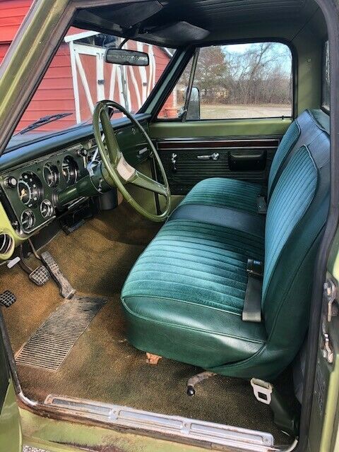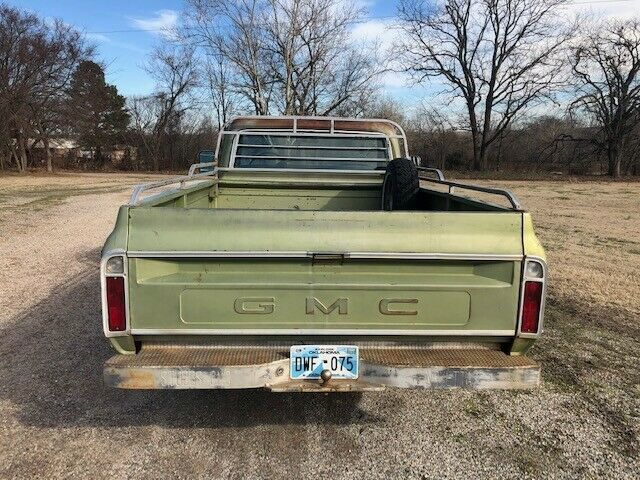 I have an original 1970 GMC pickup. These trucks are getting hard to find. It is not possible to confirm if is a numbersmatching pickup using the VIN and block number.However, I am the third owner of this pickup and the previous ownerswere in the local Henryetta area. Theprevious owner confirmed with me that the 350 motor and 350 transmission wereoriginal. This truck has been wreckedbecause there is body puddy in the right fender, but the rest of the trucklooks good and is still in the Medium Olive Green paint. The odometer reads 18558, but it is morelikely 118,558. Some unique features ofthe truck are factory air, factory power steering, and a camper mirroroption. Look at the photo of glove boxoption sheet for list of options on the truck.The previous owner began restoring the interior to period correct itemssuch as seat, door panels, and dash so the interior is in good shape. I also have some new window weatherstrippingin a box ready to install. I just re-didthe brakes and put a new power booster on.It has Hancook tires that are in great condition and a spare mounted inthe bed that is likely the original spare.The spare has a Phillips 66 brand tire.I also put a new battery and an aftermarket radiator on, but I have theoriginal 4-row radiator with the brackets if you want to restore it. I also have the original wheels. I put a period correct headache rack on thatI used to have on a '68 truck. Thistruck runs great and has a lot of power.It shifts smooth and the brakes work great. Everything works except for the originalradio. The AC was working but the freon must have leaked out. All the lights,windshield wipers, and fan and heater work great. The previous owner left it outside so thereis surface rust and one rust-through on the one rocker panel. The other rockerpanel and the wheel wells look good.I also have a 1967-72 Factory Assembly Manualthat I will give to whoever buys the truck.This would be a good truck for a complete original restoration.