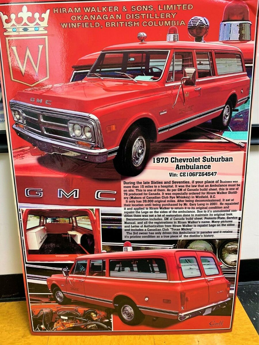 RELISTED DUE TO NONPAYMENTHERE A SECOND CHANCE TO GET THIS BEAUTIFUL SUBURBAN1970 GMC Suburban.THE SUBURBAN HAS LESS THEN 41,000 MILES ON ITAs per the GM of Canada Build Sheet, this is one of 76 produced for Canada. It was special ordered for Hiram Walker Distillery (Makers of Canadian Club Rye Whiskey)in Winfield, B.C. It only has 39,559 original miles (title reads exempt). After being decommissioned, it sat at their location until it was purchased in 2001. Due to its unmolested condition, little work was needed to maintain its original look 350 CU. IN . V-8 ENGREAR AXLE 373 RATIOPOWER STEERINGBLOCK HEATERFRONT STABILIZER EQRED CUSTOM CLOTH TRREAR POI TRASTIONTURBO HYDRA-MATICBRAKE BOOSTER EQMODEL CE15906 Rare Hiram Walker ambulance a steal of a deal The Hiram Walker distillery has a strong connection to the car industry dating back to 1904.The first Ford of Canada factory was built in Walkerville, Ont., a town that was built, named and run by Hiram Walker. In 1910, Studebaker set up a plant there and produced all of the right-hand drive vehicles that were exported to the United Kingdom and the British Commonwealth Countries. Soon, General Motors and Chrysler set up their Canadian plants in Walkerville.When Hiram Walker decided to move to the West Coast, they picked Winfield in the Okanagan. Construction began in 1969 and by the time it was completed the Winfield distillery was one of the largest in the country.During the 1960s and 1970s if a business was located more than 24 km from a hospital it was a requirement that business facilities with a certain number of employees had an ambulance on site.The pictured, beautifully restored GMC Suburban ambulance is the one ordered by the distillery to meet the requirements. A total of 76 special order ambulances were built in 1970 at GM’s Flint, Mich., plant for the Canadian market. This particular example was shipped on May 15, 1970, to be delivered by Carter Motors in Kelowna.The ambulance was used at the Winfield distillery until it closed in 1995, during which time it covered a total distance of 39000 miles. I doubt that all of those mile were used for emergency trips to Kelowna General, since if they were, that would amount to 1,083 round trips or once every 11 days.The ambulance was purchased in 2001, requiring a simple restoration and a fresh coat of paint to bring it back to its almost-as-new condition.I spotted painted the gold logo on the door which immediately caught my eye.I thought lot about the sale price of this piece of Canadian history. Hiram Walker the company logo on the front doors. I WILL BE OPEN TO OFFER YOU CAN CALL ME AT 734-216-7849 ERICtext for walk around video of truck will not find much nice of a truck for 50 years oldwas repaint in 1990s by the distillery i was toldWILL ACEPTWire transfer with time to clear or cash . This vehicle is sold As Is /Where Is, no warranties expressed or implied. The Buyer or his agent is encouraged and given every opportunity to inspect the vehicle. Funds must clear the Seller’s bank prior to Buyer taking possession 1960 1961 1962 1963 1964 1965 1966 1967 1968 1969 1970 1971 1972 1973 1974 1975 1976 1977 BLAZER CHEVY CHEVROLET |