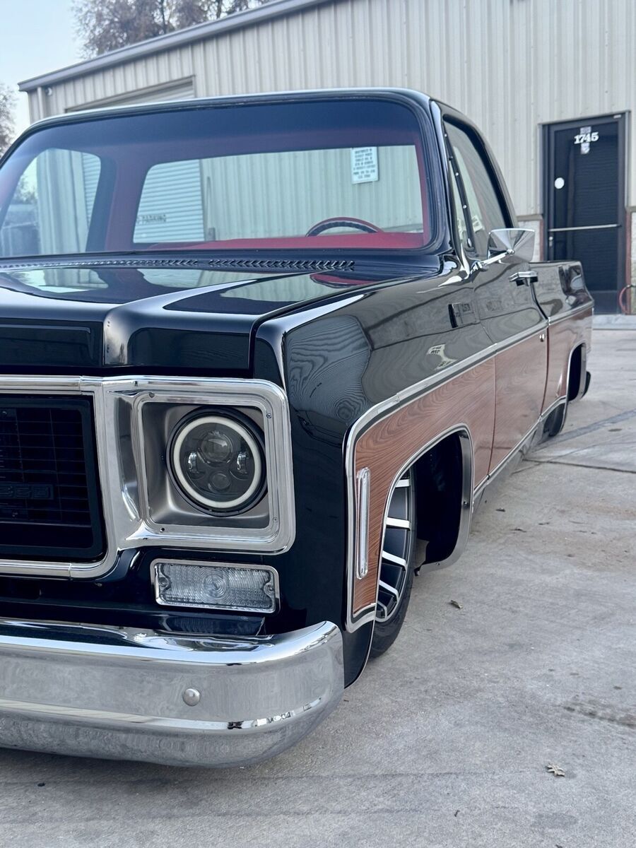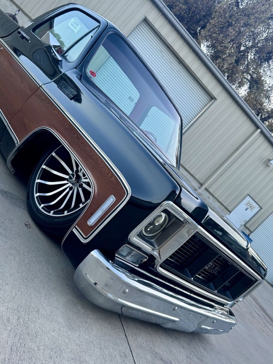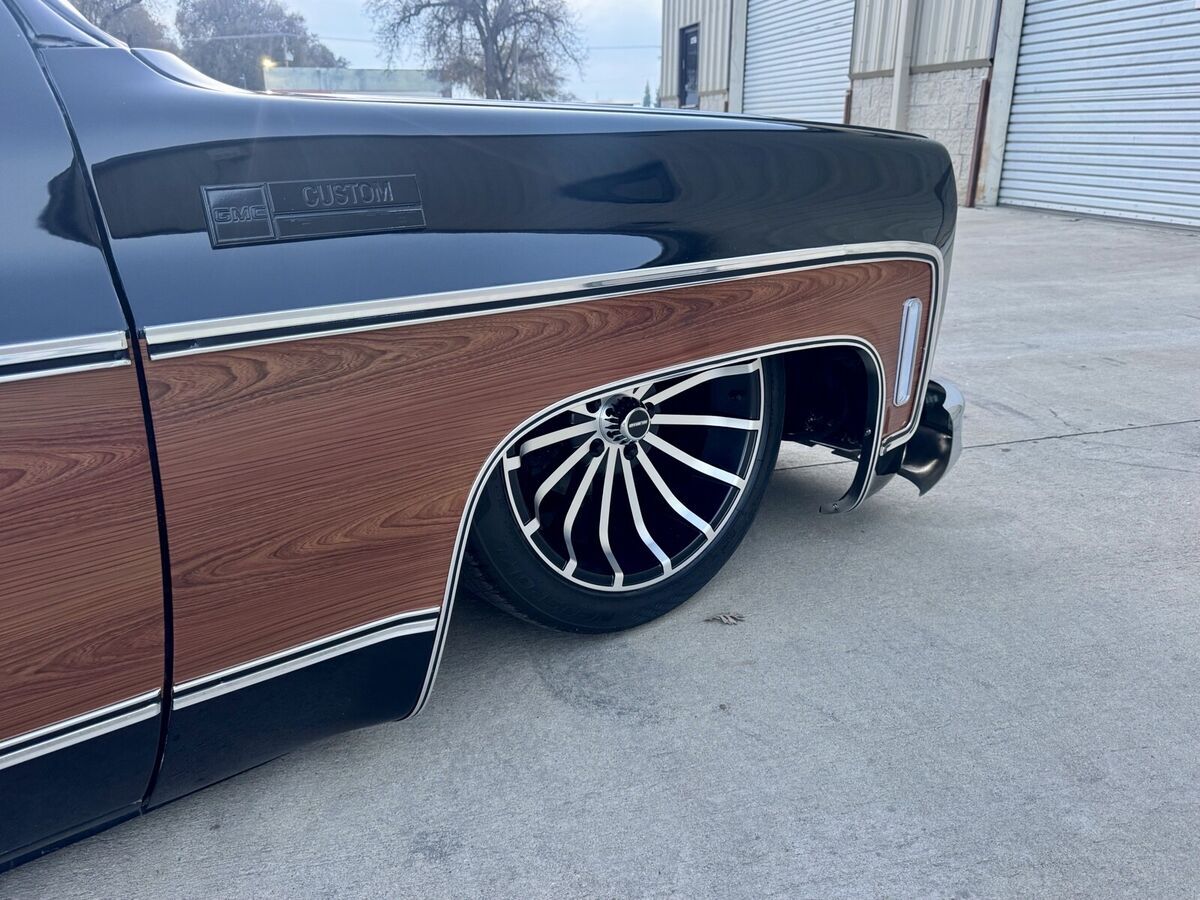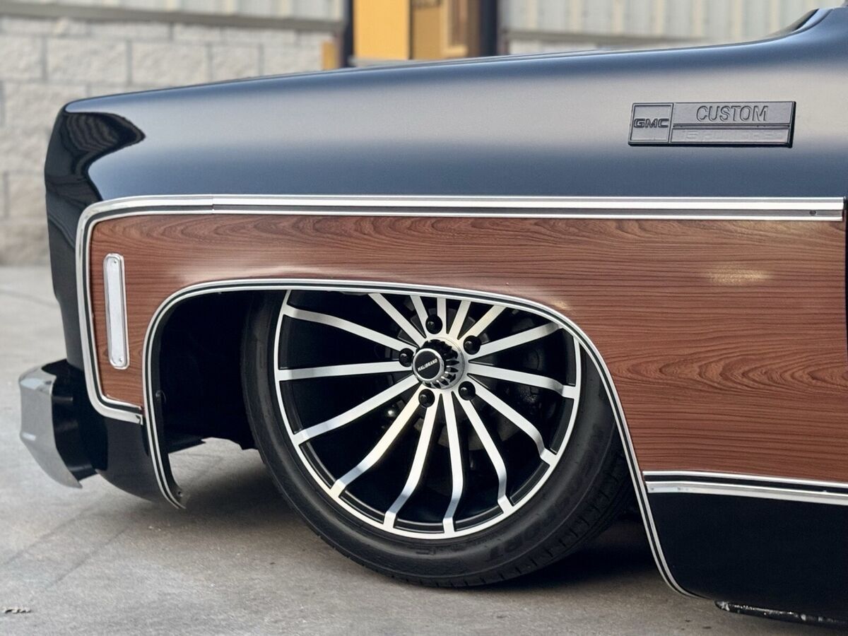 This 1974 GMC Pickup is a black, modified vehicle with updates to the exterior, interior, and drivetrain. The owner has had it for 1 year and has driven it mainly for car shows. It has a clean title and 60000 miles on it. Vehicle Details This 1974 GMC 1500 custom pickup is powered by a fuel-injected Chevrolet 5.3-liter V8 engine backed by a 4L60E automatic transmission. Under the hood has been detailed with some jewelry, such as CVC billet hood hinges, machined pulley kit, custom Holley coil-cover valve covers, holly sniper efi intake, fuel rails and throttle body, aluminum radiator, electric fans, painted to match engine block and custom sheet metal inner fender wells. The suspension has been upgraded to air-ride suspension featuring Slam Specialties air bags, Viair compressors and a Choppin' Block front crossmember setup with tubular control arms, as well as a complete back subframe with 4-link suspension. This pickup's exterior body sports a jet black paint job and Down the center of the cab, it has been vinyl-wrapped in wood-grain to give it that retro Cheyenne look. It features all-new body trim has been installed, along with all-new glass, gaskets and seals have been rebuilt or replaced using Precision replacement parts. The custom wood bed floor highlights the inside of bed. This pickup lays flat on the ground over the perfect-style 20-inch Halibrand wheels. The original interior was replaced with a pair of custom bucket seats and an all-custom-built functional center console, including plenty of storage with cupholders, custom-built kick panels and a sound system with an 8-inch subwoofer enclosure. The entire cab has been wrapped, as well as the entire dash. Squarebody Syndicate and Ididit teamed up to create a custom steering column 2 inches shorter than the factory column, which provides extra room in cab. |