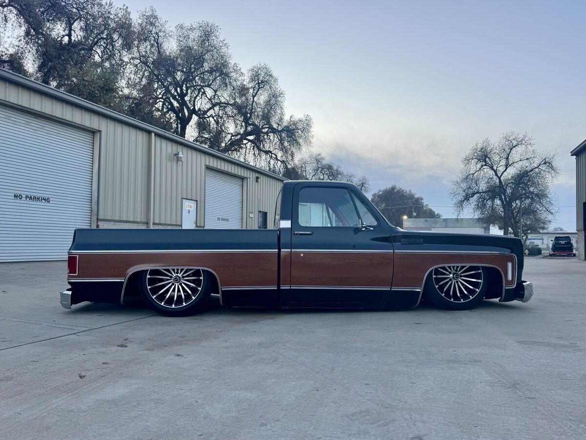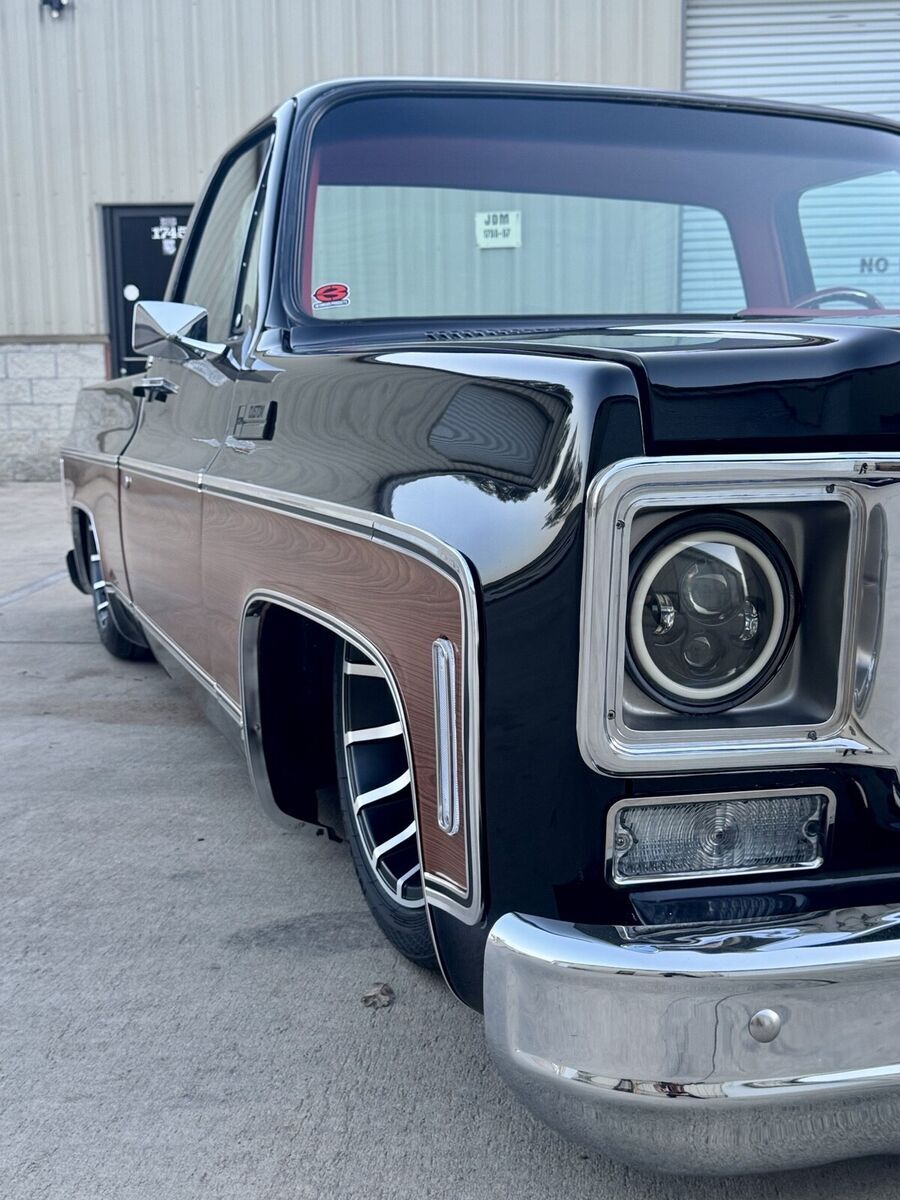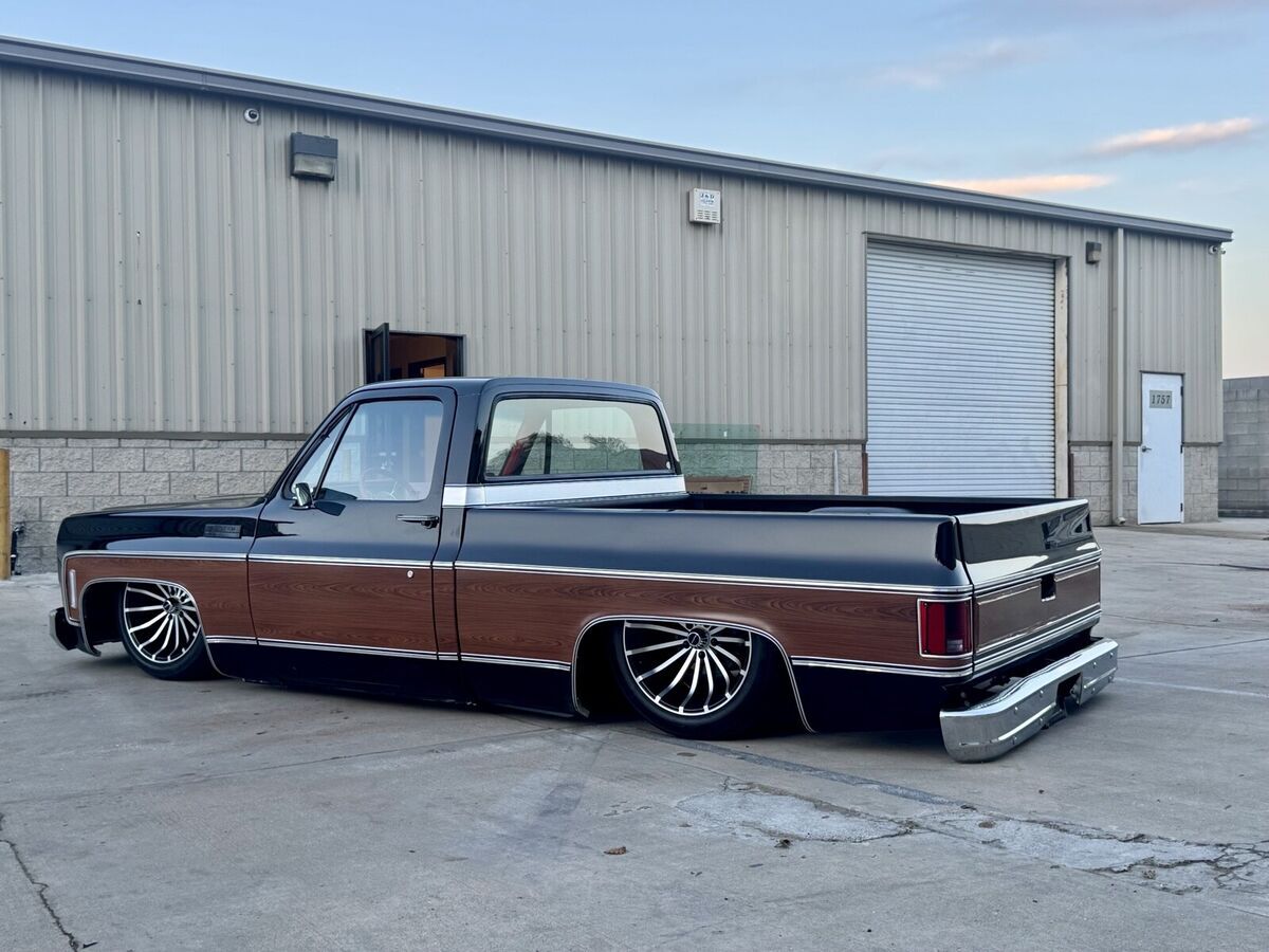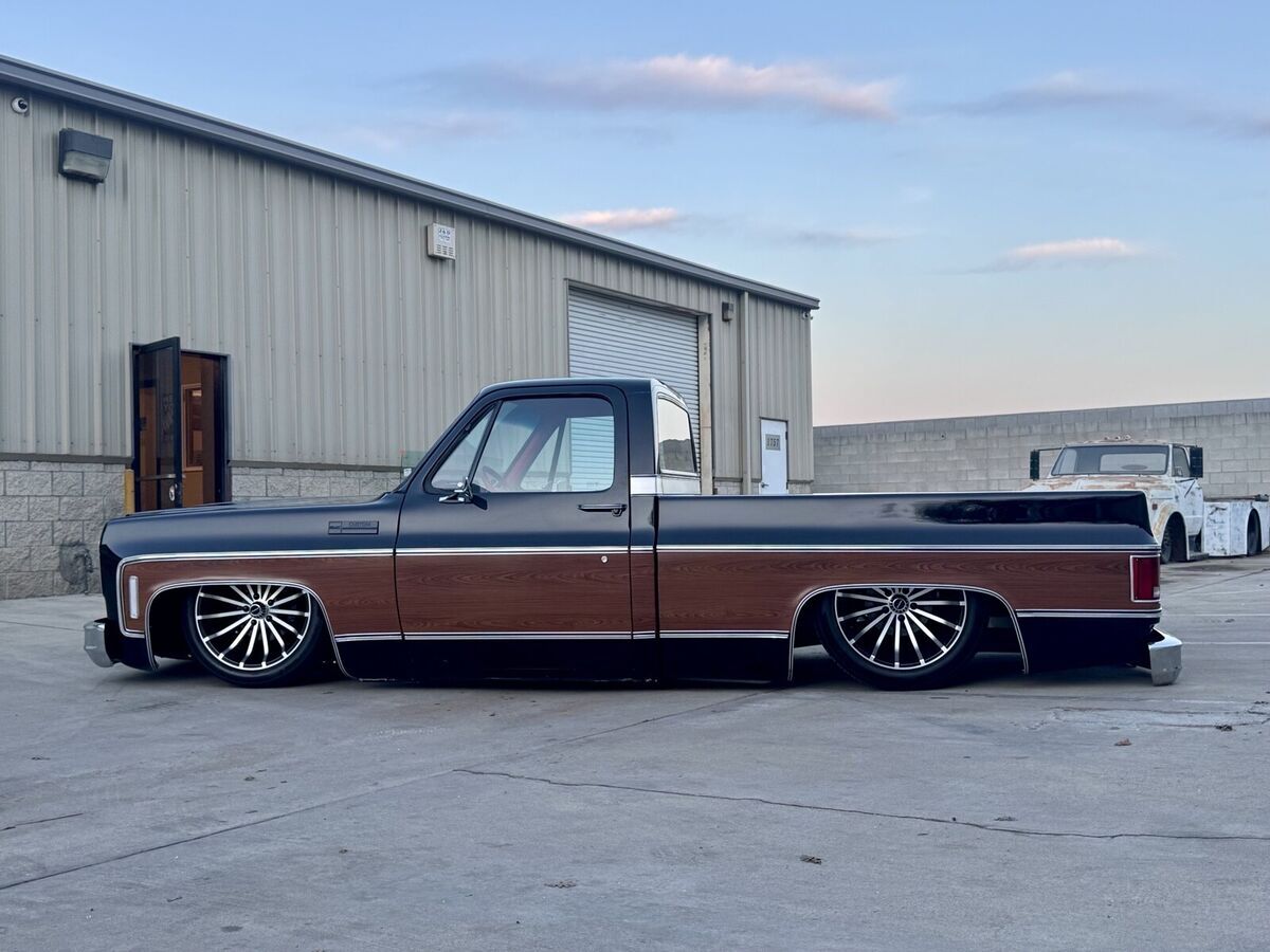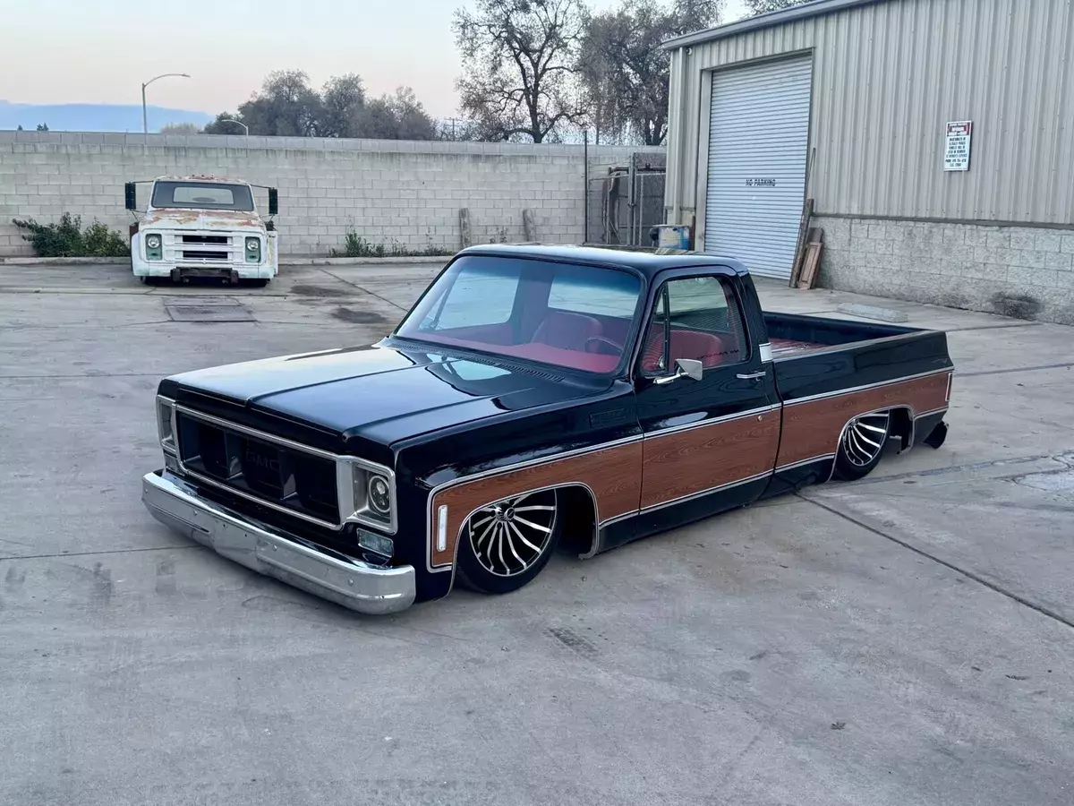 This 1974 GMC Pickup is a black, modified vehicle with updates to the exterior, interior, and drivetrain. The owner has had it for 1 year and has driven it mainly for car shows. It has a clean title and 60000 miles on it. Vehicle Details This 1974 GMC 1500 custom pickup is powered by a fuel-injected Chevrolet 5.3-liter V8 engine backed by a 4L60E automatic transmission. Under the hood has been detailed with some jewelry, such as CVC billet hood hinges, machined pulley kit, custom Holley coil-cover valve covers, holly sniper efi intake, fuel rails and throttle body, aluminum radiator, electric fans, painted to match engine block and custom sheet metal inner fender wells. The suspension has been upgraded to air-ride suspension featuring Slam Specialties air bags, Viair compressors and a Choppin' Block front crossmember setup with tubular control arms, as well as a complete back subframe with 4-link suspension. This pickup's exterior body sports a jet black paint job and Down the center of the cab, it has been vinyl-wrapped in wood-grain to give it that retro Cheyenne look. It features all-new body trim has been installed, along with all-new glass, gaskets and seals have been rebuilt or replaced using Precision replacement parts. The custom wood bed floor highlights the inside of bed. This pickup lays flat on the ground over the perfect-style 20-inch Halibrand wheels. The original interior was replaced with a pair of custom bucket seats and an all-custom-built functional center console, including plenty of storage with cupholders, custom-built kick panels and a sound system with an 8-inch subwoofer enclosure. The entire cab has been wrapped, as well as the entire dash. Squarebody Syndicate and Ididit teamed up to create a custom steering column 2 inches shorter than the factory column, which provides extra room in cab. |