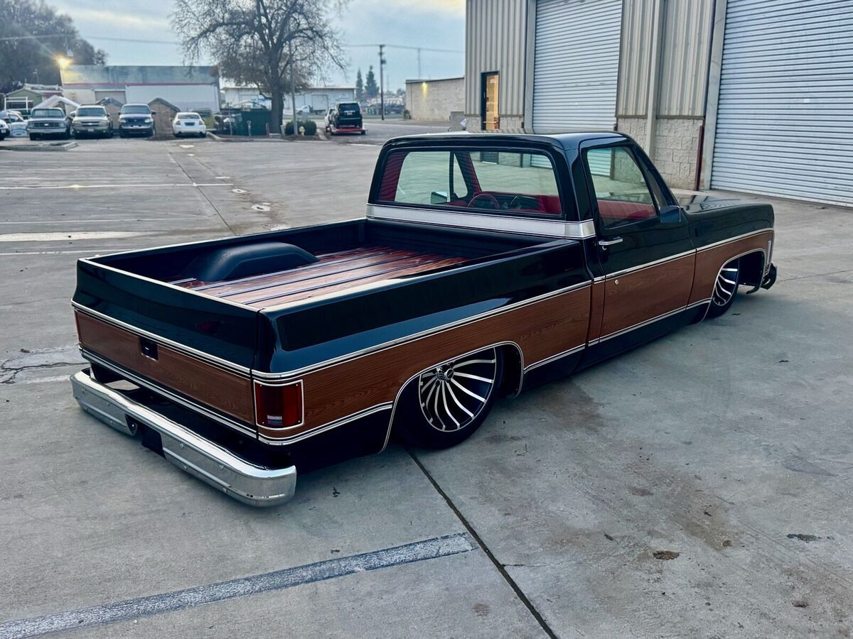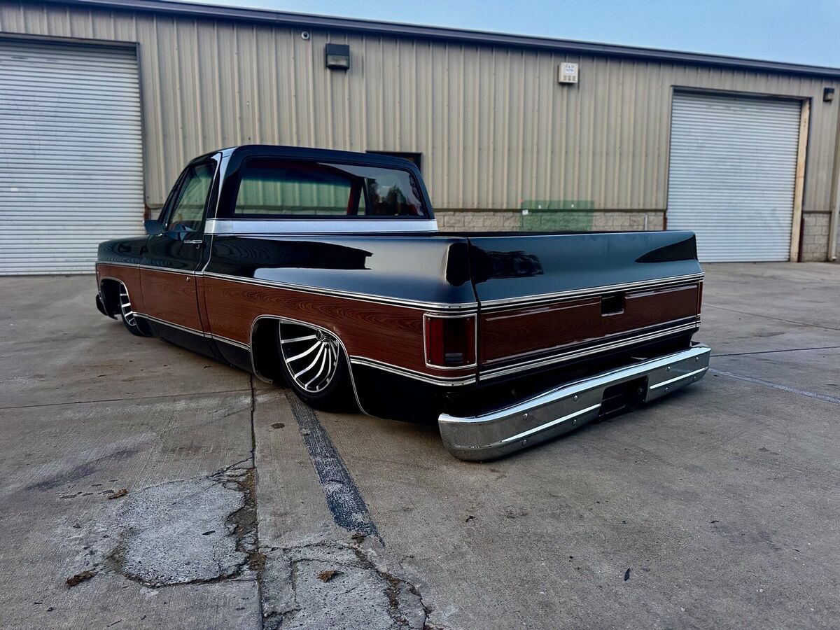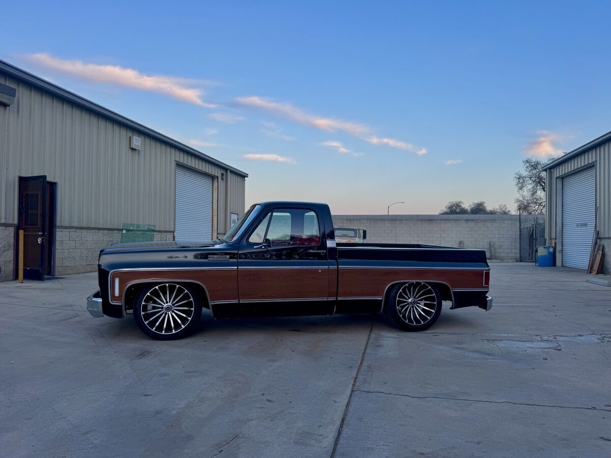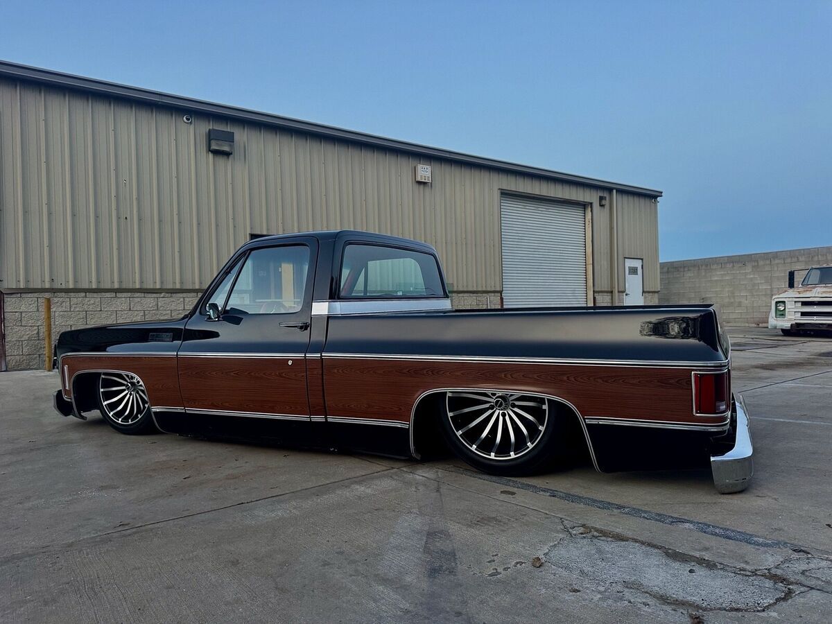 This 1974 GMC Pickup is a black, modified vehicle with updates to the exterior, interior, and drivetrain. The owner has had it for 1 year and has driven it mainly for car shows. It has a clean title and 60000 miles on it. Vehicle Details This 1974 GMC 1500 custom pickup is powered by a fuel-injected Chevrolet 5.3-liter V8 engine backed by a 4L60E automatic transmission. Under the hood has been detailed with some jewelry, such as CVC billet hood hinges, machined pulley kit, custom Holley coil-cover valve covers, holly sniper efi intake, fuel rails and throttle body, aluminum radiator, electric fans, painted to match engine block and custom sheet metal inner fender wells. The suspension has been upgraded to air-ride suspension featuring Slam Specialties air bags, Viair compressors and a Choppin' Block front crossmember setup with tubular control arms, as well as a complete back subframe with 4-link suspension. This pickup's exterior body sports a jet black paint job and Down the center of the cab, it has been vinyl-wrapped in wood-grain to give it that retro Cheyenne look. It features all-new body trim has been installed, along with all-new glass, gaskets and seals have been rebuilt or replaced using Precision replacement parts. The custom wood bed floor highlights the inside of bed. This pickup lays flat on the ground over the perfect-style 20-inch Halibrand wheels. The original interior was replaced with a pair of custom bucket seats and an all-custom-built functional center console, including plenty of storage with cupholders, custom-built kick panels and a sound system with an 8-inch subwoofer enclosure. The entire cab has been wrapped, as well as the entire dash. Squarebody Syndicate and Ididit teamed up to create a custom steering column 2 inches shorter than the factory column, which provides extra room in cab. |
