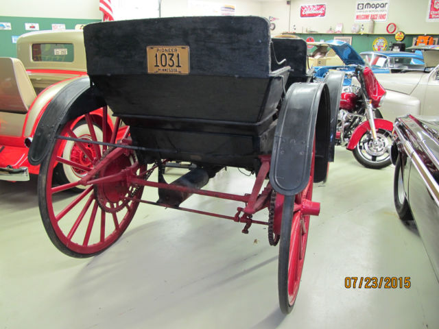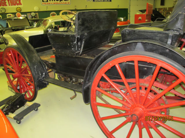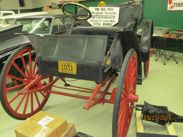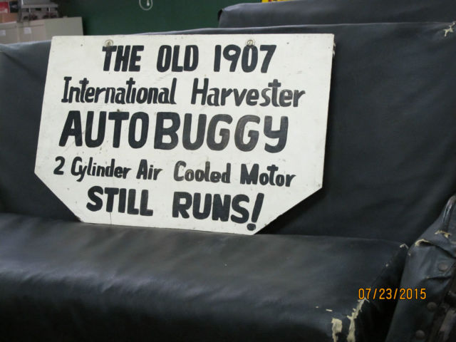 You are bidding on a 1907 International Auto Buggy that has been used in parades until the owner passed away. It is unrestored. Has been stored in climate controlled facility. It has a clear title and is insured SPECIFICATIONS FROM WISCONSIN HISTORICAL SOCIATY "Farmers Auto," Model B, 4 HP. brake test, hich is equivalent to 18 to 20 horsepower in automobile rating. BODY: Wooden, ouble seats, ear seat removable SEATS: 4 persons WEIGHT: 1,650 pounds WHEEL BASE: 84 inches TREAD: J6 inches TIRES, RONT: 40x1 K inches TIRES, EAR: 44x1*4 inches STEERING: Wheel BRAKES: On rear wheels SPRINGS: All full elliptic FRAME: Angle steel CYLINDERS: 2 horizontal cylinders opposed, our-cycle, ive Inch bore, ive inch stroke. VALVES: Mechanically operated MOTOR SUSPENSION: From sub-frame COOLING: Air IGNITION: Jump spark CURRENT SUPPLY: 2 sets dry batteries CARBURETER: Float feed LUBRICATION: Mechanical oiler MOTOR CONTROL: Spark and throttle CLUTCH: External band CHANGE GEAR: Positive clutch SPEEDS: 2 forward and reverse 1 HANGE-GEAR CONTROL: Lever DRIVE: Chain to countershaft and both rear wheels GASOLINE CAPACITY Seven gallons.