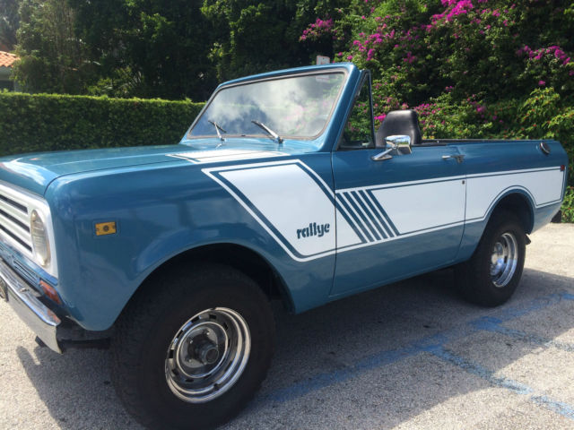 I am listing this beautiful 1979 International Scout II Rallye for a friend of mine. His photos and description are as follows; Freshly restored with new beautiful Concord Blue paint job believed to be factory correct original color. Original IH Line ticket is still in the glove box . Vehicle is a Rallye Edition with original Rallye wheels, actory AC option and factory dual exhaust. Period correct AM/FM radio. Interior is original and in excellent condition. New correct Rallye decals including fender, ood and dash decals. Mechanically in very good condition. The 345 V8 fires right up, xhaust sounds awesome. No smoke, o oil. Transmission shifts smoothly, nd brakes are excellent. No rattles, rives really nice. New tires. No hard top, ut comes with removable soft top. As per previous owner, Vehicle had fully rebuilt axles with all new gears, ifferentials, earing, xle shafts, nd ball joints. Truetrac differentials made for a very capable off roader. Mean Green starter got rid of the heat soak issue that IH motors had problems with. The transmission and transfer case were rebuilt in 2004. Converted the A/C to a 134R compressor, nd put in a new radiator." A spare IHengine is also included in the sale price if buyer so desires (buyer responsible for transport, nd box of misc parts such as '79 grill, eadlights, orking Radio, luid canisters, tc., nd a car cover.Soft top and hardware is in a box and is included in the sale. Known issues are: AC, emperature gauge, riginal radio, nd windshield wipers are not working. 5 digit odometer reads 5,574 butis currently not working. Please call or text Mark directly with any questions at 305-710-7153 or you may email him atmark.ingraham@waingraham.com On Aug-25-15 at 07:17:31 PDT, eller added the following information:***Correction, nbsp;the odometer is working properly and has always been. Miles are actual at 105,574 but reads 05,574 as 5 digit odometer has turned over.*** |