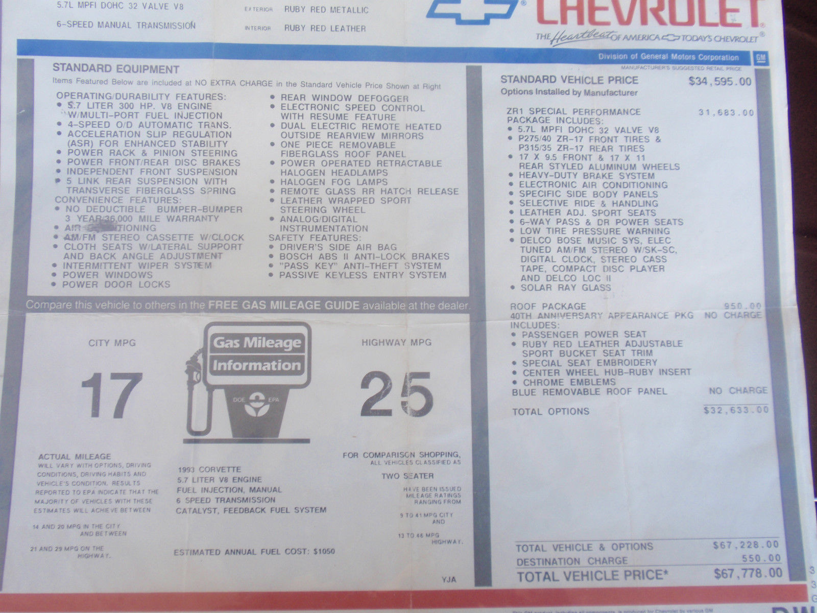 | VERY RARE 1993 ZR-1 40th ANNAVERSARY CORVETTE COUPE. 1 OF 245 BUILT. ONLY 51. 91 MILES AND LOADED WITH ALL OPTION INCUDING BOTH GLASS AND PAINTED TOP AND 4 NEW TIRES. CAR RUN AND DRIVES PERFICTLY AND IS IN EXCELLENT CONDITION !!! |