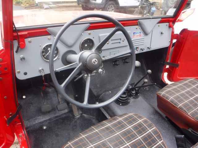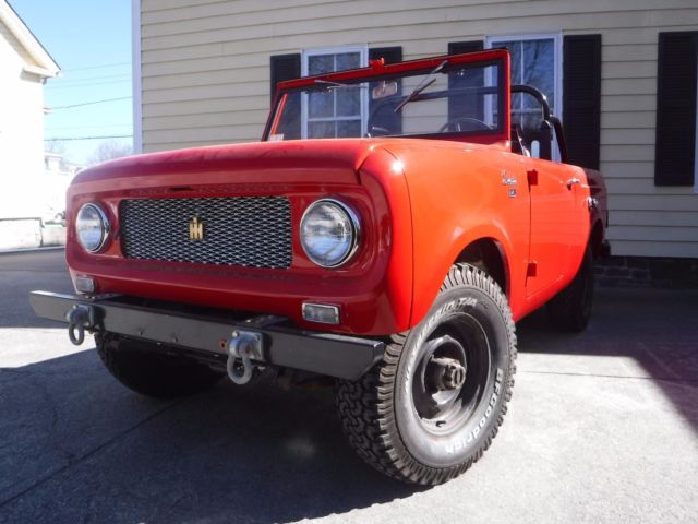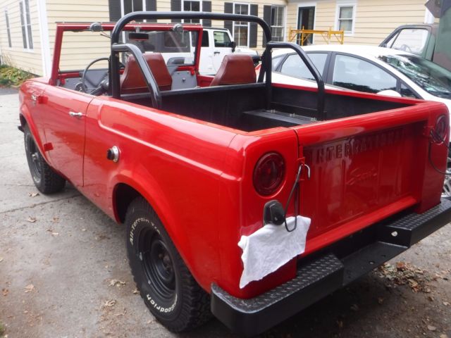 1962 International Harvester Scout 80. Harvester Red with White top, 2015 professional paint job. 152 C.I. 4 cylinder, 3 speed manual, twin stick Dana 18 transfer case with Warn overdrive unit. Dana 27 axles, 4.27 gears with power-lok's. Con-Ferr winch. I have had this truck since 2004 and it has been garaged the hole time. Scout was very solid to start with. The rear bed was rust free, Drivers floor and right rocker panel were replaced with steel repair panels. Small rust holes were repaired with welded in steel. Interior was coated with bed liner. Truck was stripped down as seen in photo and sent to body shop for final work and painting. Body shop reassembled scout after paint. Parts replaced during restoration: BFG tires 31 10.5 R15. Rebuilt transmission, clutch and overdrive unit. Rebuilt carburetor, rebuilt master cylinder, replaced plugs and wires. New front steel brake lines and rubber brake hoses, new rear steel brake lines all but one replaced, new rear wheel cylinders. New thermostat and radiator hoses and several core plugs, new fan belt. New exhaust manifold gasket muffler and pipes. New alternator and extra fuse box, replaced all dash light bulbs, new exterior light gaskets. New fuel filler hose and steel fuel line for driver's side tank, new filter, new fuel caps and filler mounts for both tanks. New glass seals for windshield and 3 top windows. New door seals and seals for top to body. New drive shaft U-joints. New air inlet hoses for heater and vent system. Roll bar with shoulder seat belts custom front bumper. New Shocks. All fluids have been replaced. New Scout and All Wheel Drive fender emblems look really good with the fresh paint job. Needs: right side gas tank and filler hose. Though the exhaust is all new it could use a bit more work to finish its custom routing. Slider door glass weather stripping. Door lock keys. Truck is sold as-is without warranty. $200.00 Paypal deposit within 24 hours and cash on pickup within 1 week. No international shipping. |