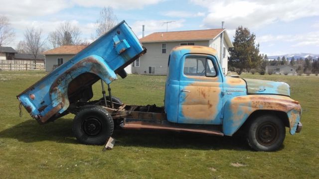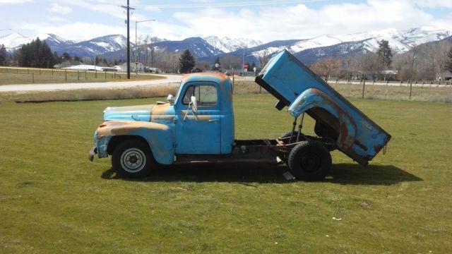 1952 International Harvester pick- up w/electric / hydraulic dumpbe, truck is all original except aftermarket turn signal, dump mechanism and welded in diamond plate bed floor. in-line si, 220 C.I. runs grea, no smoke or weird noise, 4-speed manual trans also in good working order, is a 3/4 ton but has overload springs so it is capable of heavier load, passenger side fender has the worst dent, but all body work can be easily done by most anyone with a little experienc, have used it for the last six months for general yard clean-u, and gravel hauling with no problems . It has "patina" rust all ove, and minor cancer in floor and bed , running boards and cab corners are solid. still has split rim, and 4 new inner tubes. currently using electric fuel pump but have the working mechanical pum, card is rebuilt origina, still has 6 volt , positive ground electrical system