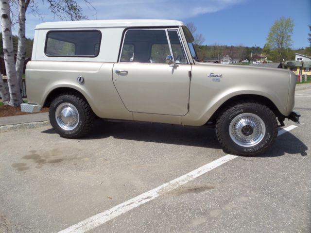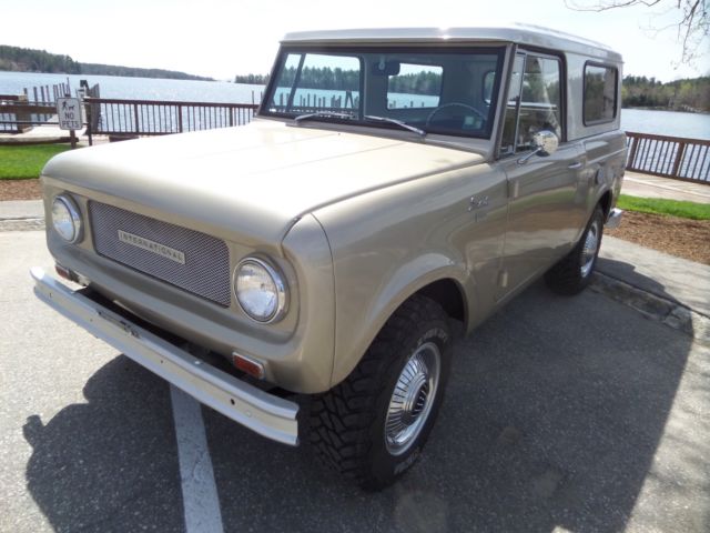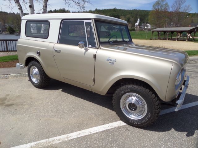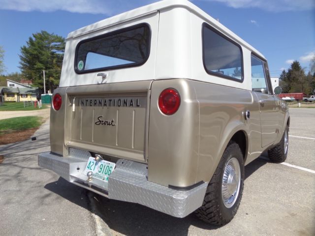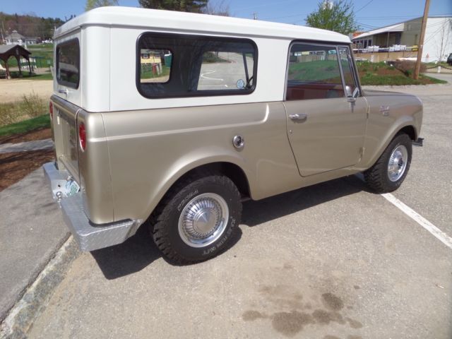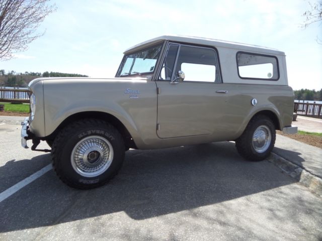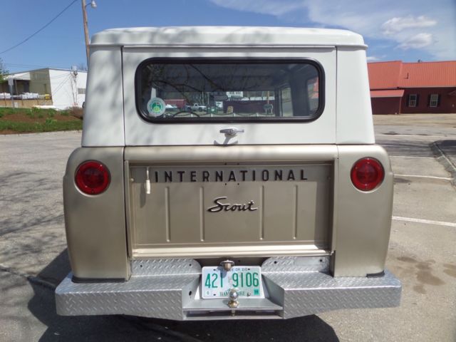 Up for is this beautiful 1966 scout 800 with its original 2.5 liter peppy 4cyl engine and a 4 speed standard transmission. This little beauty spent a major part of its life in the dry Texas climate with zero signs of rust! This scout has received a full going over including a new paint job in its factory color. Thetop and all glass was removed when painted and reinstalled with all new rubbers and gasket. The body was taken down primed and then painted in a base coat and clear while the top was painted in a bright white, it looks great! Everything in this scout works as it should lights,horn,heat,speedometer, interior gages, except gas. The frame and underside of this scout are also in great condition with no patchwork whatsoever. The transmission and transfer case shift smoothly and locking hubs have been rebuilt and turn with ease.New brakes,gas tanks,shocks,tires seals and more! This is a turn key get in and go scout needing nothing. Very rare do you find one in this cond!