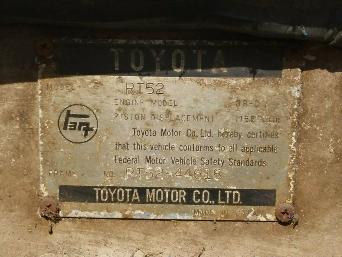 | 1968 Toyota Corolla Deluxe two-door very rare 76000 miles floors look good seats need to be redone these needs to be cleaned up not seeing very much rust there is some on the very top. this model is hard to find it dose run no title comes with bill of sale text me for more photos at area code 541-761-4507 I can store the car up to 2 months after you pay for it looks like everything's there for the car motor tranny rear and front ends everything this would be a great project and 1968 Toyota Corona you don't see these. No title video of it running did I mention the tires still have the Nabis on them they're like brand new . |