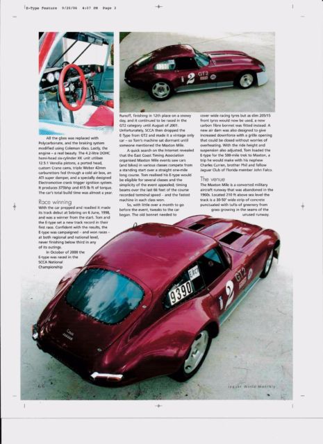 To See More Go To: ultimatecarorbike dot com Rare Opportunity to purchase a well sorted, how winning, rack proven,E-TypeVintage Race Car. ThisE-Typehas been perfected through many generational upgrades to bring it to its stunning quality of build with only the best of the best utilized. This car was many time Track Champion at Mid-Ohio and competed at many tracks throughout the north and southeastern tracks. This car was completely freshened up with zero race hours before being put up in a private museum. This car comes with its log book and is ready to Race, our, isplay, nd Show. This full blown race car is still titled with Ohio registration and can be licensed for the street !! Just review the build list and you'll see the value this car carries...... Engine: 4.2ltr with a .30 overbore, ometic-Head Gasket, arrilo Rods, 2.5 to 1 CR Venolia Pistons, acing Valves, ardened & Balanced Crank, ully Ported, ace Cams, Weber Carbs, am Air Box, uned Exhaust Headers, ry Sump, igh Output Gear Reduction Starter, lectronic MSD Ignition, ingle Wire Dash Switchable Alternator to power lights when needed, ustom Aluminum Radiator,Cockpit Adjustable Ignition Timing.....Drive Train; Aluminum Flywheel, ilton 3 Disk Clutch, uncie Close Ratio 4 Speed Trans with spare trans, luminum Driveshaft, .5 Posi Differential, oil Over Adjustable Shocks......Suspension; Series 3 Brake Pads with 4-piston Front Calipers, ilton Suspended Brake and Clutch Pedals with Girling Master Cylinders, ented Discs with Ducted Air, eavy Duty Front Spindles, eavy Duty Torsion Bars and Rear Springs, ptional Rear Sway Bar, ery Rare 3 Piece Bogart Racing Wheels.......Body and Interior; Carbon Fiber Bonnet, luminum Doors, luminum Floor Pan, luminum Rocker Panels, 2) Aluminum Seats, lack Leather Upholstery, Point Camlock Red Seatbelts, uto Meter Gauges, xtensive Use of Chrome Moly Tubing Including Race Legal Roll Bar, lexi-Glass Rear Hatch, orsche Guards Red, e-Positioned Front Screen/Pillars for more aerodynamics, idened Rear Fenders.......Registration; SVRA #3044, og Book Included. |