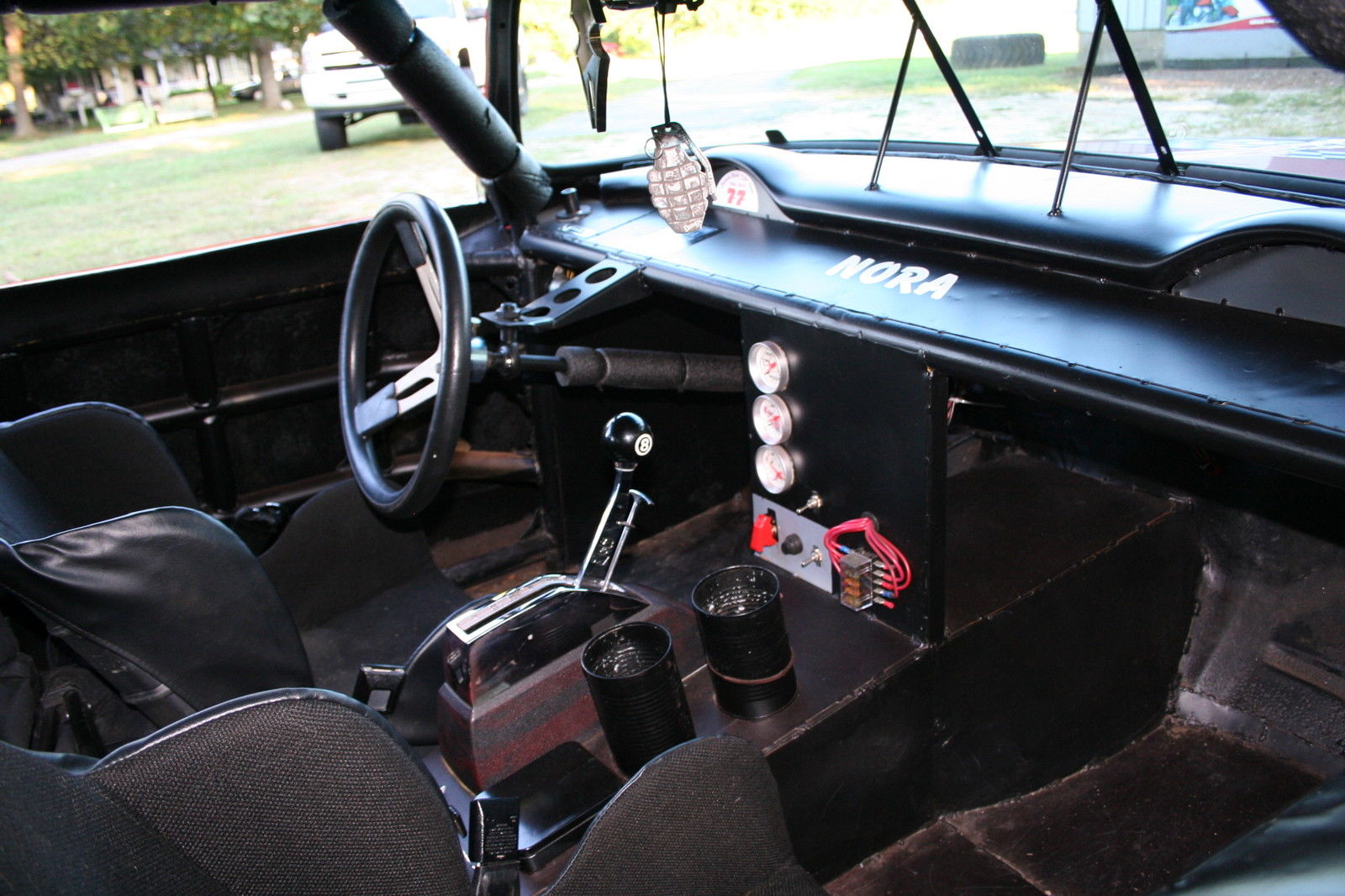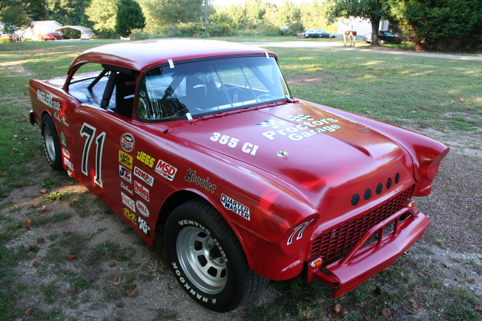 | 1955 Chevrolet two door hardtop converted to a street legal race car. The car has been signed by Dave Marcis. It is sitting on a 1986 Chevy Caprice chassis. It has a 355 racing engine with a automatic 350 turbo transmission. It has a set of hooker headers. 900 springs in the front. front disc brakes. and a Z Gate shifter. It has a set of 15 inch Kurt Busch Talladega Wheels. It is also equipped with an 8 point roll cage front to rear and racing seats. You can take it down the road or around the track. Title in hand. If you have any questions or would like to view the car please feel free to email me. Thanks Eric |
