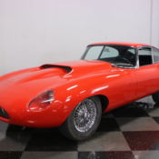 Ok, everyone be cool. This 1964 Jaguar XKE coupe isn't for purists but it is for the guy who loves the shape but wants to live a little outside the box. With just 18k believed original miles, a reliable and potent Ford 5.0 power and a few tasteful body modifications, the sinewy Jag takes on an entirely new personality, one that we're pretty sure you're going to love.It ain't subtle, not with the bright red paint and that giant hood scoop, but from any angle, this is a gorgeous car. With shaved bumpers and door handles, it takes on the look of the early E-Type racers, a no-frills look that's incongruous with the luxury-oriented Jaguar we know today but perfectly in line with where it was in the early '60s. The body is 100% steel, no fiberglass junk, and the fit and finish is rather impressive, certainly worthy of a car like this. And you can't argue with bright red on a high-performance Jaguar when it looks this good. It's impossibly shiny, the bodywork was smoothed and straightened until the reflections looked like a mirror, and you can't tell where the aftermarket hood scoop ends and the factory sheetmetal begins. It's really impressive. Of course, details like the enclosed headlights, mesh grille with late-model leaping cat logo, and cleverly hidden taillights give it a very smooth look that's 100% Jaguar.The interior is wonderfully authentic, and unless you know Jaguar didn't offer an automatic transmission in 1964, it might go completely unnoticed. The early-style shell bucket seats are wrapped in black leather that looks spectacular and the rest of the trim is just the way Jaguar would have done it themselves. The door panels are simple and elegant, the carpets are plush enough to feel luxurious but not get in the way of serious driving, and yes, all the original Smiths gauges are still in the dash except for a modern oil pressure dial. A Moto-Lita wheel is wrapped in more black leather for a sporting look and the modern Ford automatic shifter is beautifully integrated into the original console. There is no radio, but you wouldn't have used it anyway, and the doors open with remote door poppers, a hot rodding trick that works rather well here. The coupe's cargo bay isn't huge, but it's useful for touring and neatly finished in matching black carpets.Purists look away now, because the beloved 3.8 liter six is long gone, having been replaced when it died during it's only owner's temporary transfer away from Texas to Hawaii, and due to a lack of parts, was replaced with a Ford Motorsports 5.0 liter V8 crate motor. Making roughly 50% more horsepower than the original it's a tidy fit in the E-Type's engine bay and totally transforms the car. Fed by an Edelbrock 4-barrel carburetor and using headers that weave around the frame extensions, it's beautifully installed. There's a big aluminum radiator so no more fussiness there, and the workmanship is very nicely done. It's backed by a Ford AOD 4-speed automatic transmission which really helps it sip the fuel, and the original independent rear end was deemed robust enough to handle the torque. The front suspension is also Jaguar, so it retains its sublime ride quality and sharp handling with an old-school feel. Disc brakes all around handle the stopping and there's a throaty dual exhaust system that sounds a bit different than what you'd expect. Gorgeous wire wheels with knock-off centers and 215/70/15 blackwall radials complete the look.This is a beautiful car no matter how you feel about the upgrades. If turn-key fun is what you're looking for, this is a bulletproof Jag that will surprise more than a few onlookers with its moves. Call today!