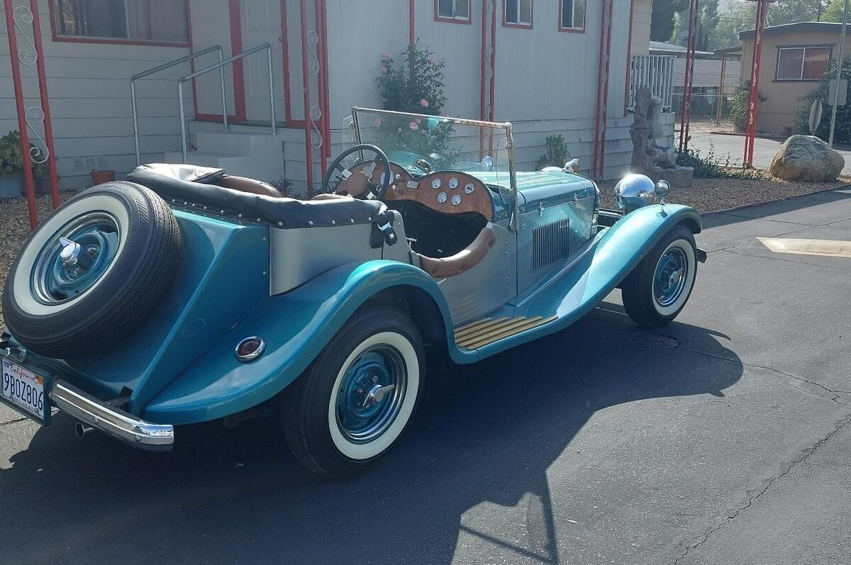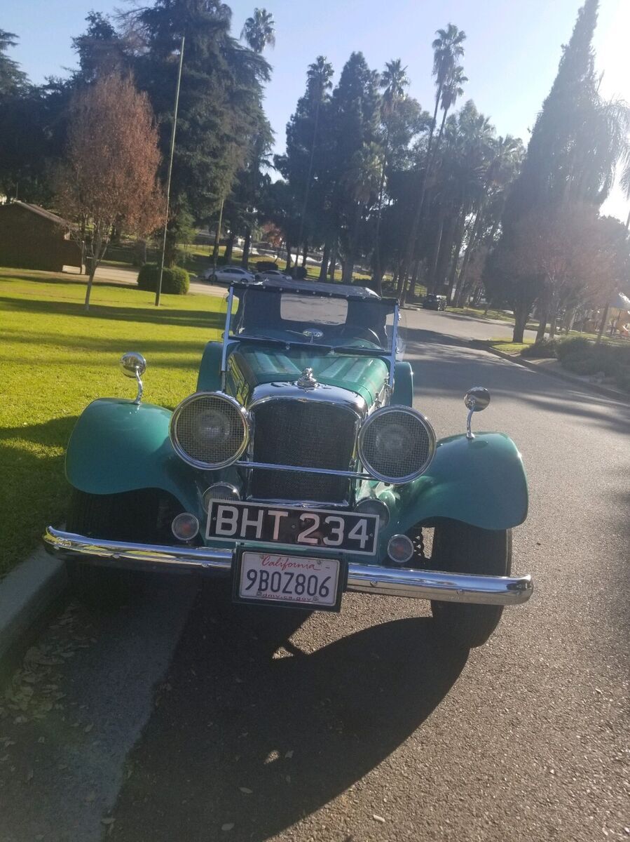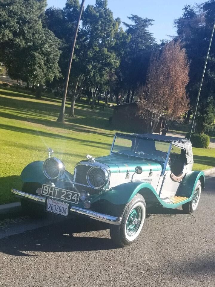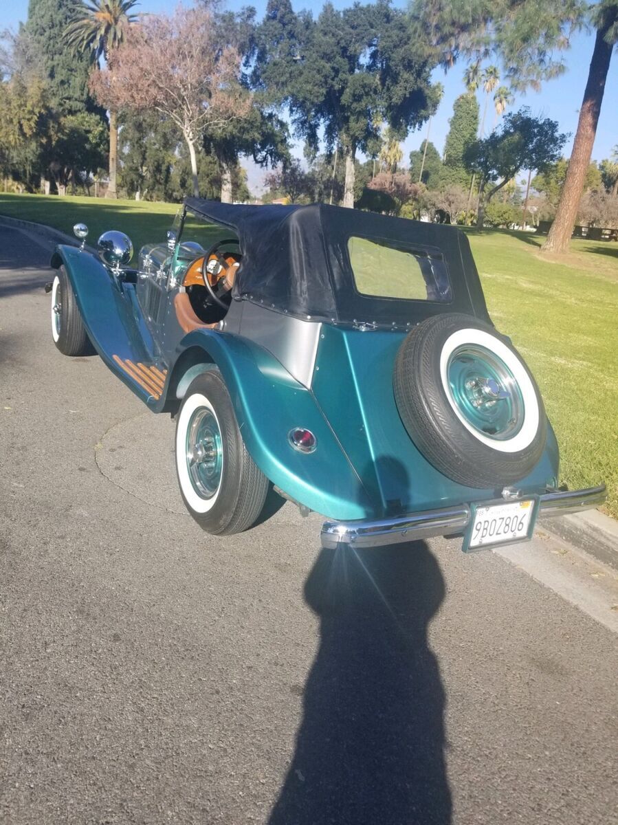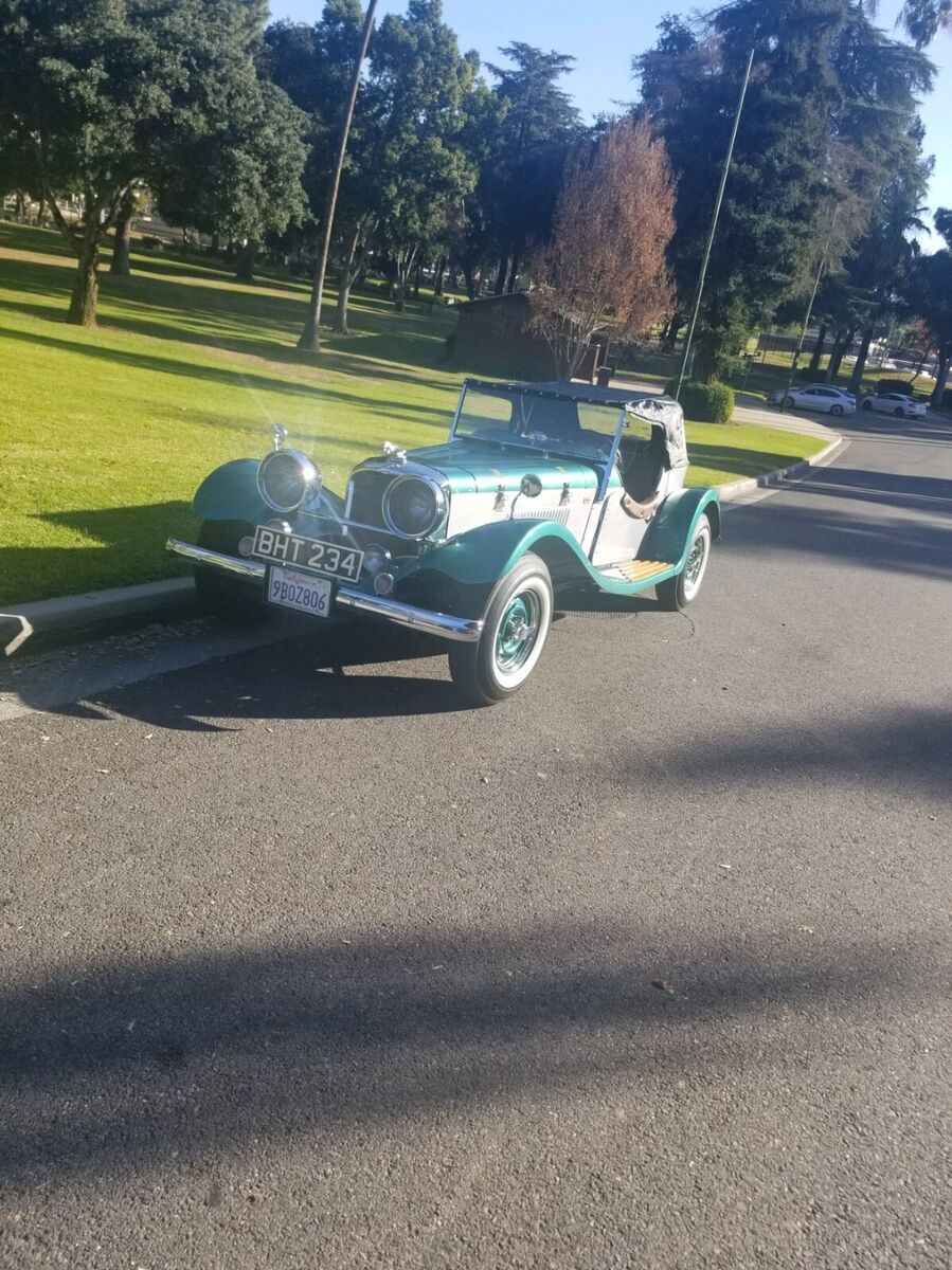 1938 Jaguar ReplicarBuilt on and using a 1974 Ford Mustang frame and running gear. The 4-cylinder engine and automatic transmission provide more than enough power to move the fiberglass Jaguar body down the road bringing her to a stop with manual breaks. The interior and top are pristine as can be seen in the photos. The e-break will need adjustment and the gas tank sending unit is finicky about always working. The Emerald Green and Silver paint enhance the chrome from the taillight bezels to the headlight bezels and grill. The hood louvers and hold-down straps have been accented using detailed pin striping. The color matched wheels are accented with beauty rings and two winged knockoffs shod with 14" WW tires. Roadster, classic, kit car |