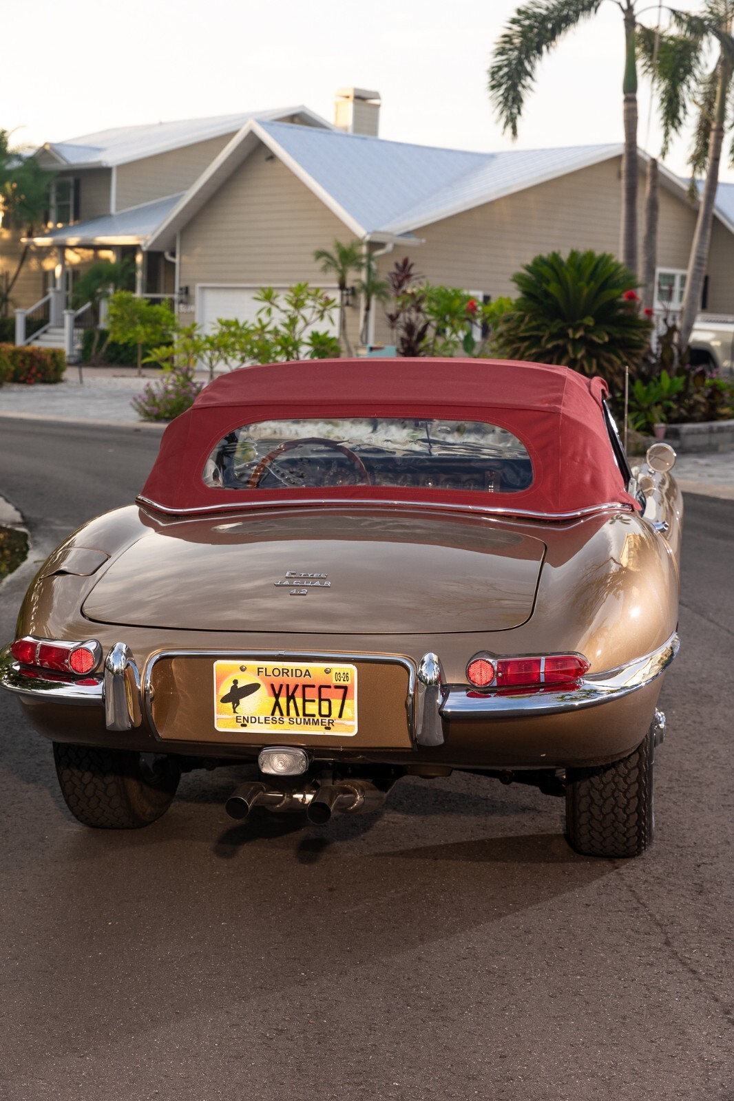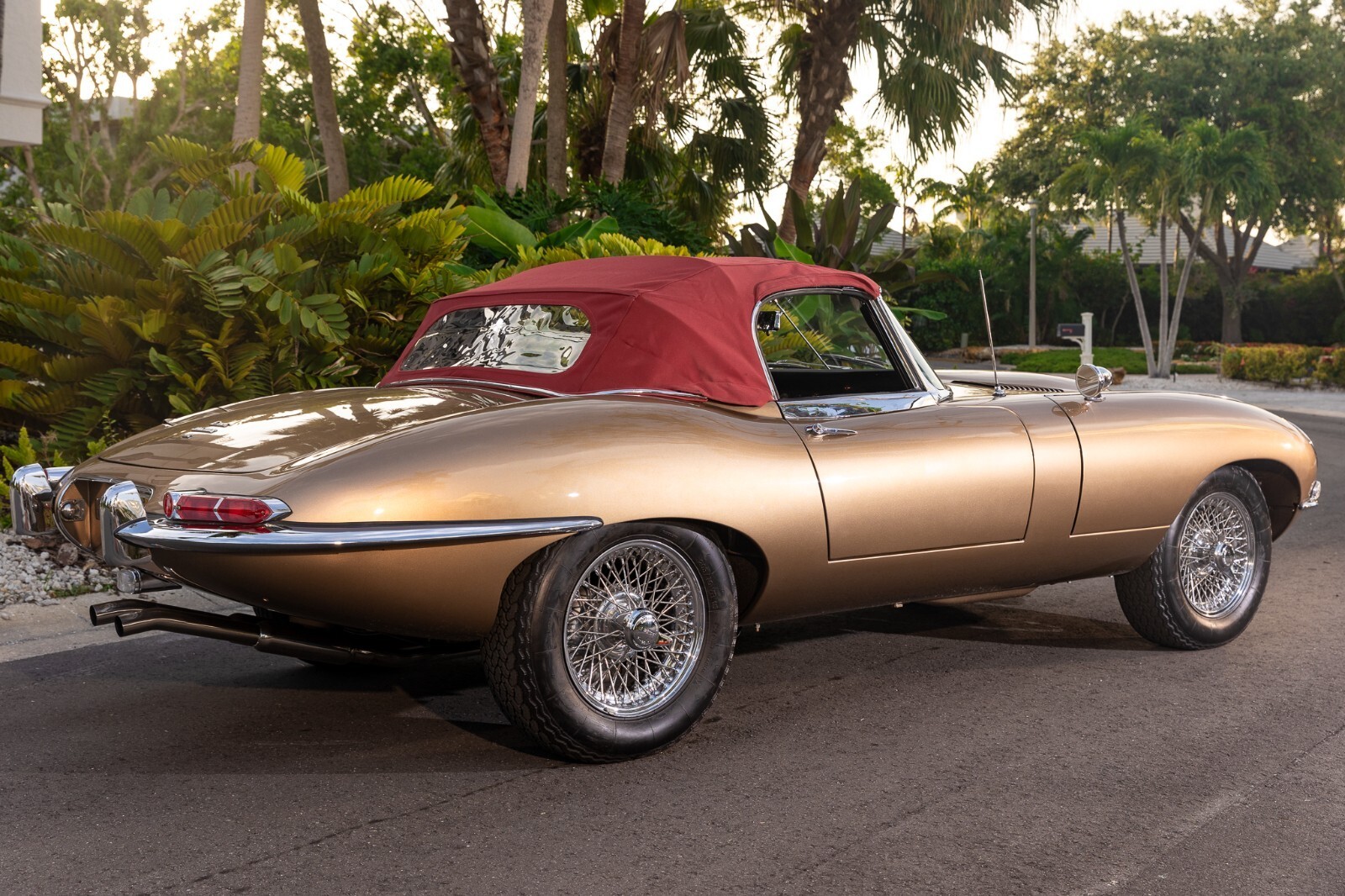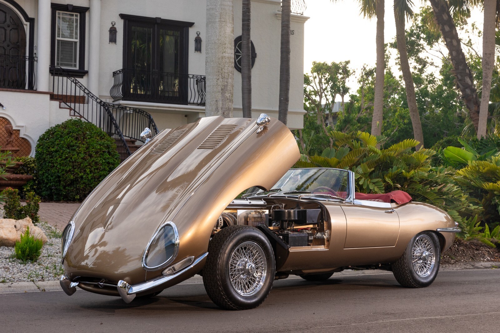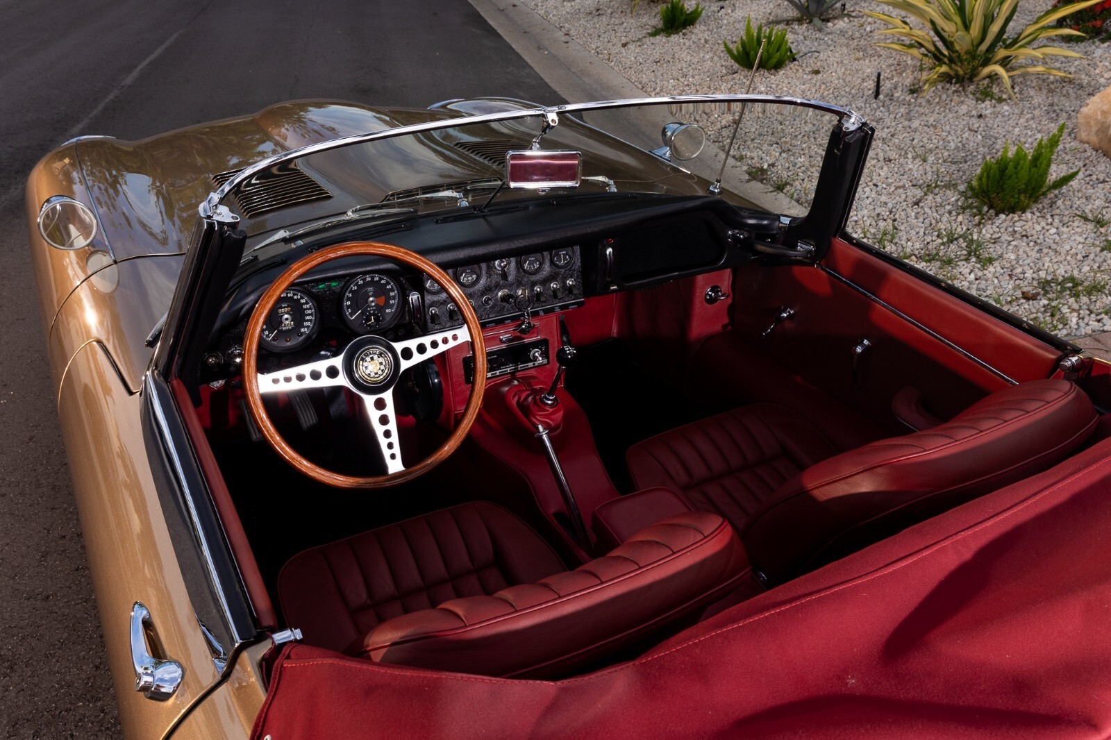 This 1967 Jaguar E-Type Series 1 4.2-Litre Roadster was built on 14 October 1966. A left-hand-drive example destined for North America, this open two-seat roadster left the factory finished in Opalescent Golden Sand over a Red interior with a Sand convertible top. It was dispatched on 16 November 1966 and distributed through Jaguar Cars, New York, USA. Just a two-owner example from new, it was purchased by the consignor in 1973. A comprehensive multi-year rotisserie restoration was completed in 2021. The car was refinished in its original shade of Opalescent Golden Sand, now complimented by a red convertible soft top. Exterior features include dual Talbot-style sideview mirrors and chrome knock-off wire wheels. The interior was retrimmed back to its original red leather, and it is equipped with a modern JSD-20158 radio unit and also includes a period 70s stereo/8-track unit. Two shift knobs are included with the car: One traditional black with white lettering, and one custom wooden knob with a 1967 gold Kennedy half dollar. According to its accompanying JDHT certificate, this Jaguar is an allnumbers-matching chassis, engine, cylinder head, and gearbox example. The drivetrain has been completely rebuilt and the previous American gear ratio (3.54) has been changed back to the British gear ratio (3.07), so the top speed has been upgraded from 135 to 155. Included with the car is a detachable hardtop, tools, jack, and literature. The Jaguar E-Type remains one of the most celebrated British sports cars of all time. This example, finished in a seldom-seen factory color combination, and having benefitted from a multi-year restoration, would make a fine addition to any collection.