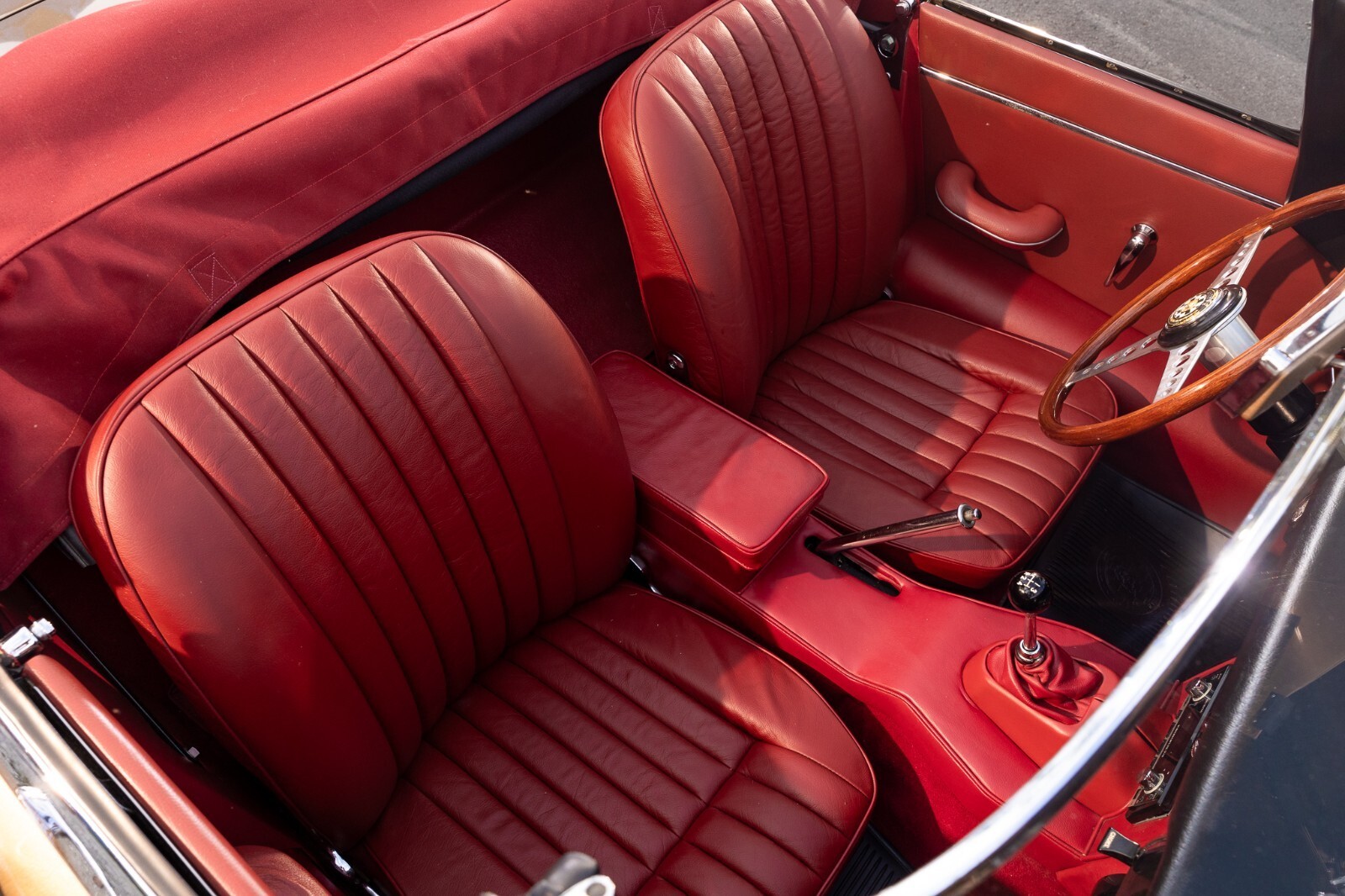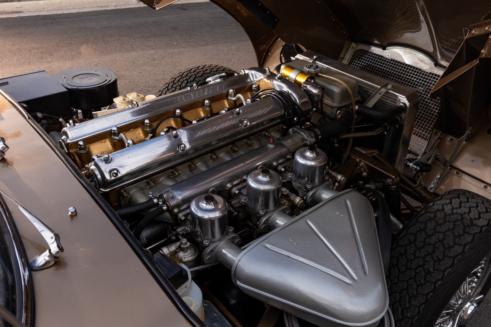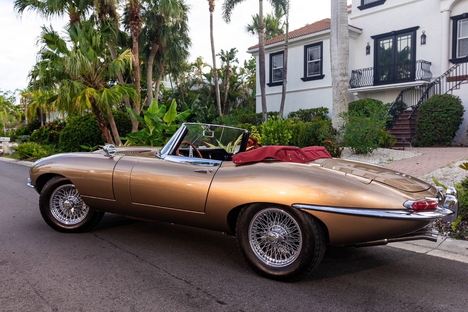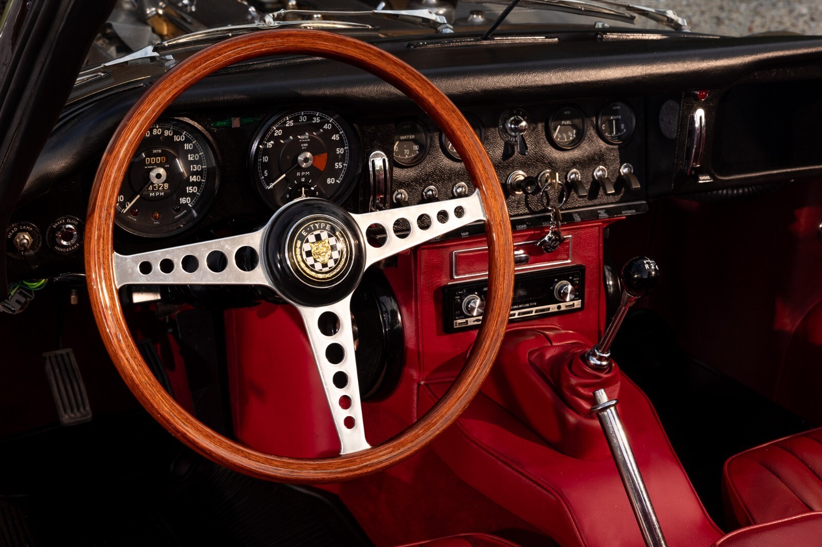 This 1967 Jaguar E-Type Series 1 4.2-Litre Roadster was built on 14 October 1966. A left-hand-drive example destined for North America, this open two-seat roadster left the factory finished in Opalescent Golden Sand over a Red interior with a Sand convertible top. It was dispatched on 16 November 1966 and distributed through Jaguar Cars, New York, USA. Just a two-owner example from new, it was purchased by the consignor in 1973. A comprehensive multi-year rotisserie restoration was completed in 2021. The car was refinished in its original shade of Opalescent Golden Sand, now complimented by a red convertible soft top. Exterior features include dual Talbot-style sideview mirrors and chrome knock-off wire wheels. The interior was retrimmed back to its original red leather, and it is equipped with a modern JSD-20158 radio unit and also includes a period 70s stereo/8-track unit. Two shift knobs are included with the car: One traditional black with white lettering, and one custom wooden knob with a 1967 gold Kennedy half dollar. According to its accompanying JDHT certificate, this Jaguar is an allnumbers-matching chassis, engine, cylinder head, and gearbox example. The drivetrain has been completely rebuilt and the previous American gear ratio (3.54) has been changed back to the British gear ratio (3.07), so the top speed has been upgraded from 135 to 155. Included with the car is a detachable hardtop, tools, jack, and literature. The Jaguar E-Type remains one of the most celebrated British sports cars of all time. This example, finished in a seldom-seen factory color combination, and having benefitted from a multi-year restoration, would make a fine addition to any collection.