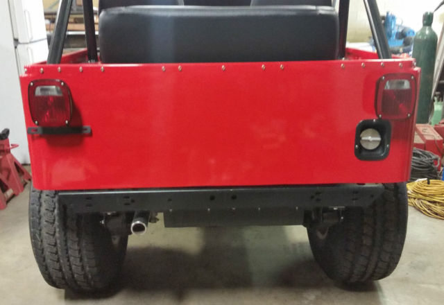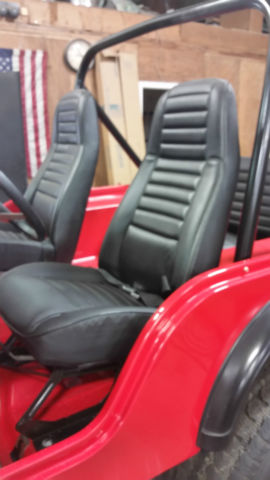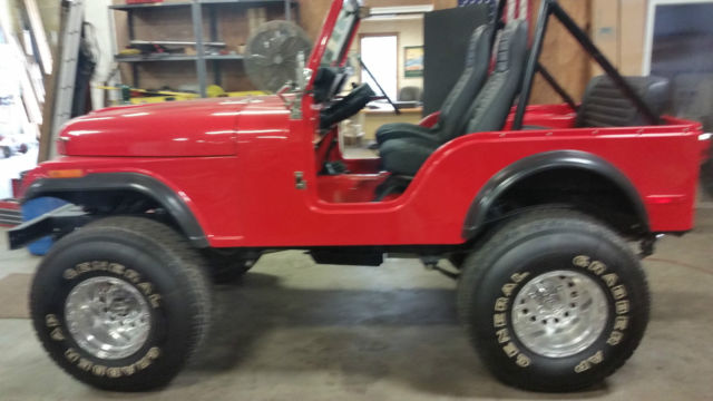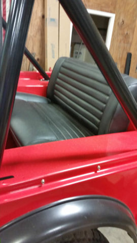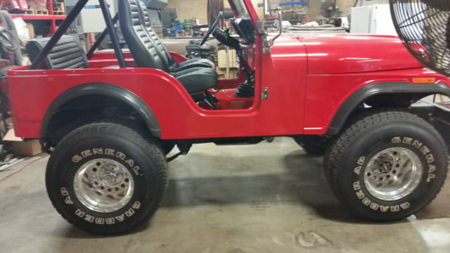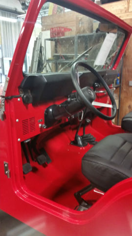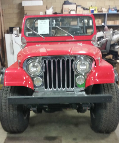 | 1979 Jeep CJ 5. Total frame off rebuild. All fiberglass body except the grill. 4 wheel drive hardware body. Late model high back bucket seats. AMC 360 V8 with only 40,000 miles on it.3 spd. manual transmission with Dana 20 transfer case. Base coat clear coat paint job.Engine has Edlebrock high rise aluminum intake and carb. 4 inch lift kit.new battery.Vin No. J9F83AC034487. |