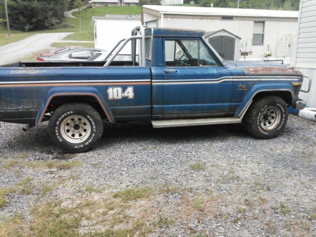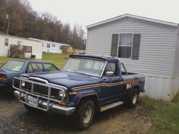 | i have a 1979 jeep j-10 needs a little work but is an awesome truck ...quadratrac 4 wheel drive has the 360 in it ..got bed rust and fender rust but other than that good body...needs carburetor rebuilt been sitting for almost 5 years ...master cylinder is leaking so no brakes...might need to go thru tranny cause its been sitting so long..truck does start and drive but would not recommend driving it anywhere of any distance..also have original air cleaner and fan shroud just have them off cause i was working on it...new double roller timing chain ..frame does not have rust like some does tried to take pictures but my phone doesnt like the dark for some reason.. |