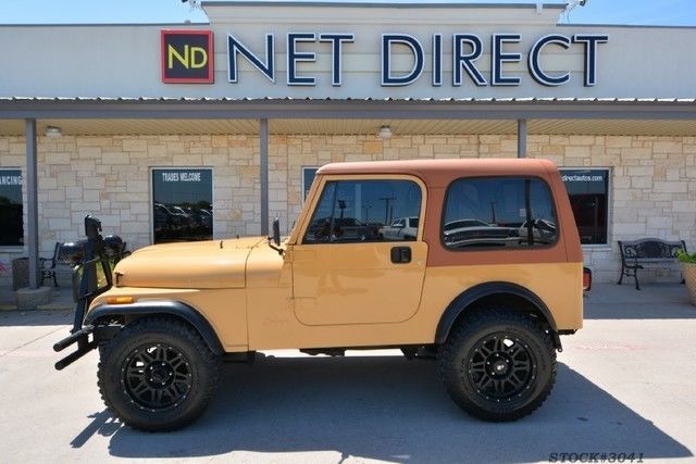 Net Direct Auto Sales in Fort Worth, exas is happy to bring you this classic 1985 AMC CJ7 Base Jeep Wrangler 4X4 SUV for sale. This Jeep has a professionally installed GM performance ZZ4 350 crate engine (355hp), ith headers, acked by a turbo 350 automatic transmission with a B&M torque convertor and shifter with approximately 5000 miles. Resting comfortably on 17” Pro Comp wheels and LT255/75R17 BF Goodrich tires,and equipped with a brown hard top,this Jeep is prepared to tackle the road under any conditions. This fantastic Jeep also has recently installed Rancho shocks, :10 gears with Locker in the rear axle and True Track in the front axle, new heater core a winch, nd a new 15-gallon plastic fuel tank. There has been over $25,000 invested in this Jeep Wrangler. We at Net Direct Auto Sales are dedicated to customer service, atisfaction and retention. Give our knowledgeable sales team a call or send them an email to ask how you can get into this Jeep Wrangler today. We pledge to return every email or phone call. Call Today Most of our auctions endearlywith a phone call! CALL NOW TO BUY IT NOW! 855-395-7538 Here at Net Direct Auto Sales, e are dedicated to serving you! Call one of our friendly sales staff today! We Finance! We Ship! You SAVE! PHOTOS [zipedit][zipedit] [zipedit] [zipedit] [zipedit] [zipedit] [zipedit] [zipedit] [zipedit] [zipedit] [zipedit] [zipedit] [zipedit] [zipedit] [zipedit] [zipedit] [zipedit] [zipedit] [zipedit] [zipedit] [zipedit] [zipedit] [zipedit] [zipedit] [zipedit] [zipedit] [zipedit] [zipedit] [zipedit] [zipedit] [zipedit] [zipedit] [zipedit] [zipedit] [zipedit] [zipedit] [zipedit] [zipedit] VITALS Year Make Model Mileage 1985 Jeep CJ 4WD SUV 40,443 Exterior Interior Stock # VIN Tan Black Leather 3041 1JCCF87E8FT111784 Engine 2.5L 4-Cyl Engine DEALER CONTACT Net Direct Auto Sales Ask Dealer A Question If you have a question, lease call or complete the form below for a quick response. Name Email Phone Question(s) About UsLocated in the heart of the Dallas-Fort Worth Metroplex, et Direct Auto Sales is an independently owned and operated, nternet-based car dealer. Our employees have 35 years of combined experience in the auto-industry. Our passion for cars, echnology, nd extraordinary customer service set Net Direct Auto Sales apart from all other car dealers. Professionalism, ntegrity, nd transparency are our core values and are evident to everyone we have the pleasure of serving. Committed to our nationwide reach, e bring the best experience and price in your search for a vehicle. Whether buying or selling a vehicle, ou can do so from the comfort of your own home or if you prefer the assistance of one of our experienced, o-hassle sales representatives, e are here to meet your needs. Want to see a vehicle up-close, ut live too far away to visit? Not a problem! Using state-of-the-art technology, e can provide you with a live virtual tour and even a test-drive in the vehicle of your choice! Regardless of where you live in the U.S., e can also deliver your new vehicle to your home or office for less than you would drive it off of your local dealer’s lot. Net Direct Auto Sales provides each customer with our 5-Day Simple and Direct Guarantee. If there are any mechanical issues with your vehicle within the first five days of purchase, hen we will fix it at no charge to you. Click here to learn more about our 5-Day Simple and Direct Guarantee. Customers also have the option to invest in a Vehicle Service Contract for the added peace-of-mind that their purchase will drive well, iles down the road. Not in the market to buy or sell, ut looking to earn some extra cash? Download our Net Direct Auto Sales’ Rewards App for your Apple or Android device and you could earn $200 just for pointing us in the direction of a pre-owned car or truck. Click here for more details. We also have an app that allows you to easily view our inventory from your smartphone or tablet. Both are available for free on Google Play or iTunes. Whether buying or selling, et Direct Auto Sales is able to provide you with the best deal imaginable. We will sell you a vehicle for less and offer more for your trade-in than other dealers. Our inventory is stocked with vehicles that are of the highest quality, ll of which are CarFax certified and comprehensively inspected in order to provide you with confidence in your purchase. NET DIRECT AUTO SALES Simple. Secure. Revolutionary. At Net Direct Auto each vehicle must pass a detailed inspection before being listed on eBay. We take pride in the vehicles we sell and try to demonstrate properly in our photos. Our #1 goal is to see my customers happy and satisfied. We promise to make your purchase as simple and stress-free as possible. We can be reached anytime via email or phone- (855) 719-7751 Many cars sell early on eBay by making a simple phone call. If you want this vehicle, ou don’t need to wait until the end of the auction – Call us at (855) 719-7751? Want to know our reserve price? Call us at (855) 719-7751? Have questions on how to pay for or finance this car? Call us at (855) 719-7751? Not sure if this is the right car for you? We have an incredible selection. Call us at (855) 719-7751? Need assistance with shipping this car? I can refer you some carrier networks. Call us at (855) 719-7751? Thinking of picking it up personally? We located in near an airport. We can even pick you up. And while you are here, ake a long weekend out of it. We have great golf courses, pectacular spas, nd of course- great historical and tourist attractions. Want details? Call us at (855) 719-7751? If you need financing, lick below to get a pre-approval quote: Also, heck out some of other inventory below that we have for sale.Click HERE to see our Lifted Trucks Click HERE for our Quality Preowned Cars Click HERE to see our quality Trucks Click HERE to see our Sport Utility units SECURE ONLINE CREDIT APPLICATION Applying for a vehicle loan online is one of the quickes