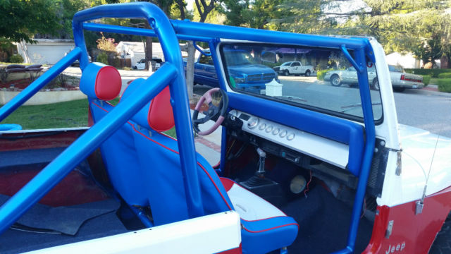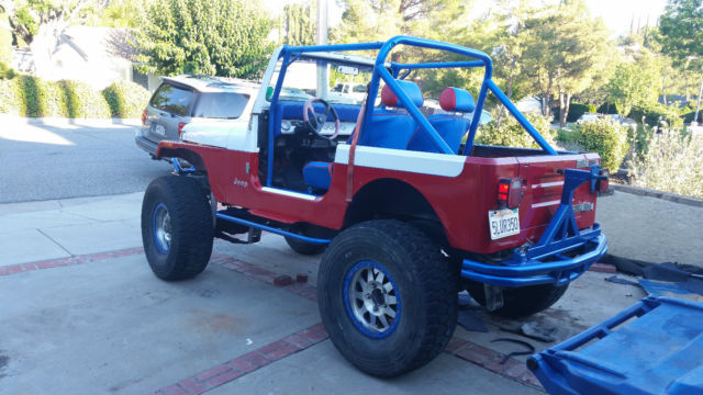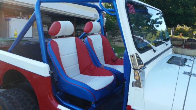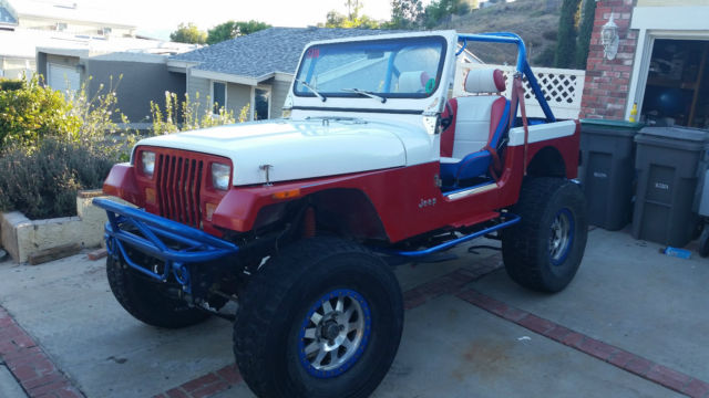 1987 jeep wrangler 37 inch bfg KRTs 17" Method Bead locks Forged Currie Dana 44 axels ARB air lockers with 4.56 gears Atlas Transfer Case 700 R4 Automatic transmission 1992 Chevy 5.7 liter engine BeeCool Aluminum radiator Custom tube front and rear bumpers Beard racing seats ½ hard doors 4 inch fender flares, ot shown Full roll cage in drivers compartment AM / FM Cd B & M shifter Smoked Lexan bikini top Custom Red and White Paint Full size Spare tire Stainless steel dash Autometer Gauges 3 inch spring lift 2 inch shackles 2 inch body Paint is good, ut not perfect, nd there is a small dent, rom hitting a rock on the right front fenders, nd dents where the tires have hit the wheel wells while off road |