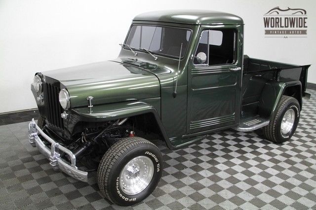 CALL OUR SALES TEAM! 720-457-9145 SPECIFICS / BUILD INFORMATION EXTERIOR: Dark Green Metallic paint with clear coat finish. chrome step sides. 15 inch aluminum rims with staggered BF Goodrich radials. 235/70/15 front and 285/70/15 rear. Pacer aluminum 15 inch rims. Dual exhaust. Wood bed great stance. INTERIOR: black vinyl buckets and carpet make this Willys look great. automatic shifter between the seats. SW gauges, hevy steering column. MECHANICAL: This 49 Willys features a SBC 350 V8 with Edelbrock 4 barrel carb, s well as Edelbrock intake and valve covers. The motor was bored .30 over and has about 5,000 miles on the rebuild according to the previous owner. It has sanderson headers leading to a dual exhaust. This has been converted to 2WD and features a Chevy C10 front suspension with P/S and P/B. The truck drives like a dream. IN FULL DISCLOSURE, HE ITEMS WORTH NOTING INCLUDE:THERE ARE A FEW CHIPS AND IMPERFECTIONS IN THE PAINT (SEE DETAILED PICSGas Gauge is inoperable WORLDWIDE VINTAGE AUTOS (.COM) As one of the largest classic car dealers in the world, e stock over 150 vehicles and are sure to have the car of your dreams. If you do not see the vehicle you want in our inventory, ake sure to sign up for our ‘VIP Buyers List’, ound on the upper right corner of our homepage. FINANCING: WE OFFER FINANCING IN HOUSE! Give us a call on the vehicle of interest and we can have you financed within 48 hours! Most competitive rates! Or go to our website to be pre approved within 90 minutes by clicking on our finance tab. ALTERNATIVE FINANCING: JJ BEST BANC. COLLECTOR CAR FINANCING 800-872-1965 Please mention you are working with Worldwide Vintage Autos in order to expedite the process. LEASING: SHORE AUTO LEASE 732-526-4400 Ask for RON MACCIA SHIPPING: We recommend having our shipping coordinator facilitate the transport of your new vehicle. We can handle all shipping arrangements in-house, o you know where your vehicle is from point ‘A’ to point ‘B’. We highly suggest using only enclosed shipping to protect your investment. We use Central Dispatch and they ensure all carriers are licensed and bonded. INTERNATIONAL BUYERS: We have sold and shipped vehicles all over the world, ith happy customers in Canada, urope, ustralia, ew Zealand, apan, outh America, nd the Middle East, ust to name a few. We can assist with the transport to your home port anywhere in the world, s well as help with the required export/import paperwork. We recommend the following import/export contacts: • Halmari, n Houston, X @ 832-687-3559 • Schumacher Global Transport @ 1-800-599-0190 • ADULTS ONLY car shop in Australia (see website) •• PLEASE READ REGARDING INSPECTIONS •• Inspections are highly recommended. These inspections should be done in person before bidding or placing a deposit. During the inspection process we prefer to work with buyers directly, n lieu of third party inspectors; third party inspectors are typically trained in late model vehicles and their inspection templates do not apply to classic or modified vehicles. If a third party inspection service is used, lease know that we will require a copy of the inspection report before they leave our facility. Please let them know this before ordering your inspection. WWVA salesmen are available six days per week to inspect any vehicle. We have a dedicated, -post lift available to you during your inspection. If you would like to meet an inspector at the dealership we will accommodate both of you. We would love to meet you in person and encourage you to come see the vehicles before you buy! If you cannot meet a salesman during business hours please call the main office, nd one of the owners will meet you Monday through Saturday. Due to our inventory size, e are unable to drive every vehicle for long distances. We also cannot guarantee that every gauge, ight, ption, unction, tc., ill work as it should. We do our best to inspect these vehicles in every detail, nd note any imperfections in the advertisement. We provide around 75 HD images, nd an HD video, n every one of our listings. Very few companies offer this much detail. We spend significant time inspecting and disclosing detailed items on all of our vehicles; however, t the end of the day we are not you... we highly suggest that you come and inspect the vehicle. The information contained in this ad is solely for convenience. The description is an opinion only and should not be considered a complete description of any or all faults; it may not be relied upon nor taken as fact or otherwise a representation or warranty of any sort. Vehicles are sold AS-IS, HERE-IS with all faults known/unknown and with no implied warranty. We do not recommend driving a classic car home. Many classic cars are not driven often and tend to sit for long periods of time making them unsuitable for cross-country road trips. We strongly recommend shipping the vehicle. Unless otherwise noted, e sell our vehicles mileage-exempt, eaning we do not know the actual, riginal miles. The information listed in the ad is based on the current odometer reading or from rebuild information provided by the builder, nd cannot be used as fact. Most of these vehicles do not have Carfax history reports; unless the vehicle is 1981 or newer, Carfax history will not exist. This vehicle is being sold by Worldwide Vintage Autos. All of our prices include a 60 temporary tag plate, brand-new Colorado clear title and VIN verification to ensure no surprises during the registration of your vehicle. We do not charge any additional dealer and handling fees! The vehicle is sold AS-IS, HERE-IS with all faults known or unknown. Please note that the vehicles cannot ship until the first set of documents containing bill of sale, ax exemption form, tc., ave been returned to the dealership. These documents are sent to you immediately after the vehicle has been paid for in full. Vehicle will be ready to ship, nd title will be sent immediately after the 