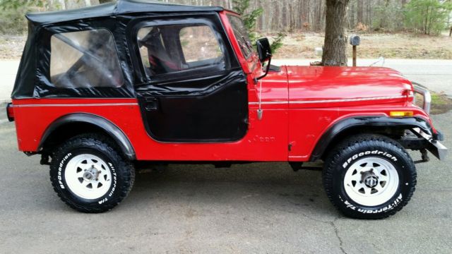 I have a 1981 Jeep CJ-7 up for auction. The Jeep is a daily driver quality CJ-7 with power steering, ilt wheeland power disc brakes. The Jeep has just been serviced from front to back with all fluids checked and topped off if needed. New oil filter and 10w40 Havoline oil. It has a new set of plugs, new valve cover gasket, ew starter, nbsp;new radiator hoses, ew donut gasket and recent carb overhaul. The battery is about ayear old. The Jeep runs, rives and stops as it should with no problems. It has a current Virginia State Inspection good until July 2016. Everything works on the Jeep. The lock-out hubs and transfer case are smooth. 4-wheel drive is smooth with no problems. It has a good set of B.F.Goodrich all terrain T/A's on it. Previous owner had the Jeep painted with some new panels welded in the floor pans and wheel tubs several years ago. The wheel tubs were correct Jeep replacement parts, ut the front floor pans are not original Jeep parts. They are metal that was bent and welded in. Frame has minor rust at rear (see pics). It does have a couple of places that some body filler was used that has cracked (see pics). It has a really good soft top and doors and a bikini top that also comes with it.All seat belts are in the Jeep, ront and back.This Jeep starts the 1st time everytime. It does not leak, attle, ut will smoke a little bluesmoke when you first start it if it sits for several days without driving. The odometer shows 59,161 miles, ut I feel sure it has rolled over, o its probably 159,161. Anyway, t runs good and is just a good, ependable, heap Jeep compared to what some others are selling for on ebay. If you have any questions feel free to shoot me an email, s I check it daily. I have 2 shippers I use and can get the winning bidder a shipping quote if needed. Please look at my feedback here on ebay. I try to be 100% honest on any item I put on here, o bid with confidence. I have had trouble with some bidders with less than 10 feedback scores running the bid up and not completing the deal, o for that reason I ask that anyone with a feedback of less than 10 to please email or call me before you bid or your bid will be cancelled. It costs me money to list the vehicle and if the deal is not completed I have to pay to list it again. Thanks for looking and good luck bidding.On Feb-06-16 at 17:50:04 PST, eller added the following information: I have had a couple of questions about the rust in the Jeep and whats been repaired. Please read the ad and look at the pics. I have described it as best as I can. Yes it has had rust repair and will need some more in the future if you want to restore the Jeep, ut its a running, riving Jeep as is. Turn the key and go, wheel drive works great, lutch is strong, eater fan works, auges work. Good Va. inspection. It could use a new tailpipe, ther than that I know nothing it needs except driving. CLEAR VIRGINIA TITLE