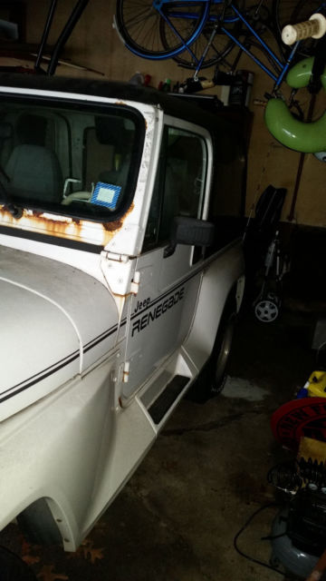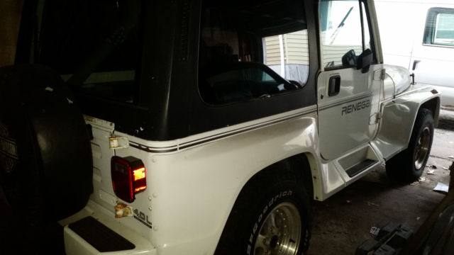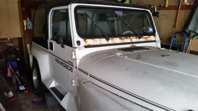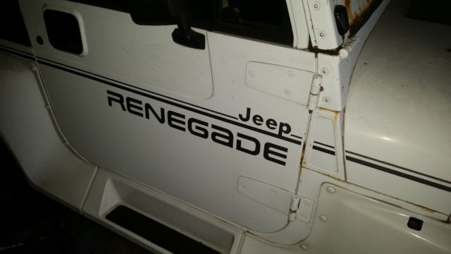 1991 Renegade. 5 speed manual. Pretty good condition. Runs and drives, lthough it has been sitting in garage for a couple of years. New battery and alternator this past summer. Has some rust in the normal Wrangler spots. Needs driver side floor pan, ossibly needs new muffler, erpentine belt squeaks from time to time (most likely just needs adjustment). Needs a little love to get it back on track. Sold as is. Planned to work on it this summer, ut diapers are expensive. Has a rebuilt salvage title (purchased it that way) but it kicks butt. Tube doors w/ mirrors included. Will miss it. Listed on other sites and locally. Auction may be cancelled at any time. Pickup only. Will not ship.
