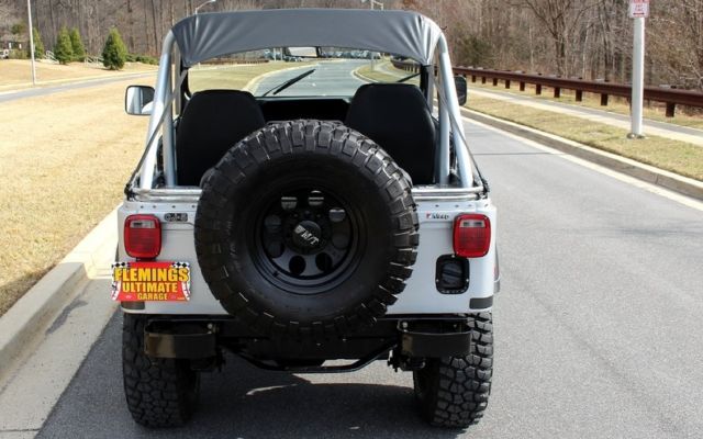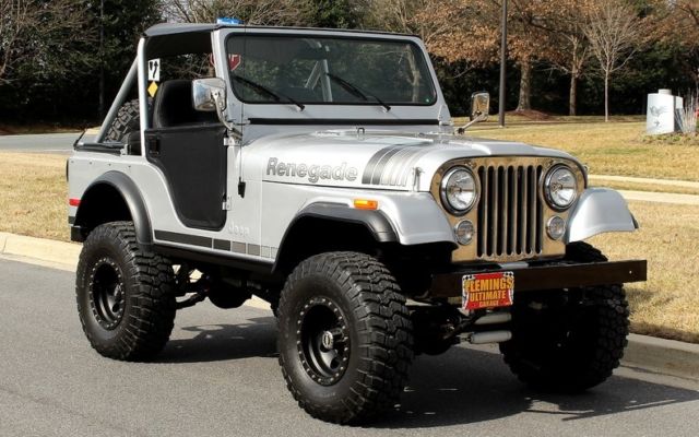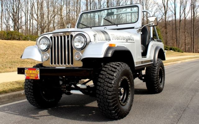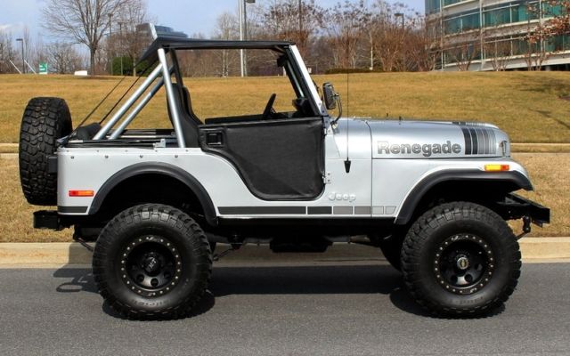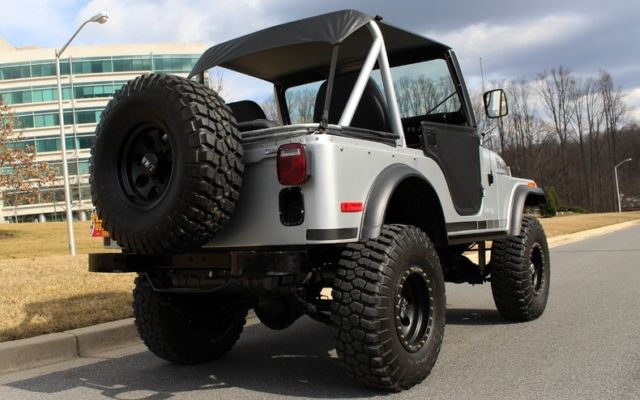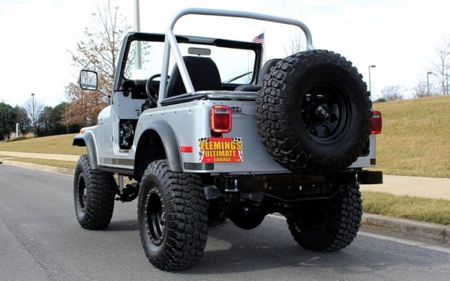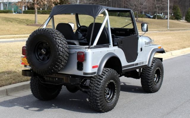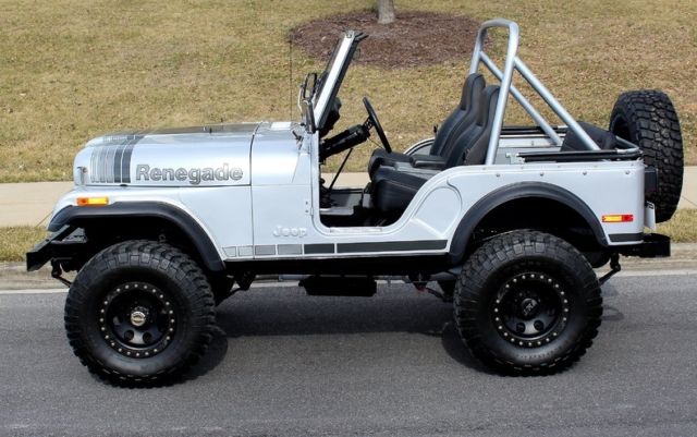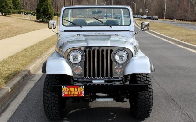 | '79 JEEP CJ5 4X4 PRO-TOURING • Professional no expense spared restoration of this legendary Trail Blazin' CJ-5 • Upgraded AMC 304cid conversion V-8 • Heavy Duty 3-speed manual transmission • Heavy Duty Front and Rear differentials • Custom 5" lift kit including new shocks body bushings steering linkage + front sway bar • Mirror finished Arrowhead Silver paint w/ Renegade call outs show waxed and detailed • New Black "Bikini Top" convertible top • New Black bucket seat interior with full custom Roll bars and center console • Full factory gauges including 85MPH Speedo • Custom Black 3-piece steering wheel • Upgraded Kenwood AM/FM/CD/AUX/USB digital sound with Kicker Hi-Fi speakers • Optional power steering & Disc Brakes • Heavy Duty 15" MT Black Bead-lock Alloys with BF Goodrich Mud-Terrain T/As • Custom Header back dual exhaust system • Classic styling Collectable and just fun to drive |