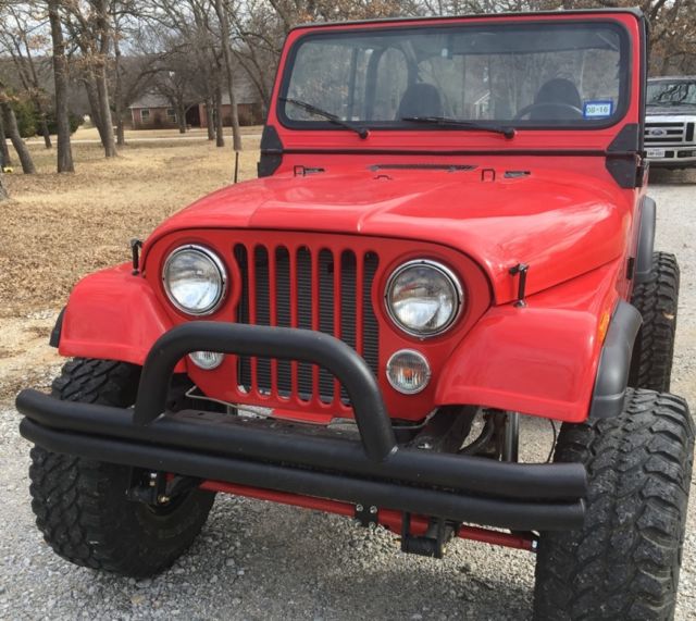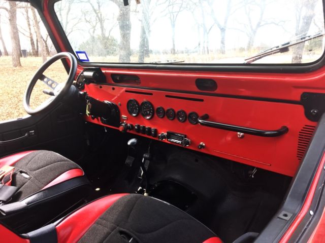 Frame off restoration, started with a 1992 Jeep YJ. The front fenders, front clip, and tailgate were replaced with those from a CJ7. Body was blasted, primed, and painted. Complete underbody, interior, and under fenders are rhino lined. Engine was replaced with 2004 GM V8 5.3 Vortec and mating 4L60E automatic transmission. Custom metal dash and complete new painless performance body wiring harness. Jeep runs excellent, street legal, and has been garage kept. 2004 GM 5.3L Vortec Engine Novak Engine Mounts Magnaflow exhaust 2004 4L60E Automatic Transmission (rebuilt at time of swap) Lokar Shifter NP241C Transfer Case, cable shifter Woodys drive shafts and u joints Ford 8.8 rear axle, 4.10 gearing Dana 30 front axle, 4.10 gearing Bilstein Shocks New Factory springs, spring over axle lift Pro Comp 35x12.5xR15 tires and wheels Custom metal dash Painless Performance body harness Classic Instruments gages All new lights and markers Mastercraft Seats Retro Sound radio, new speakers and amplifier Complete and convertible soft top Bed pan was cut out and replaced with diamond plate steel Comes with a rear seat, however it is not mastercraft, needs a matching cover. Call or Text 817-718-5645 with any questions. Located in Decatur TX, will trailer deliver for fee |