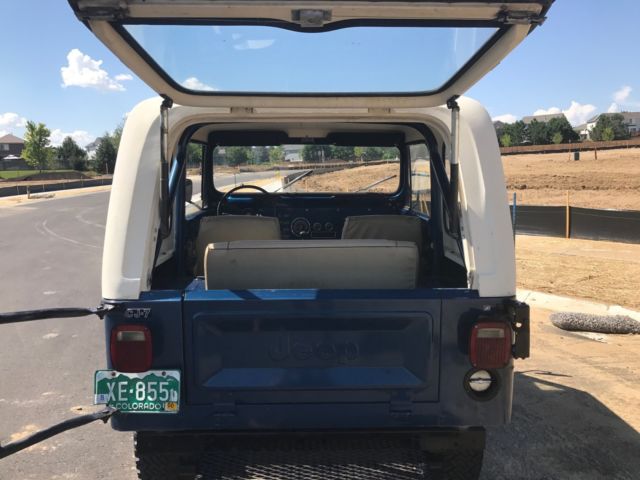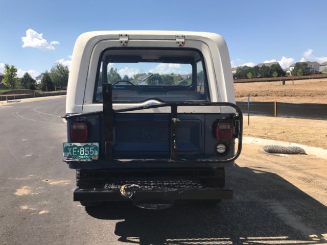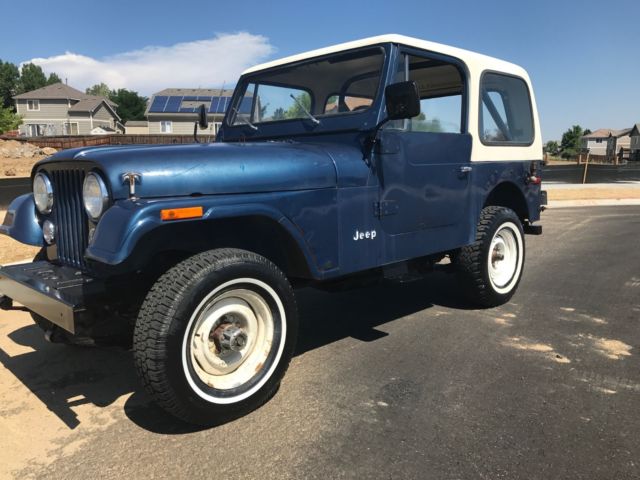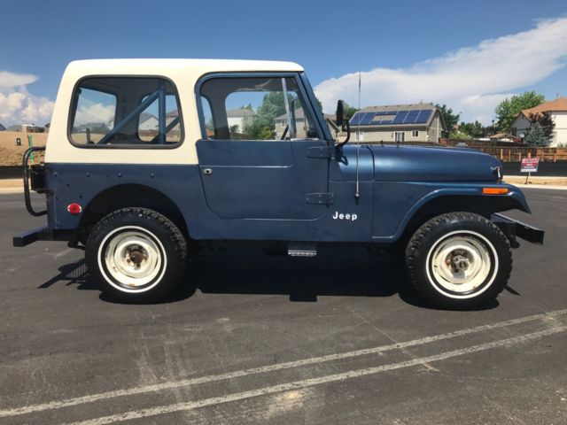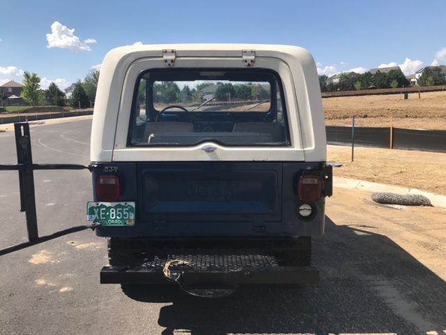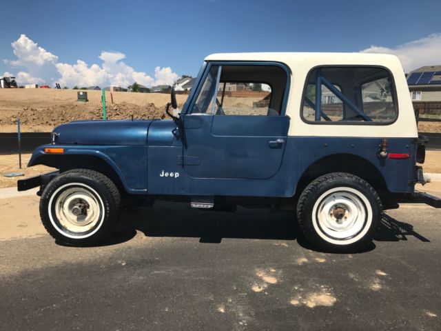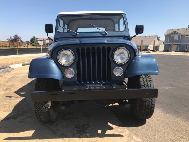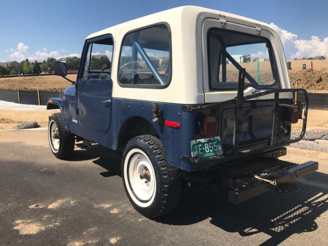 SELLING A 1 OWNER 1977 CJ-7 JEEP WITH ONLY 23,439 MILES ON IT. PRETTY COOL TO OWN A JEEP FROM THE 1ST OWNER WITH THE LOW MILEAGE. THIS JEEP WAS BOUGHT NEW FROM SOUTHERN COLORADO ON 11/15/1976 AND I HAVE THE ORIGINAL TITLE WITH THAT DATE ON IT. HE DROVE MOSTLY FROM 1976 UNTIL 1979 AND THEN IT SAT MOST OF THE TIME. HE DID NOT DRIVE IT MUCH IN THE 1980'S AND IT HAS SAT SINCE 1990. HE DID GET NEW TAGS IN 1999 BUT IT DID NOT RUN. ONE OF HIS GRAND KIDS HELPED ME WITH THE PURCHASE OF THIS JEEP. I HAD TO DRAIN THE ENTIRE FUEL SYSTEM TO GET IT RUNNING WITH FRESH FUEL. THAT WAS THE TRICK TO IT. I CLEANED THE CARBURETOR AND DEGREASED THE ENGINE AND IT RUNS GREAT !! I HAVE DROVE IT IN THE LAST WEEK 287 MILES AND HAD NO PROBLEMS. I DID A BASIC TUNE UP WITH WIRES,PLUGS,CAP AND ROTOR. A FRESH OIL CHANGE WITH FILTE, FUEL FILTER & FUEL PUMP . ALSO BOTH DIFFS HAVE FRESH FLUID IN THE ALSO. IT HAS FRESH COOLANT IN IT ALSO. IT RUNS AT 60 MPH WITH NO ISSUES. I HAVE A NEW RIGHT OUTSIDE DOOR HANDLE COMING AND NEW INSIDE WINDOW CRANK HANDLE THAT I WILL INSTALL. I ASK ABOUT THE 3 HOLES ON THE RIGHT QUARTER PANEL TO SEE IF THERE WAS A SPARE TIRE CARRIER MOUNTED THERE BUT THE GRAND KID HAD NO CLUE AND THE ORIGINAL OWNER MEMORY IS NOT ALL THERE. HE HAD A AFTERMARKET TRAILER PLATFORM AND A SPARE TIRE CARRIES ADDED. ALL LIGHTS WORK ON THE JEEP IN AND OUT EXCEPT FOR THE OIL GAUGE LIGHT..ALL GAUGES WORK BUT THE FUEL GAUGE HAS A MIND OF ITS OWN. IT HAS THE 4 SPEED TRANNY WITH THE 4.2 ENGINE.THIS IS ONLY A 1 BARREL CARBURETOR. THE JEEP STILL RETAINS THE ORIGINAL SEAT BELTS AND RADIATOR. 4WD AND HORN WORK AS IT SHOULD. THE TURN SIGNALS WORK ALSO. THE JEEP IS LOCATED IN THE DENVER COLORADO AREA. IF YOU ARE LOCAL PLEASE COME LOOK AT IT.IF THE WINNING BIDDER IS FROM OUT OF STATE I WOULD HAUL IT BACK HOME. I THINK IT WOULD MAKE IT BUT IT IS 40 YEARS OLD. THE PAINT CODE IS 7 K MIDNIGHT BLUE. I CAN HELP WITH YOUR TRANSPORT NEEDS ALSO. IF YOU HAVE UNDER 10 BIDS PLEASE CONTACT ME BEFORE BIDDING. IF YOU HAVE ANY QUESTIONS OR YOU WANT MORE PICTURES PLEASE ASK !On Jul-23-17 at 15:08:41 PDT, seller added the following information: i have more pictures but i could only put up 24...the rear seat is in great shape but front seats will need to be redone....all body mounts are in great shape and all floorboard sheet metal has no rust...the pictures speak for this classic jeep...if you want certain pictures let me know!